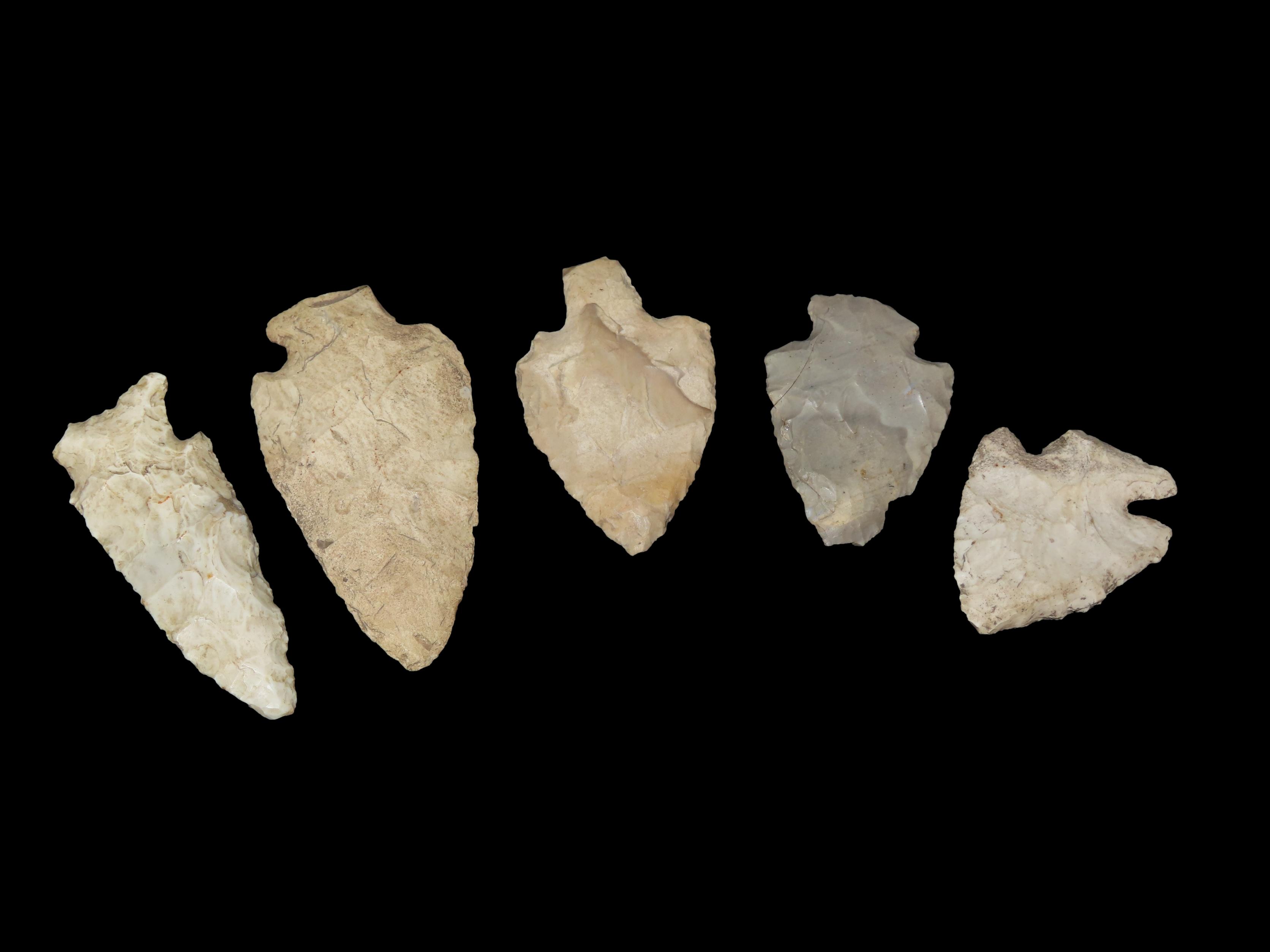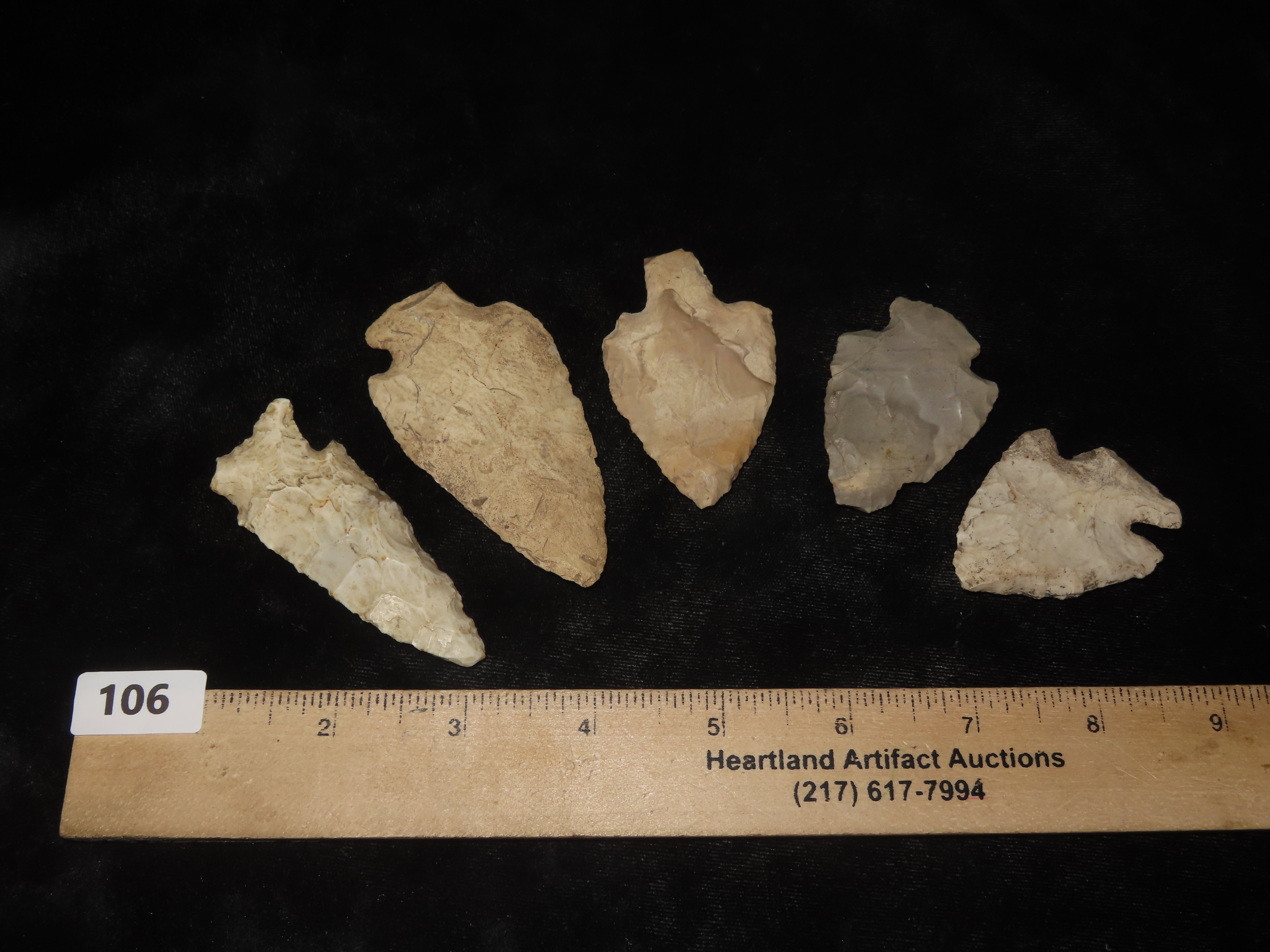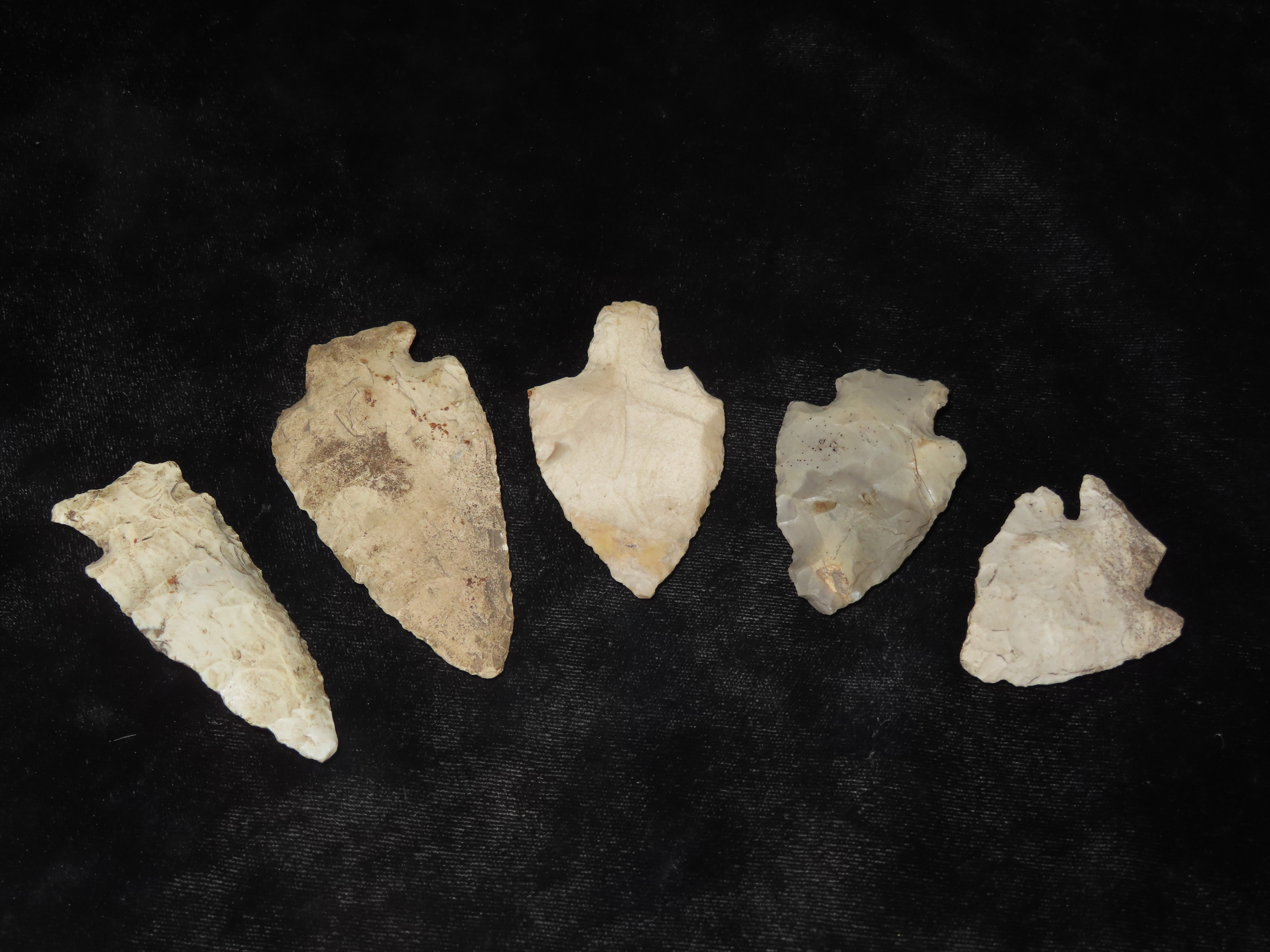 Grouping of 5 Arrowheads Found by Walter Johnson in Seneca, Illinois, Across From Skrivany Funeral Home