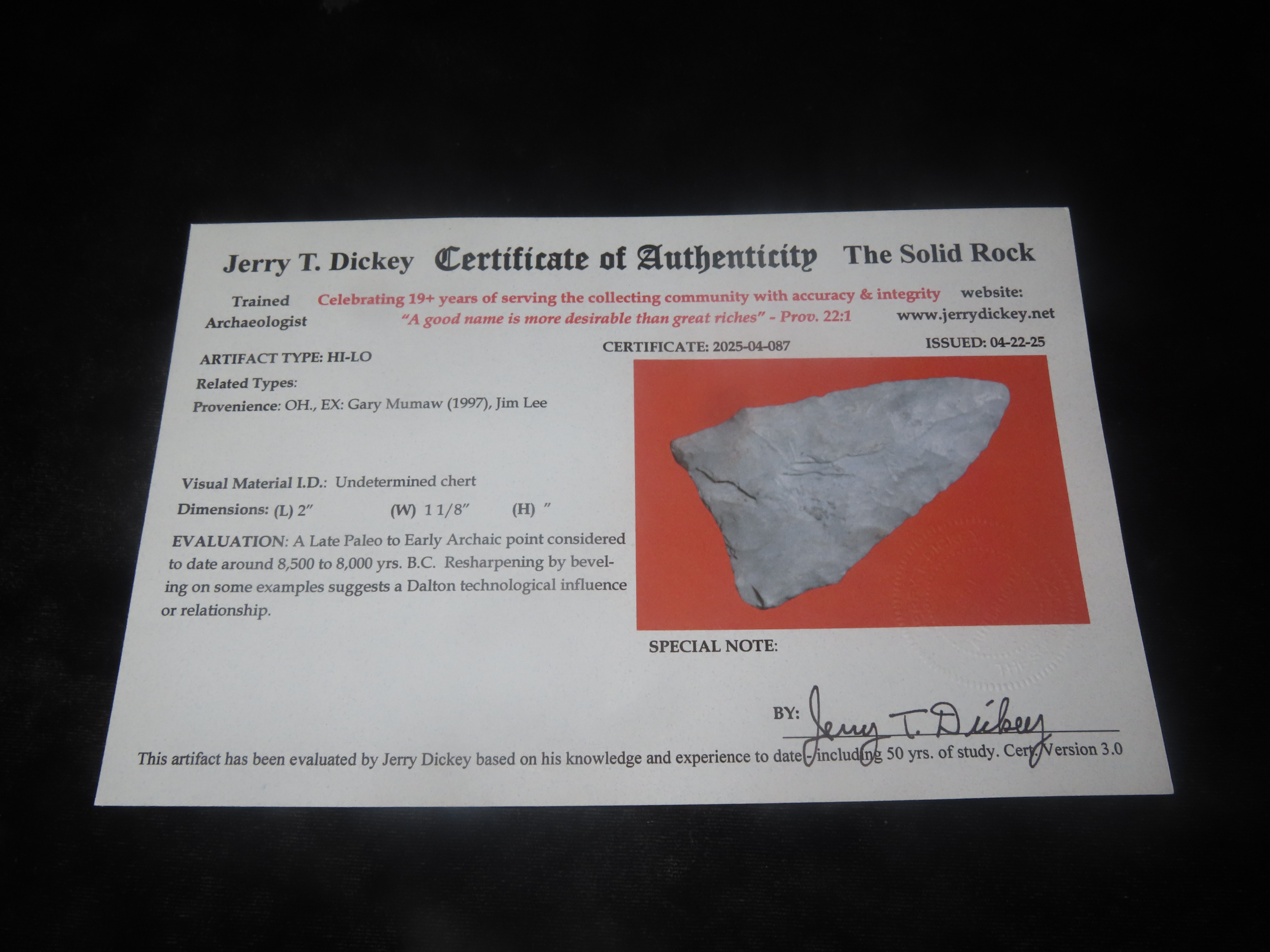 2″ X 1 1/8″ HI-LO, Dickey COA, Found in OH., Ex Gary Mumaw (1997), Ex Jim Lee