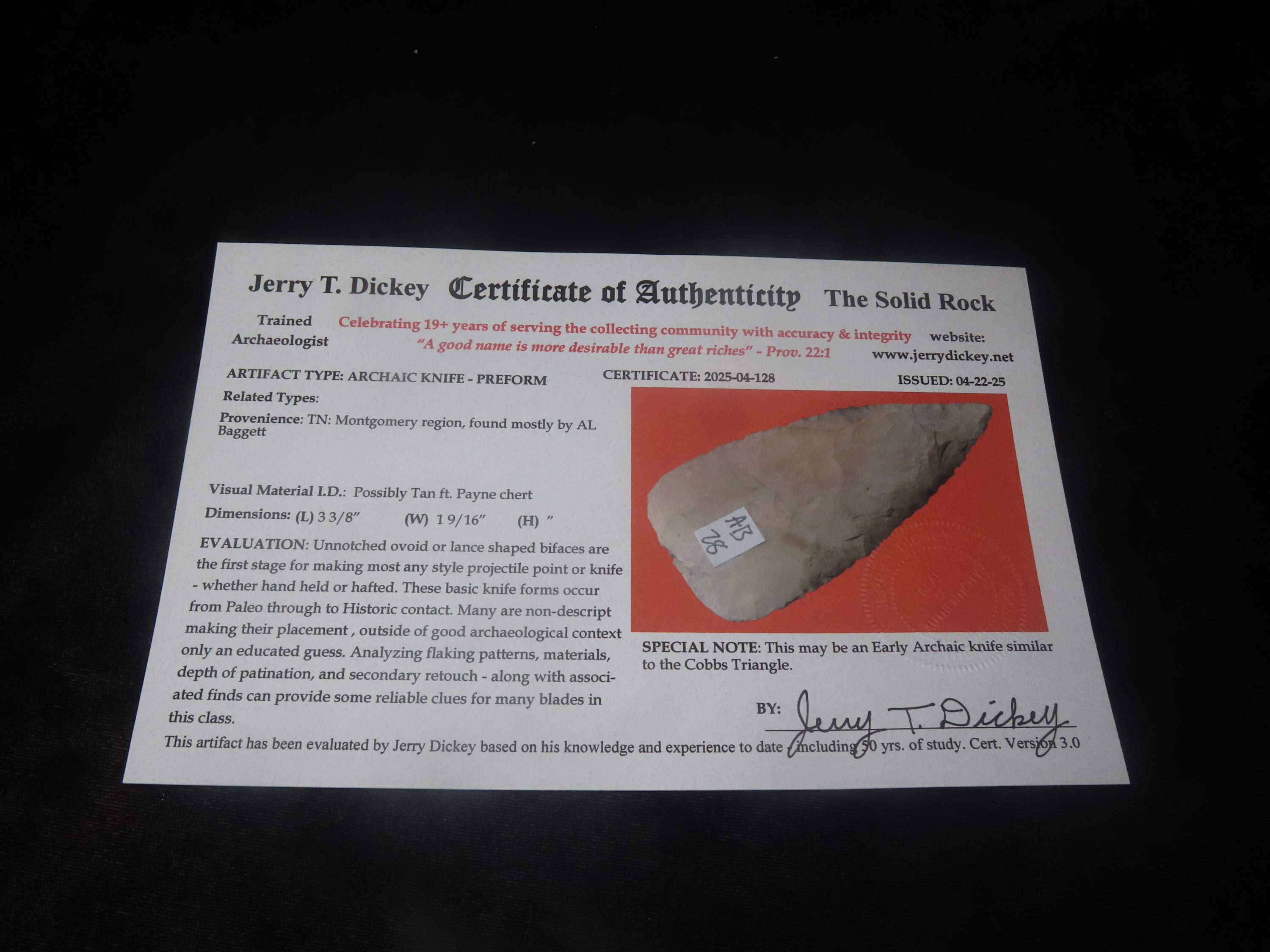 3 3/8″ X 1 9/16″ Archaic Knife – Prefrom, Dickey COA, Found in Montgomery Co. TN, Found by Al Baggett