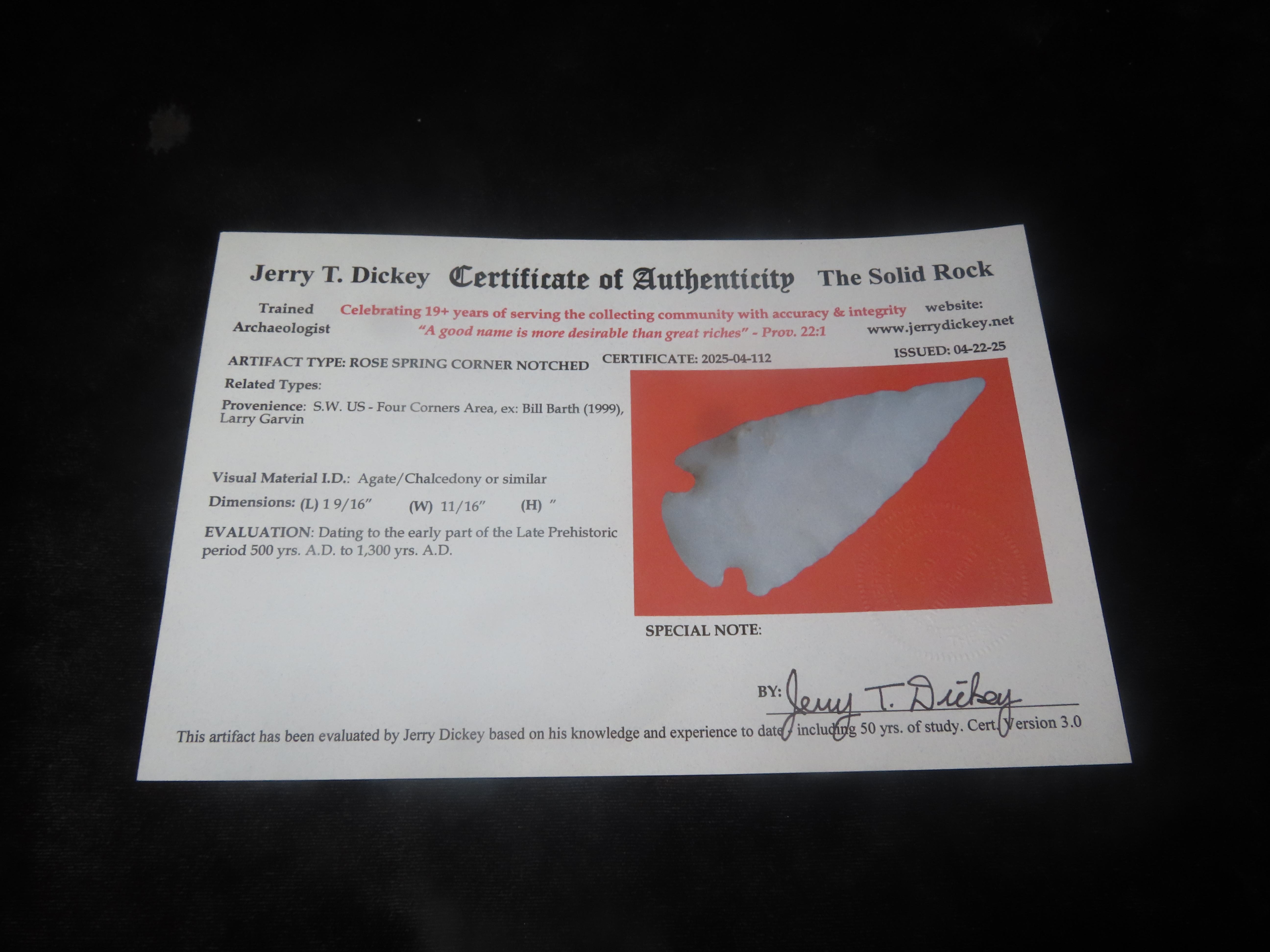 1 9/16″ X 11/16″ Rose Spring Corner Notch, Dickey COA, Found in Southwest US Four Corners Area, Ex Bill Barth (1999)
