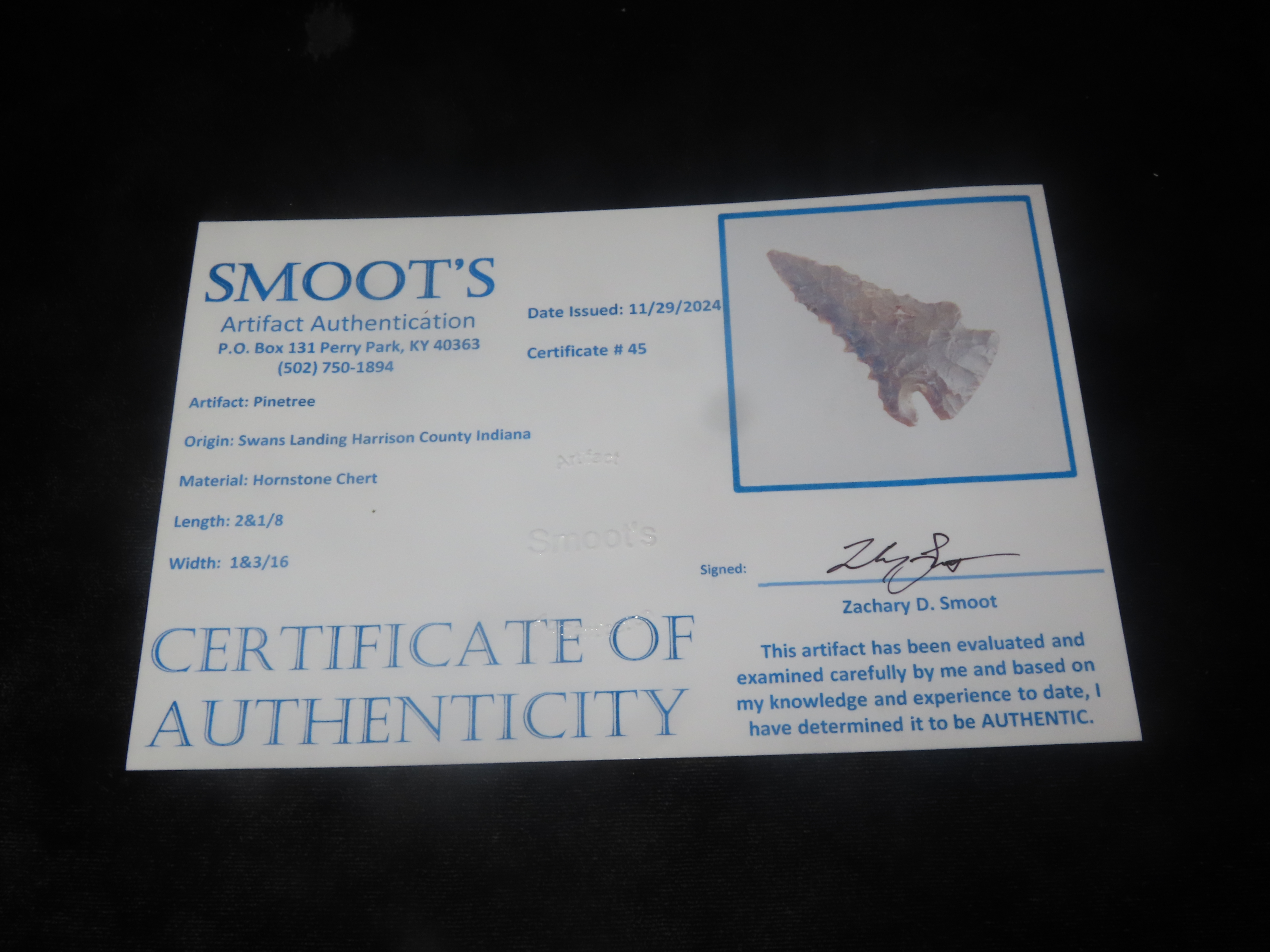 2 1/8″ X 1 3/16″ Pinetree, Smoot COA, Found in Swans Landing Harrison Co. Indiana