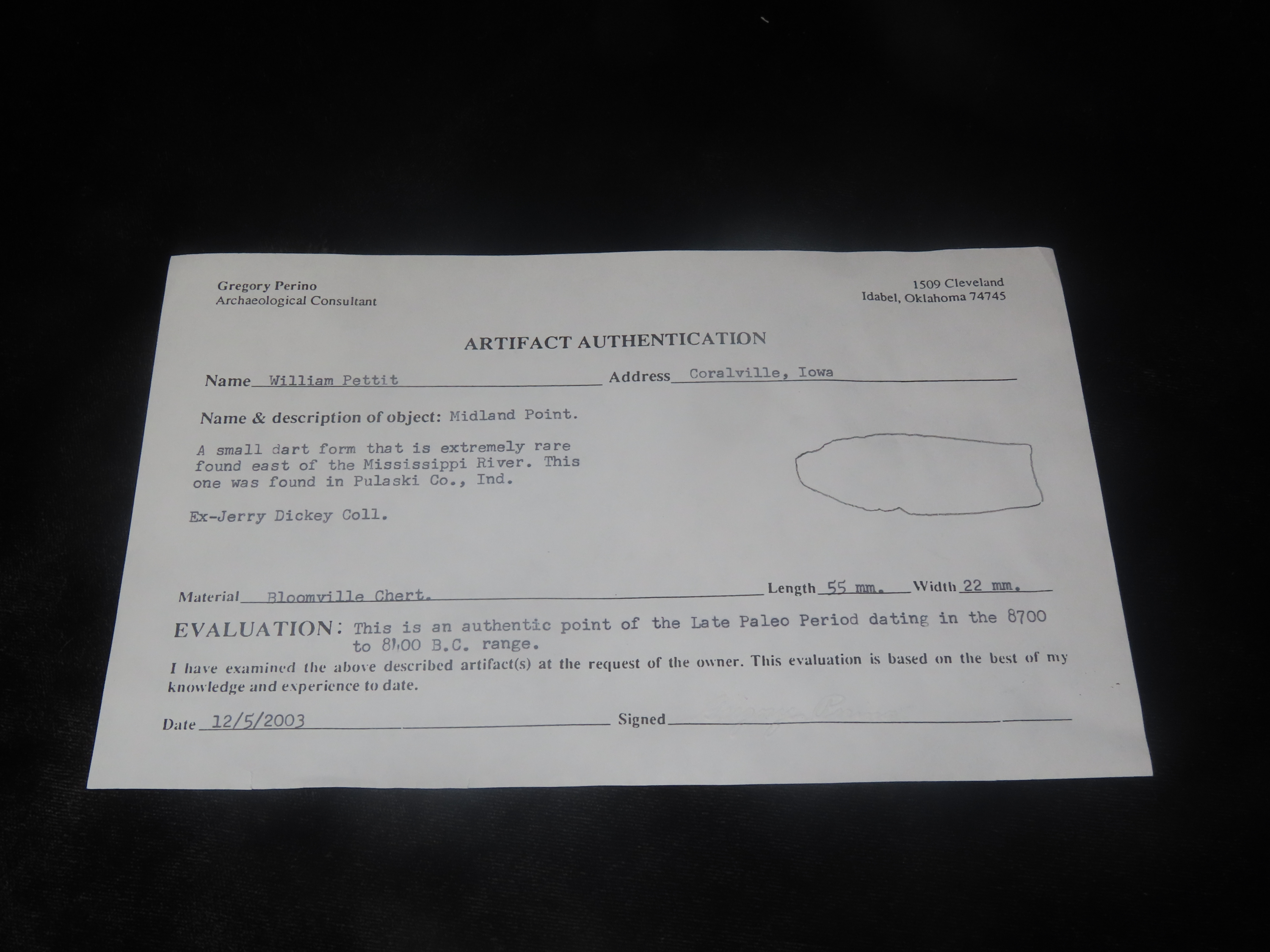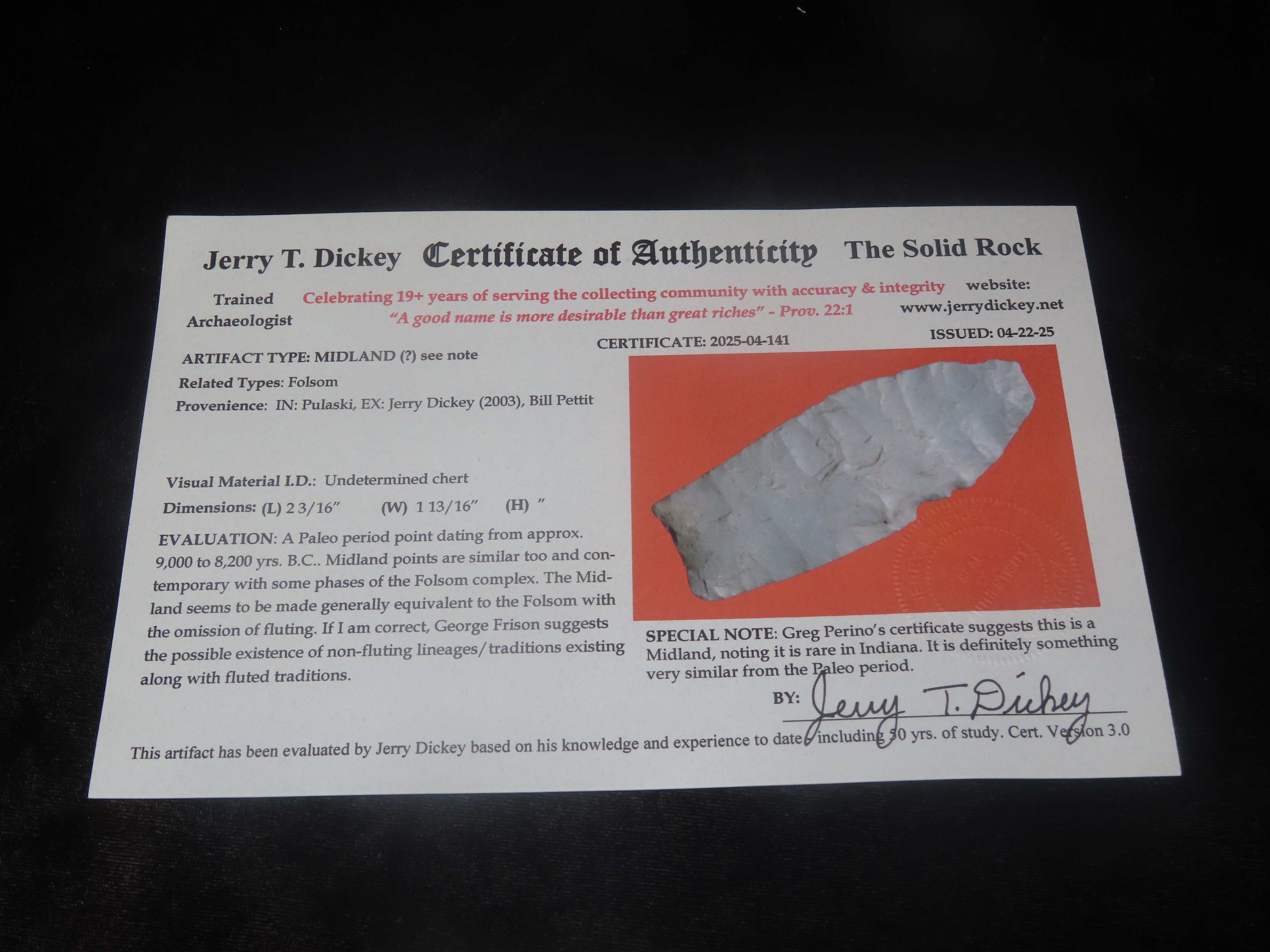 2 3/16″ X 1 13/16″ Midland, Dickey/ Perino COA, Found in Pulaski Co. Indiana, Ex Jerry Dickey (2003), Ex Bill Pettit