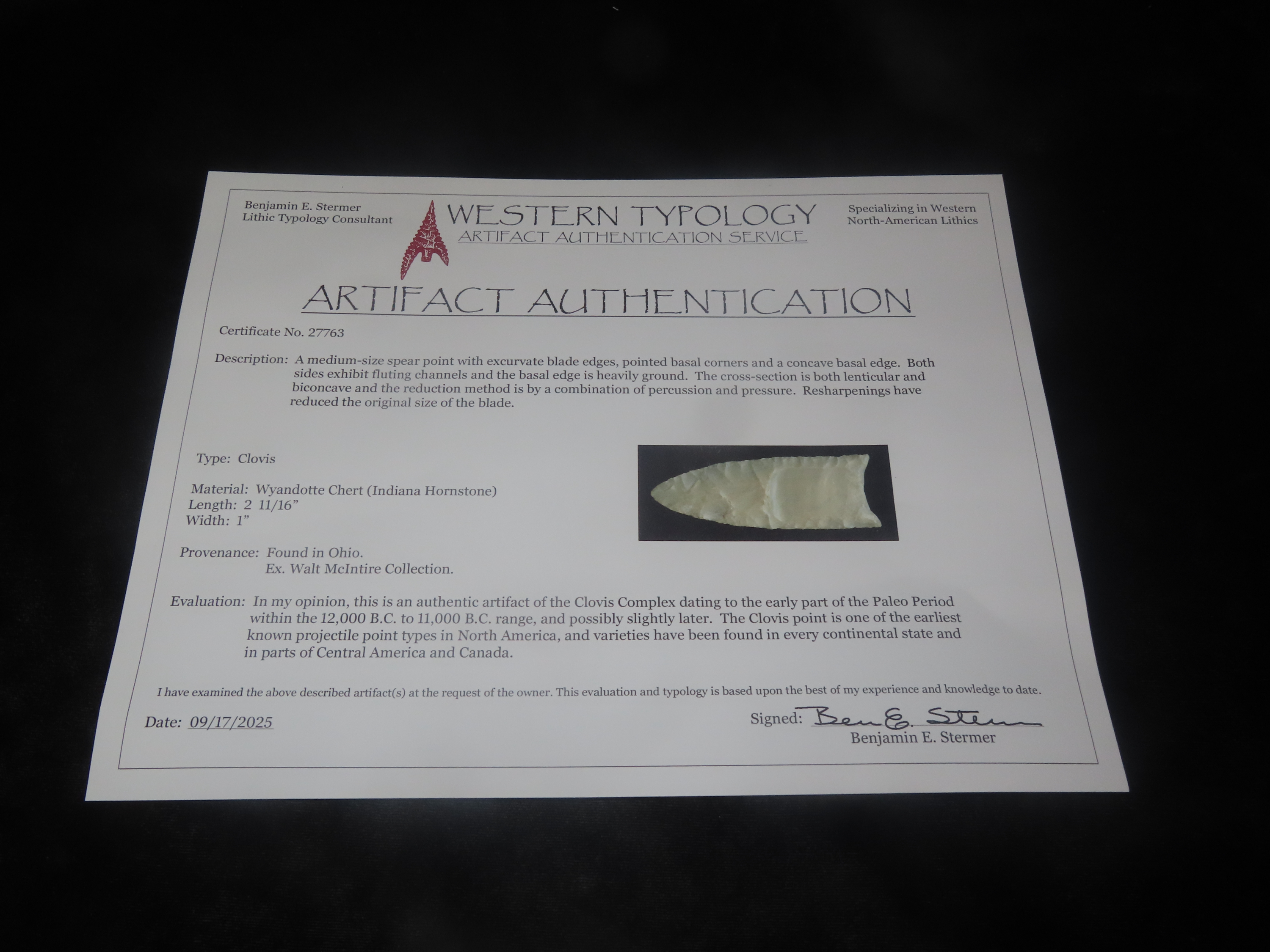 2 11/16″ X 1″ Clovis, Stermer COA, Found in Ohio, Ex Walt Mclntire