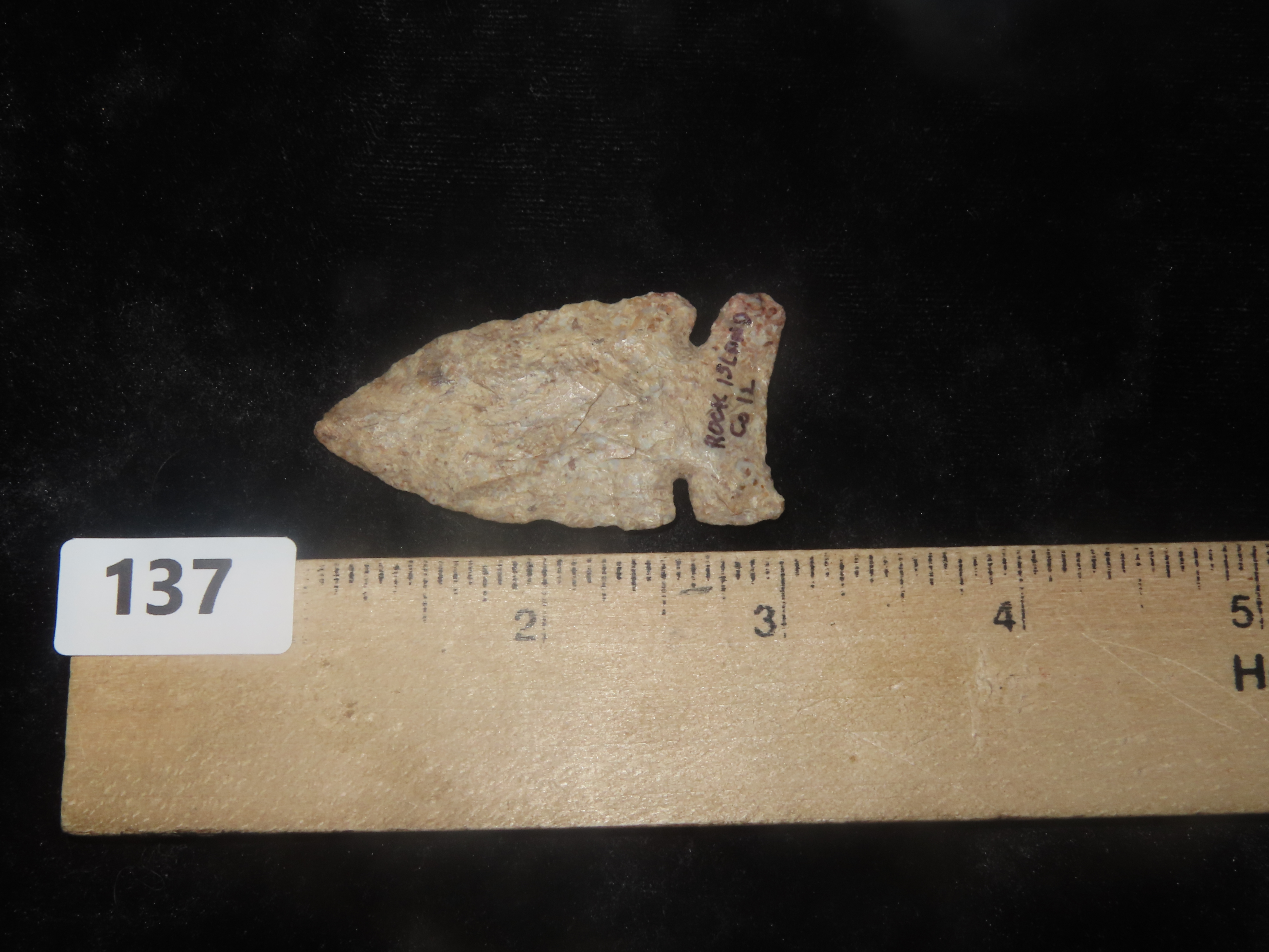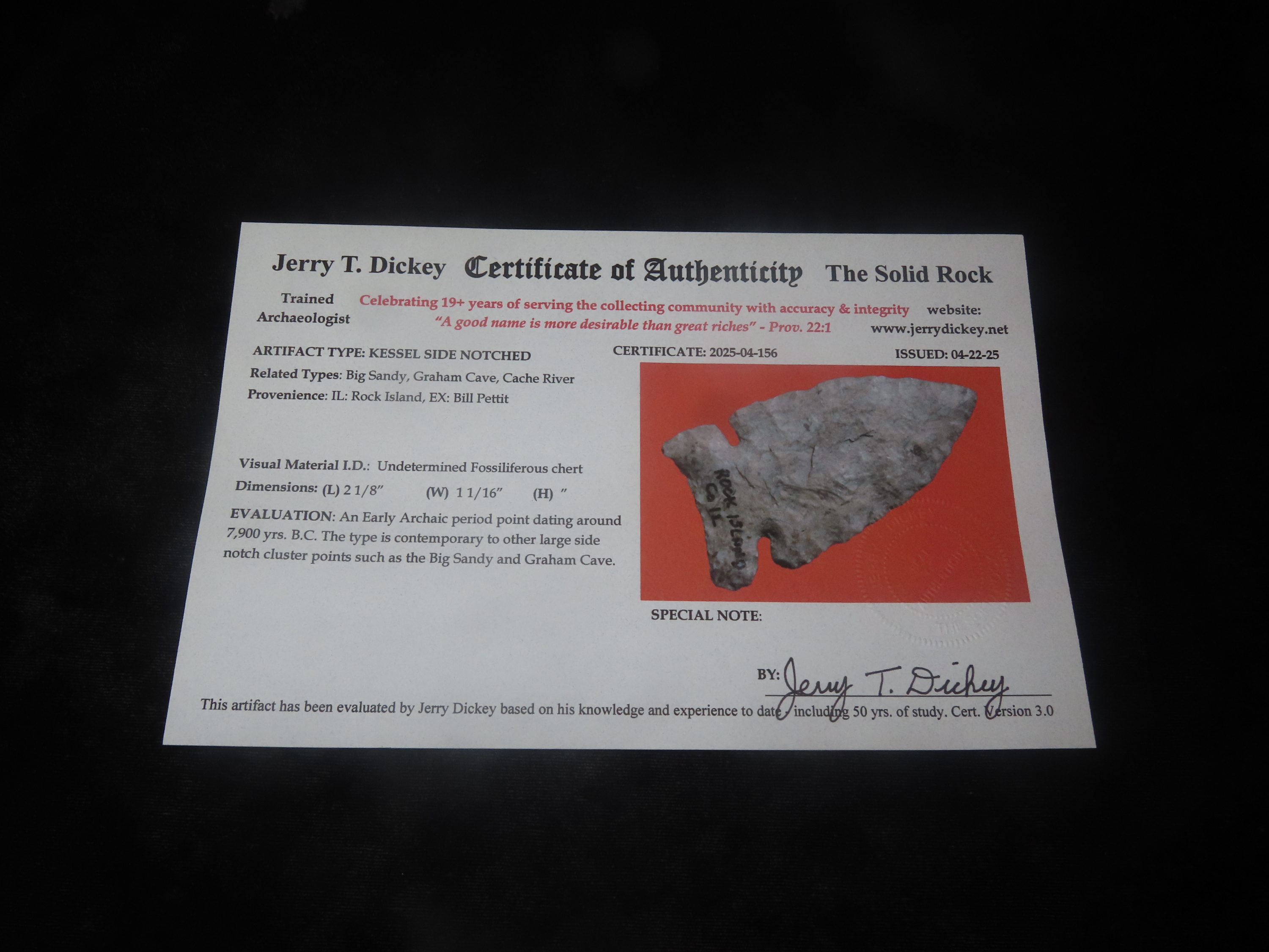 2 1/8″ X 1 /16″ Kessel Side Notched, Dickey COA, Found in Rock Island Co. Illinois, Ex Bill Pettit