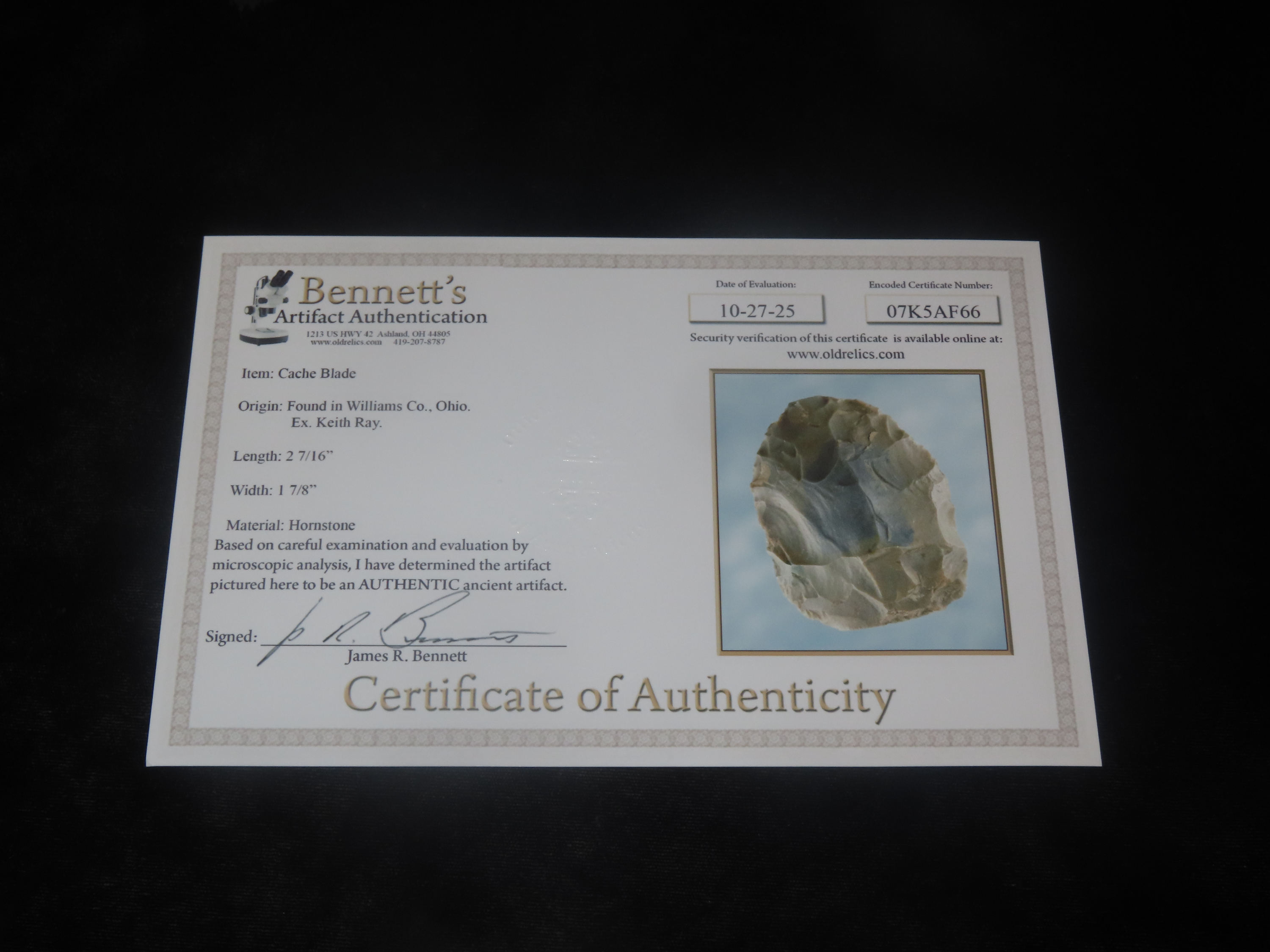 2 7/16" X 1 7/8" Cache Blade, Bennett COA, Found in Williams Co. Ohio, Ex Keith Ray