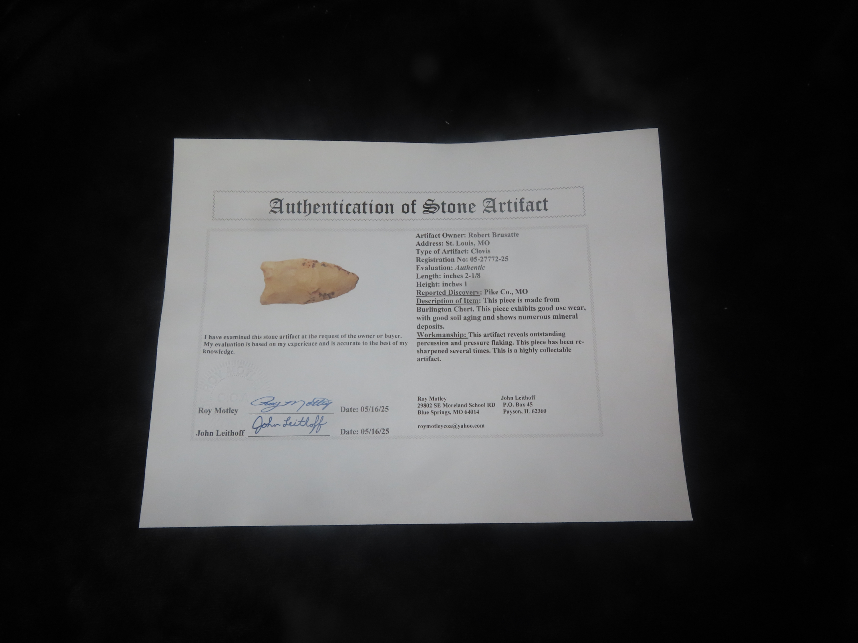 2 1/8″ x 1″ Clovis, Motley COA, found in Pike Co., Missouri, Ex Robert Brusatte Collection