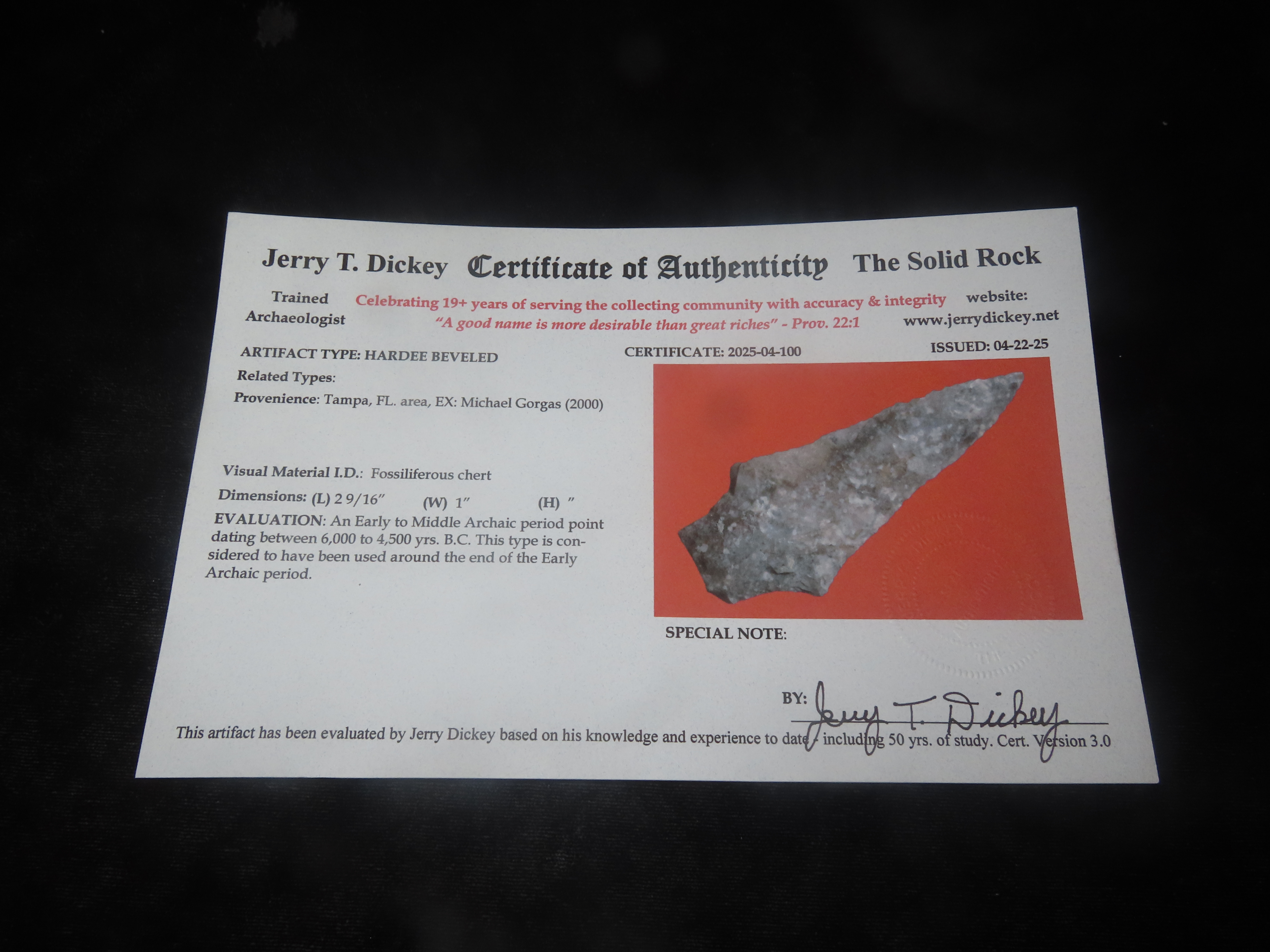 2 9/16″ x 1″ Hardee Beveled, Dickey COA, found in Tampa Florida Area Ex Michael Gorgas Collection