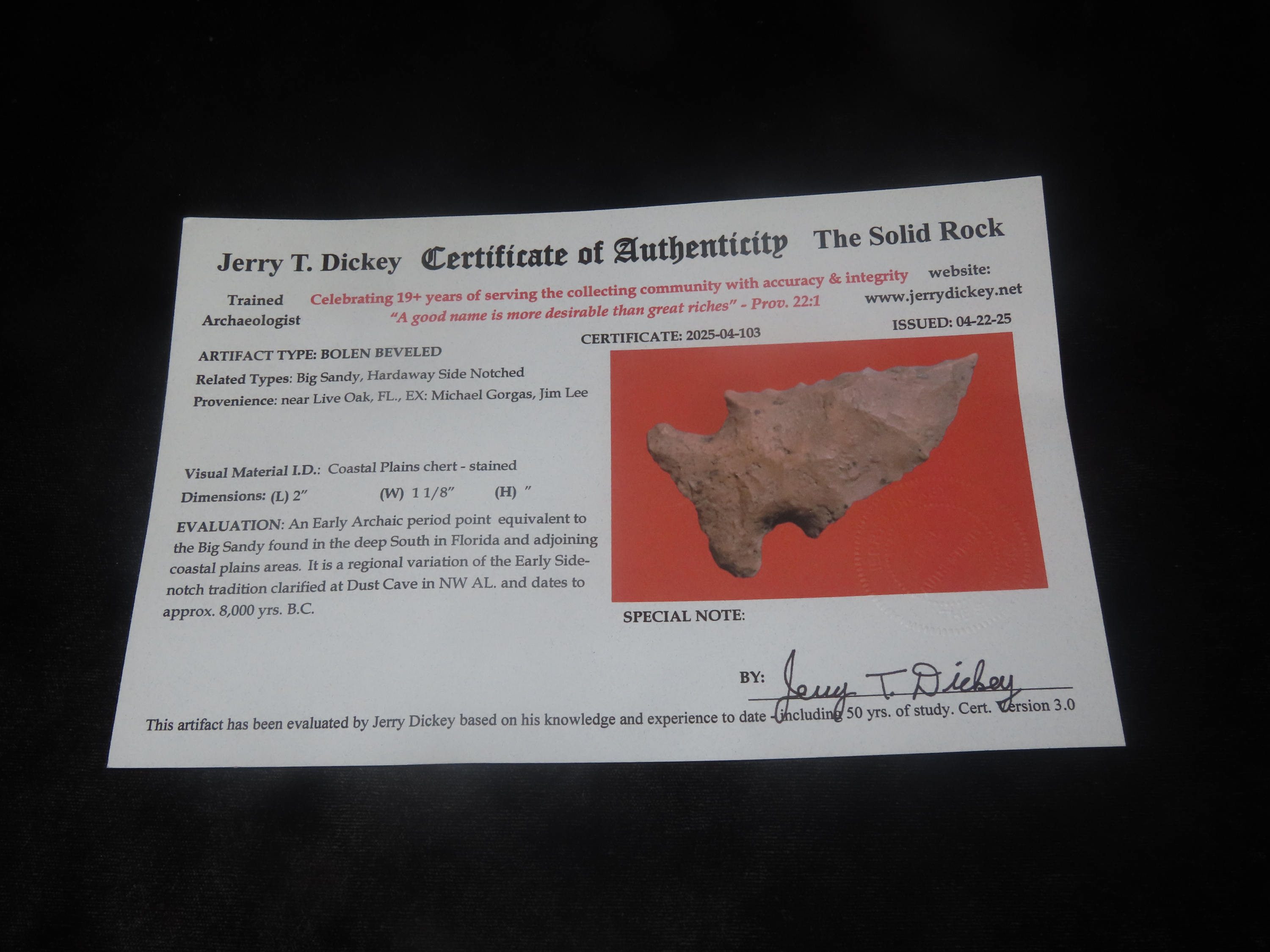 2″x 11/8′ Bolen Beveled, Dickey COA, found in Live Oak FL, Ex: Michael Gorgas, Jim Lee Collections