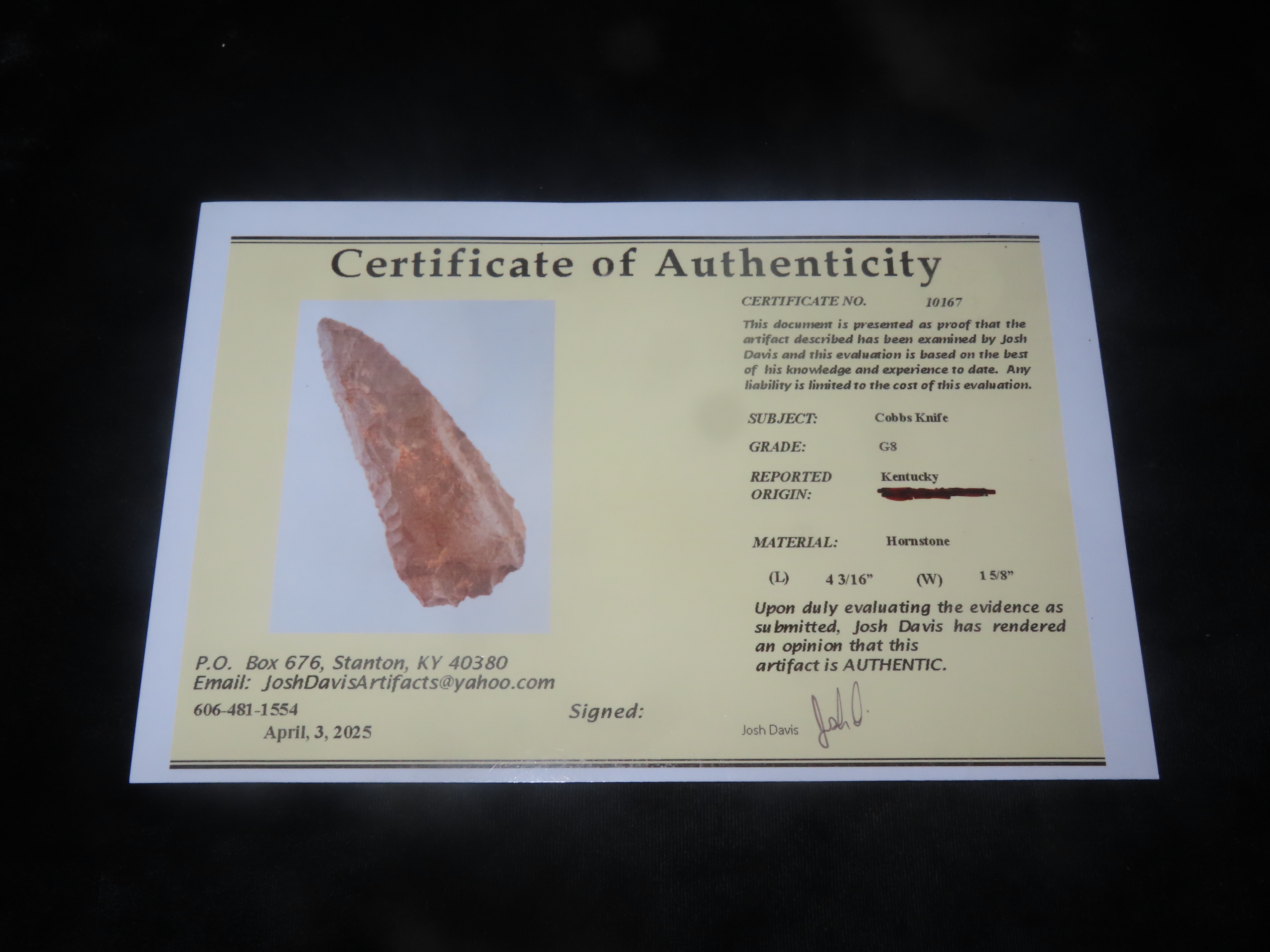 4 3/16″ x 1 5/8″ Cobbs Knife, Davis COA, found in Kentucky