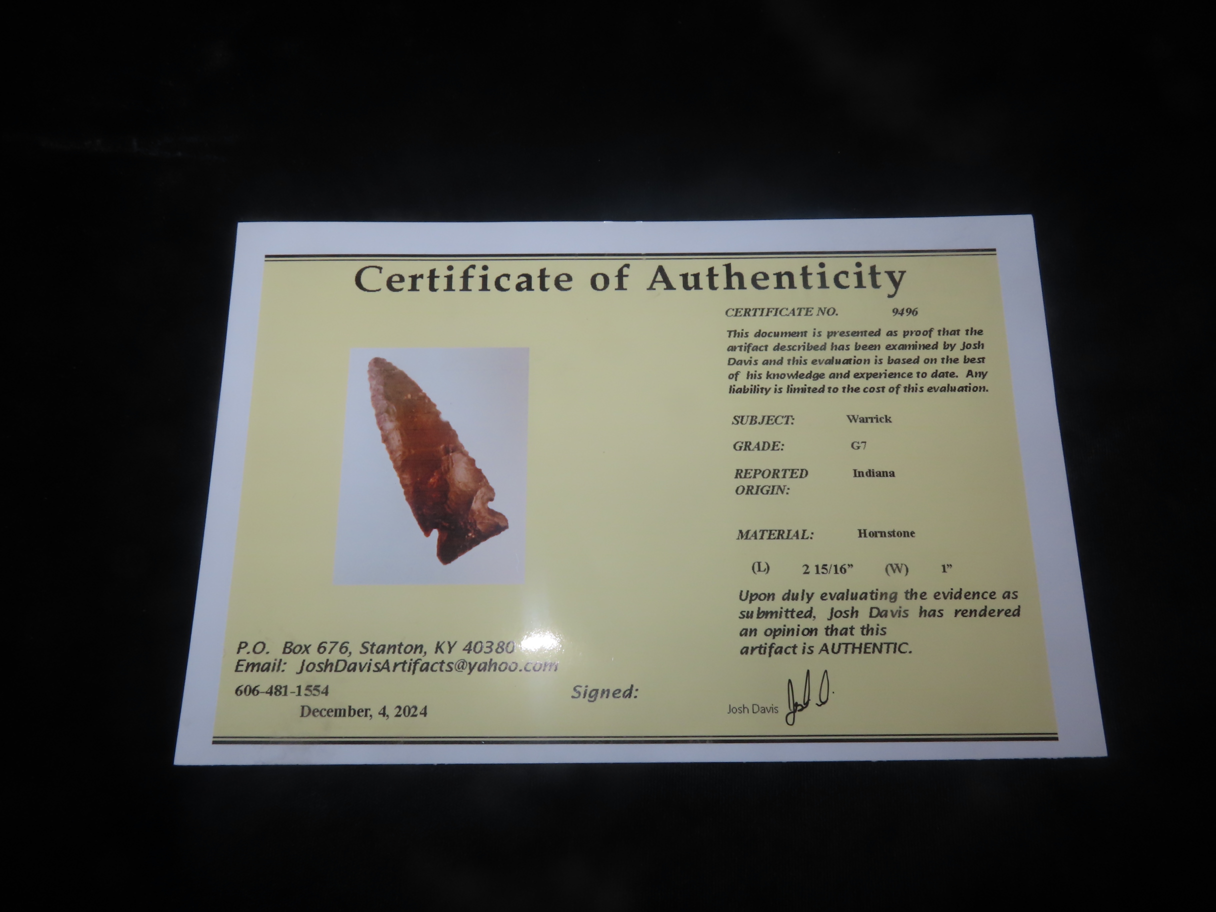 2 15/16" x 1" Warrick, Davis COA, found in Indiana