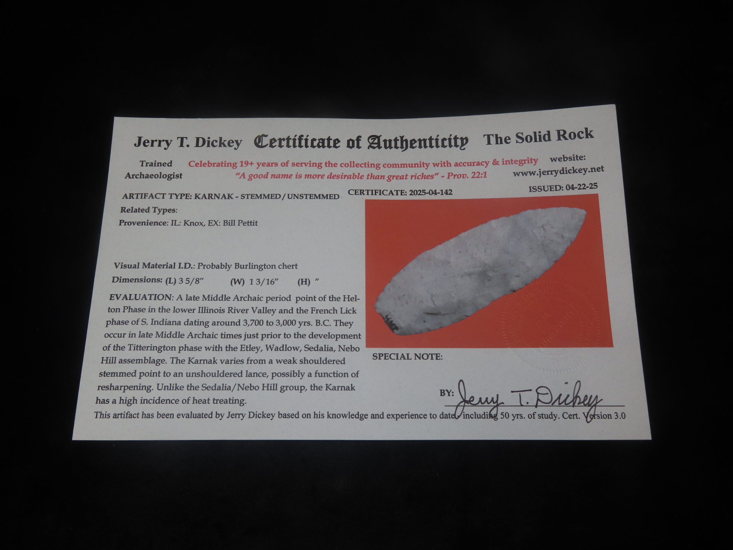 3 5/8″ x 1 3/16″ Karnak, Dickey COA, found in Knox Co., Illinois, Ex Bill Pettit