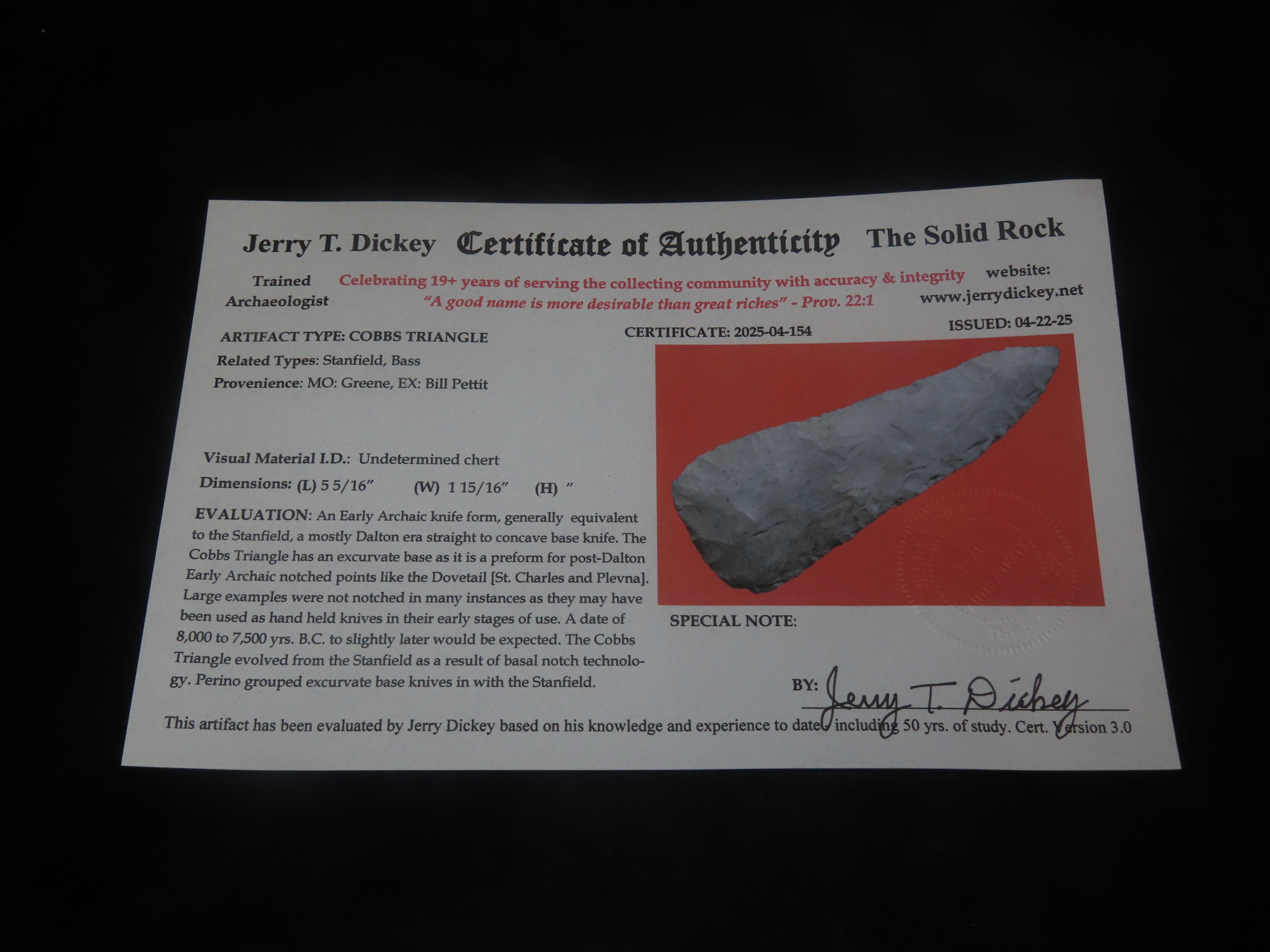 5 5/16″ x 1 15/16″ Cobbs Triangle, Dickey COA, found in Greene Co., Missouri, Ex Bill Pettit Collection