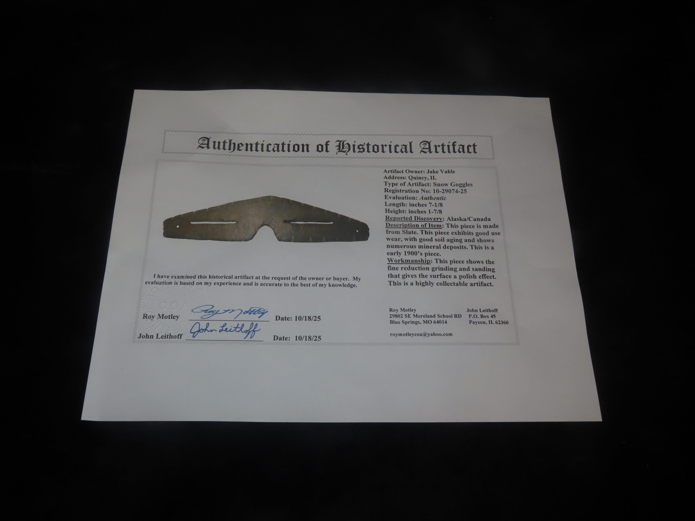 7 1/8″ x 1 7/8″ Slate Snow “Goggles” Eye Protection, Motley COA, from Alaska/Canada