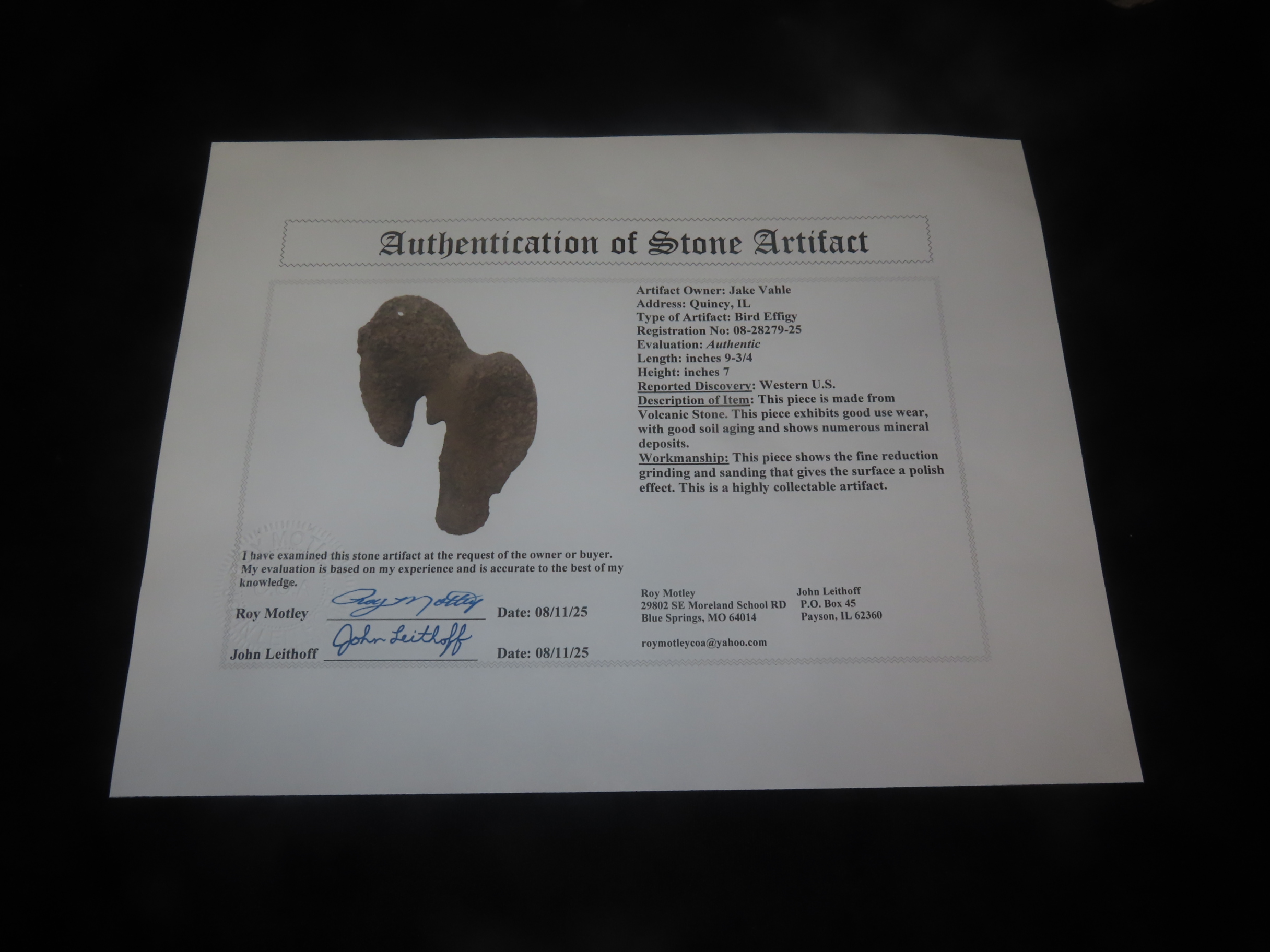 9 3/4″ X 7″ Volcanic Stone Bird Effigy, Motley COA, found in Western United States