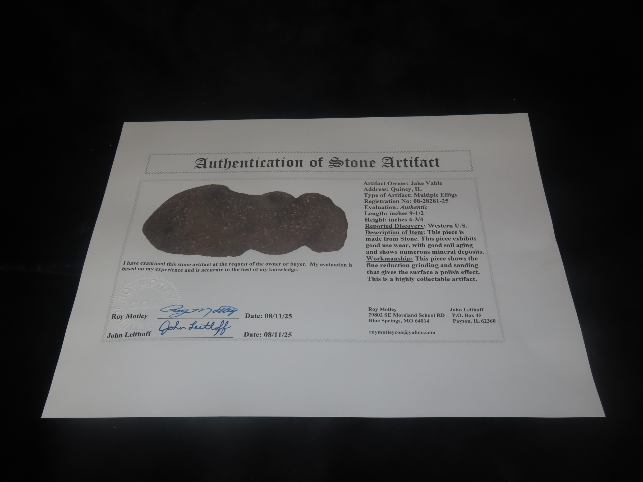 9 1/2" x 4 3/4" Volcanic Multiple Effigy, Motley COA, found in Western United States