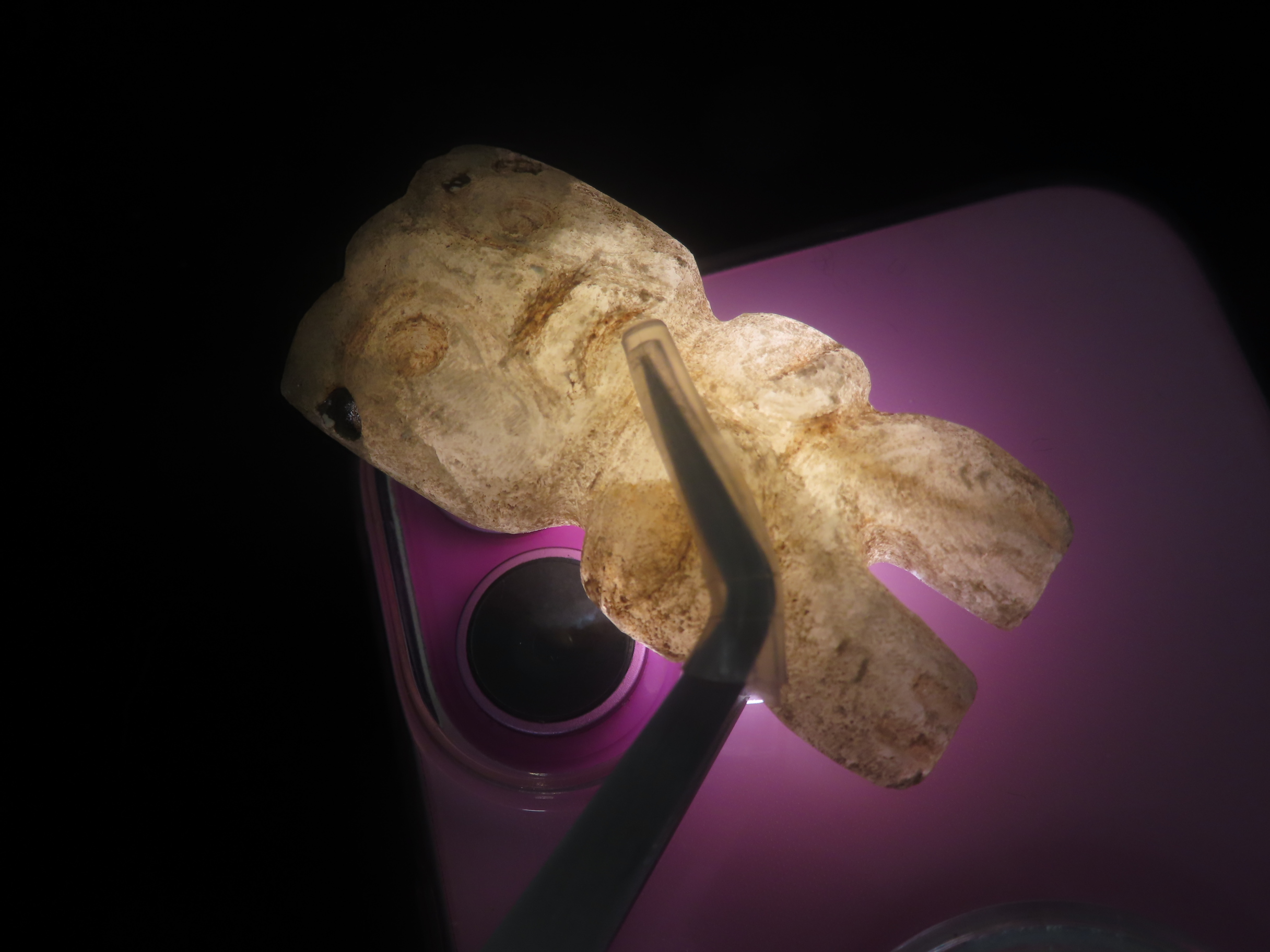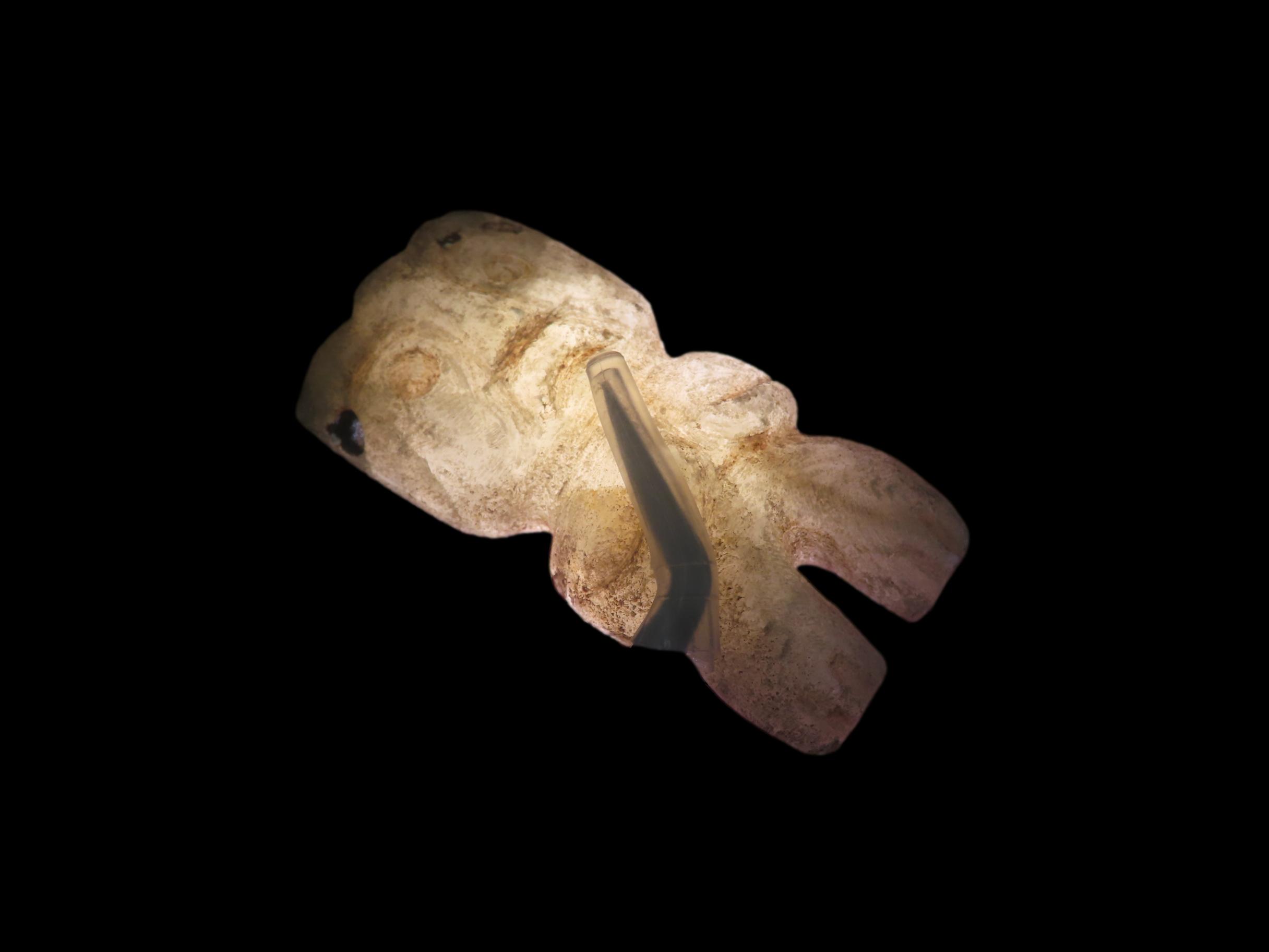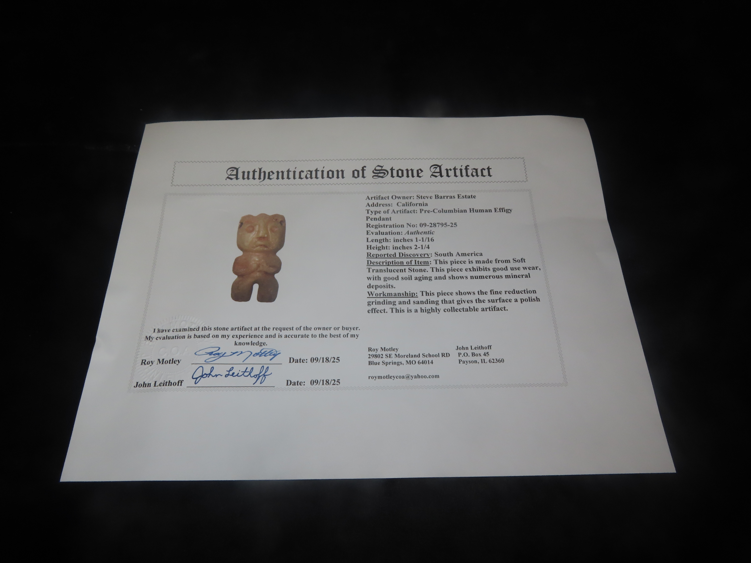 2 1/4″ X 1 1/16″ Pre-Columbian Human Effigy Pendant, Motley COA, found in South America, Ex Steve Barras Estate Collection