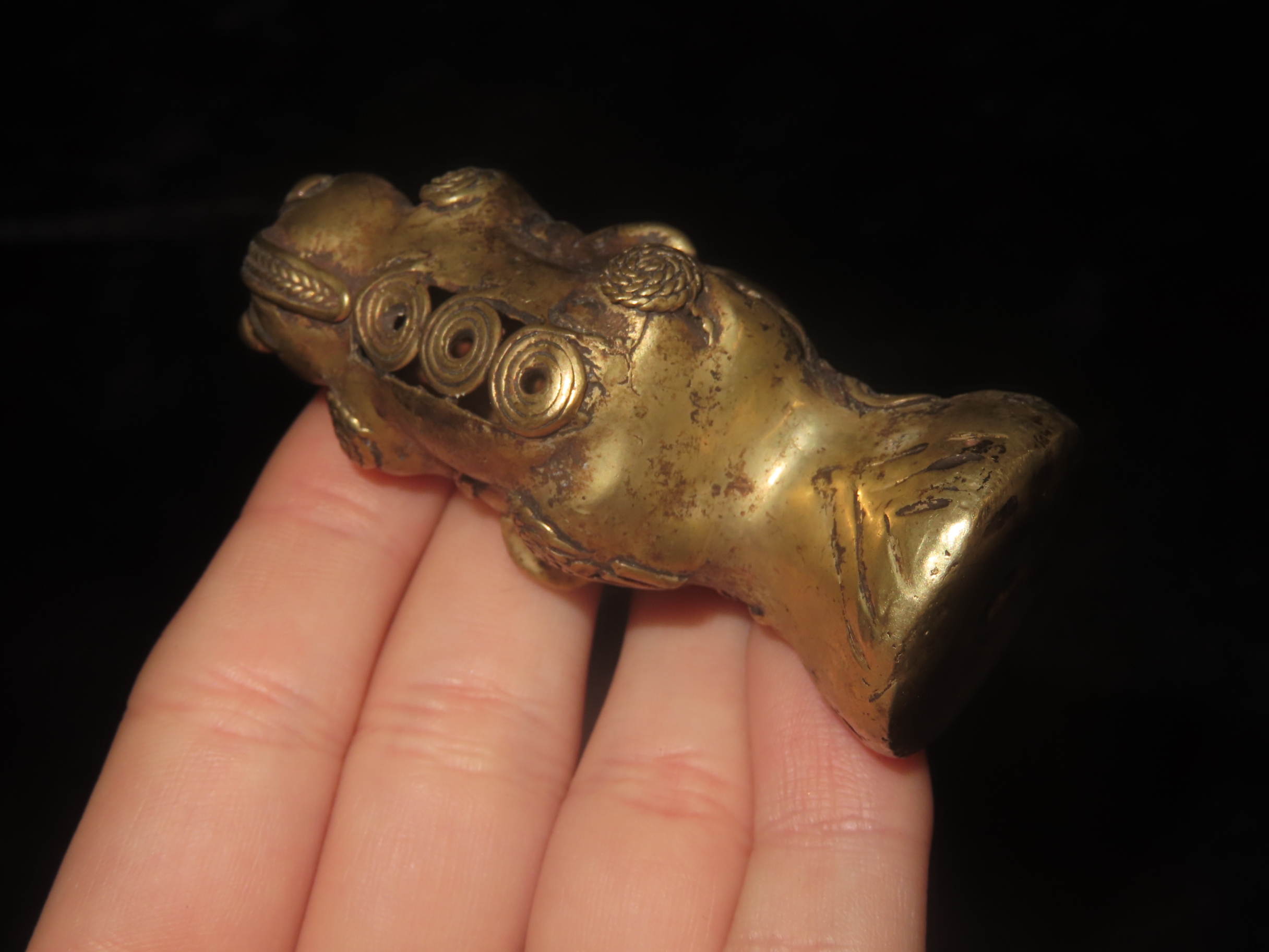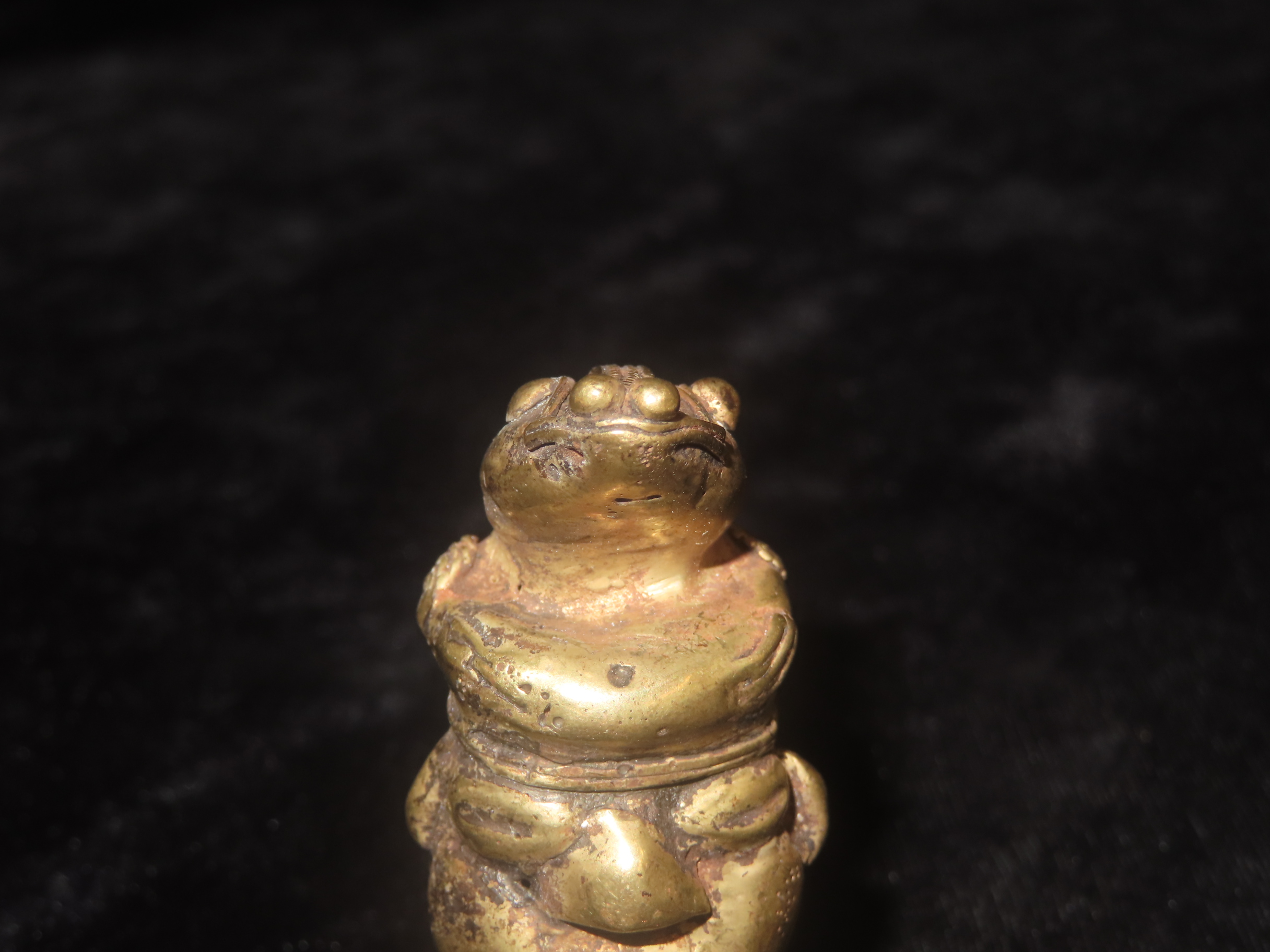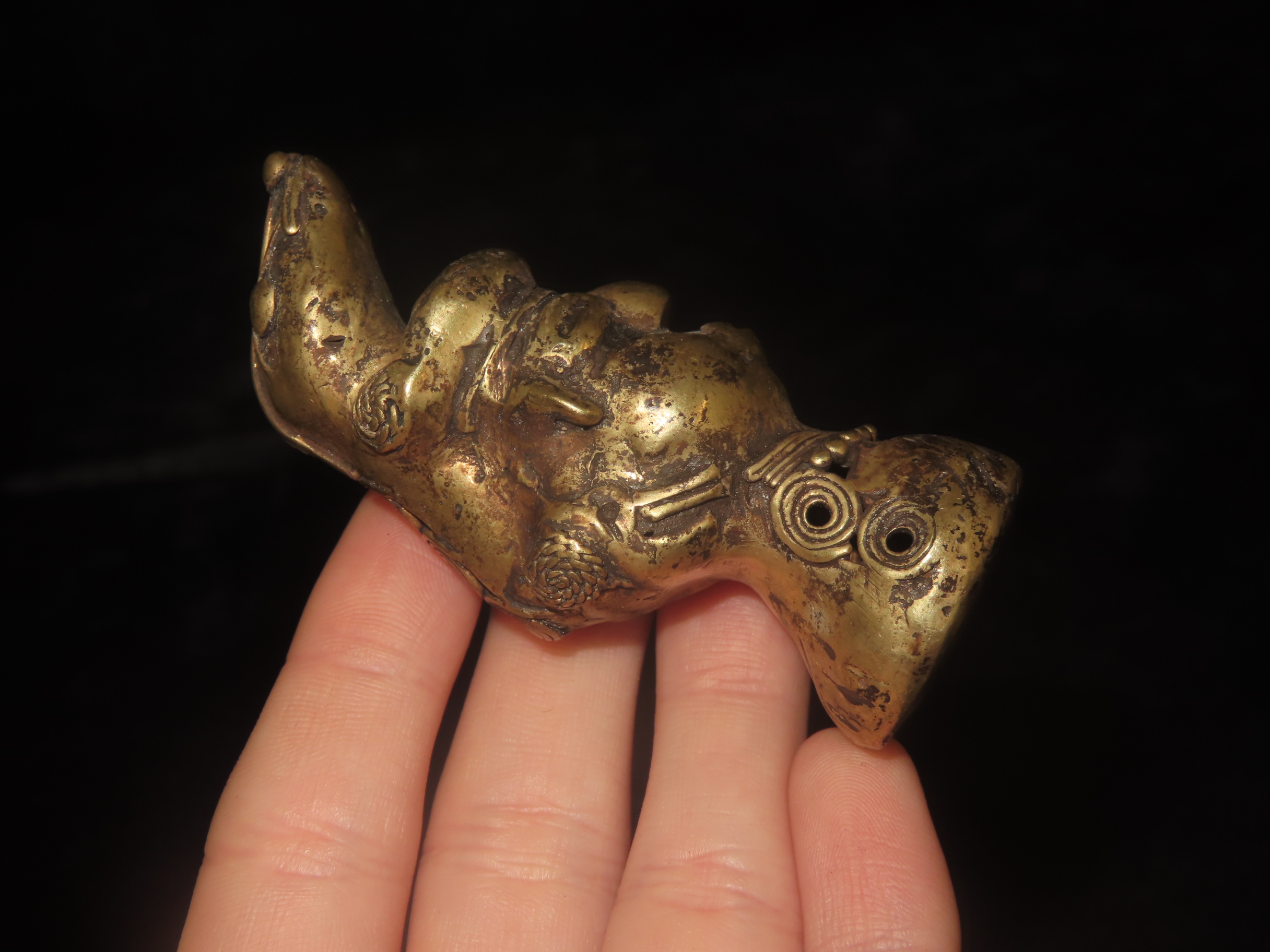 2 3/4" x 1 1/8" Pre-Columbian Tumbaga Figure-Man wearing Alligator Headdress, Motley COA, found in Central America, Ex Steve Barras Estate Collection
