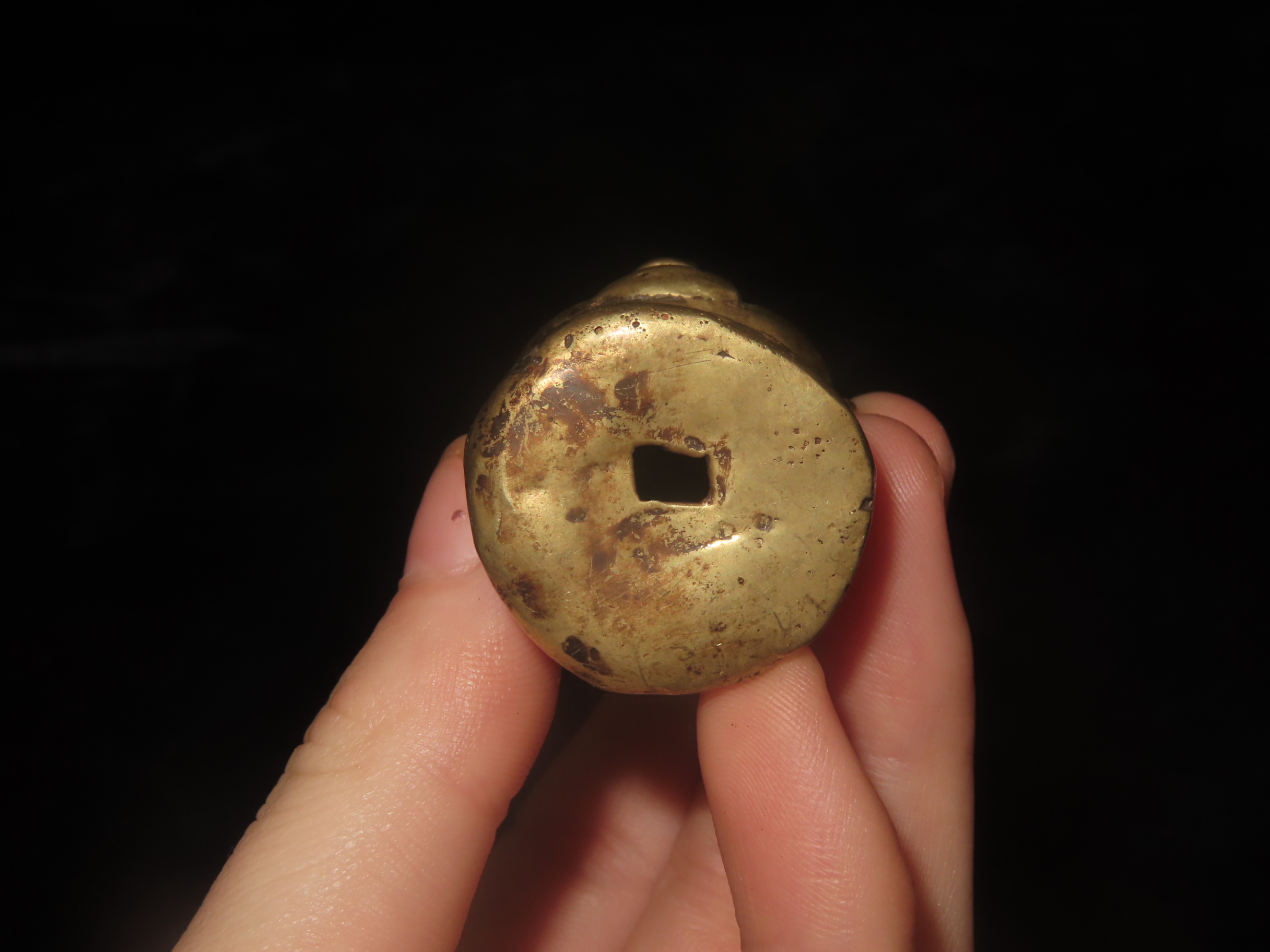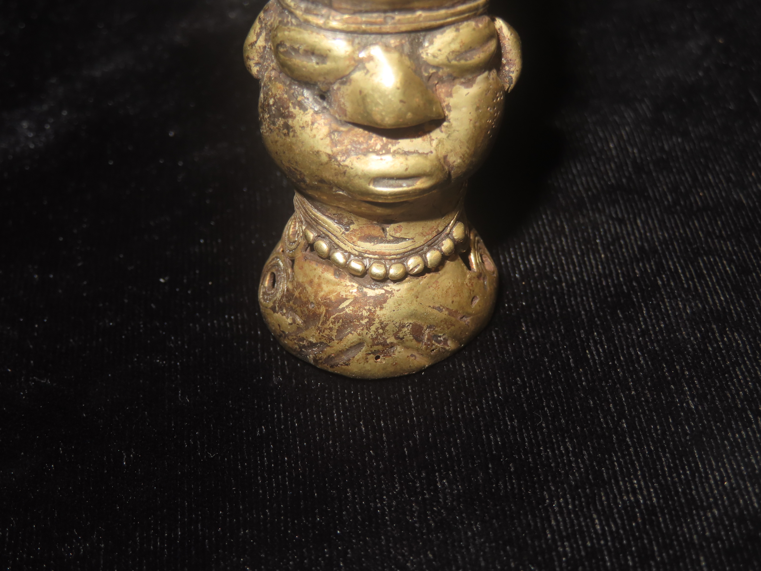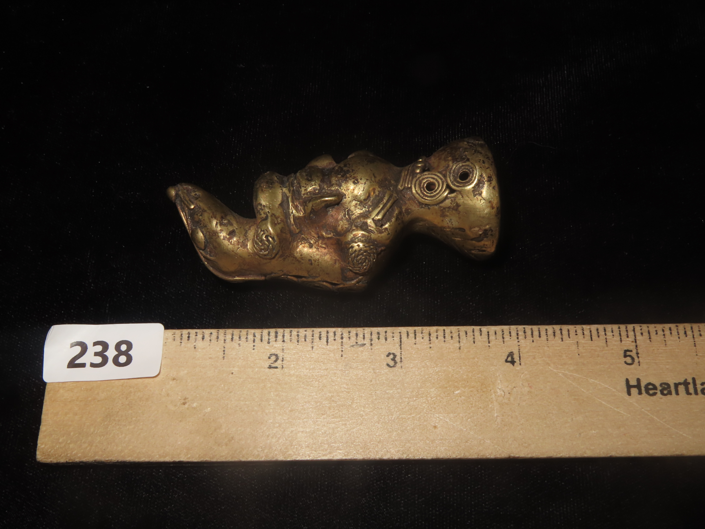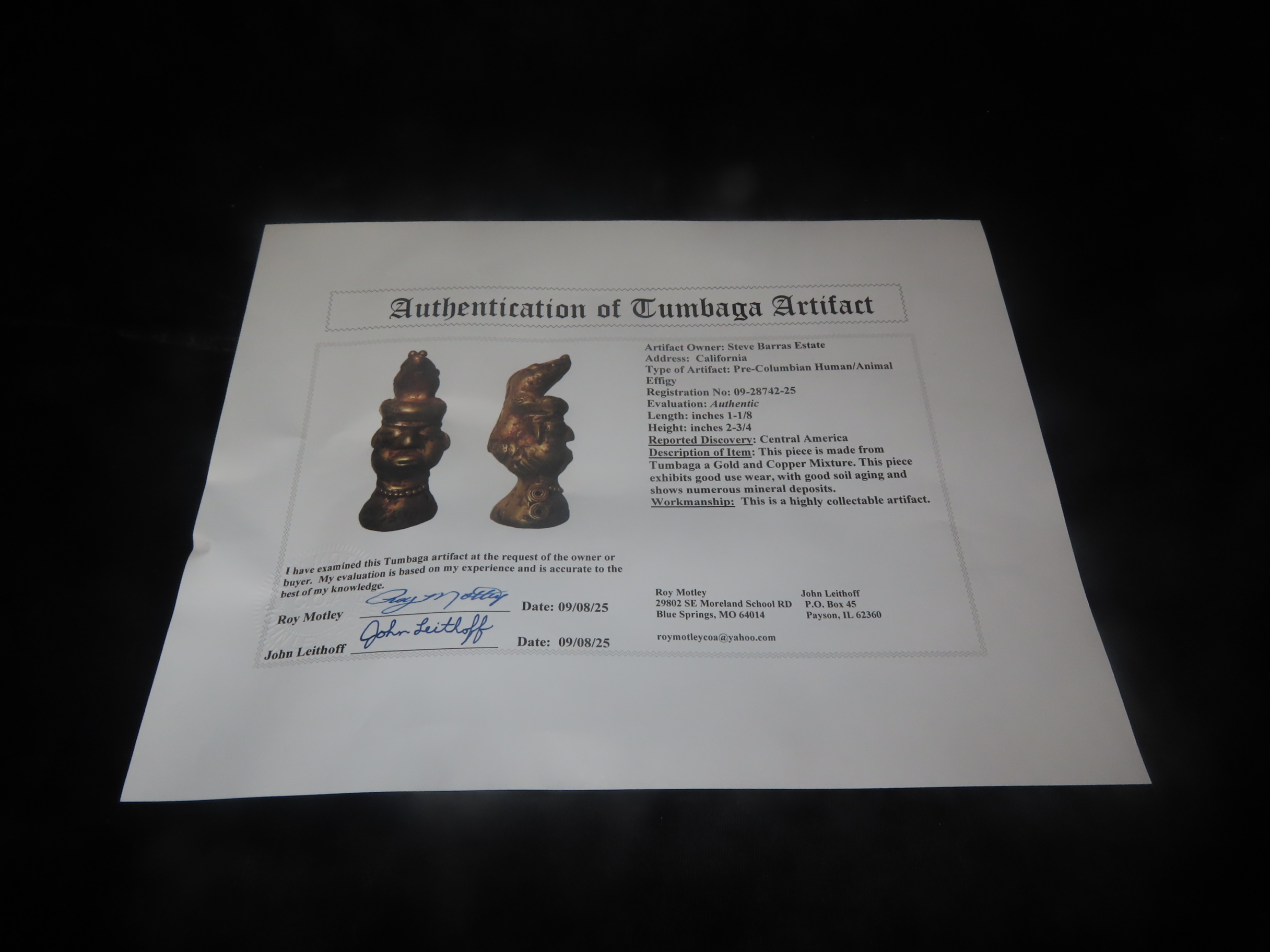 2 3/4″ x 1 1/8″ Pre-Columbian Tumbaga Figure-Man wearing Alligator Headdress, Motley COA, found in Central America, Ex Steve Barras Estate Collection