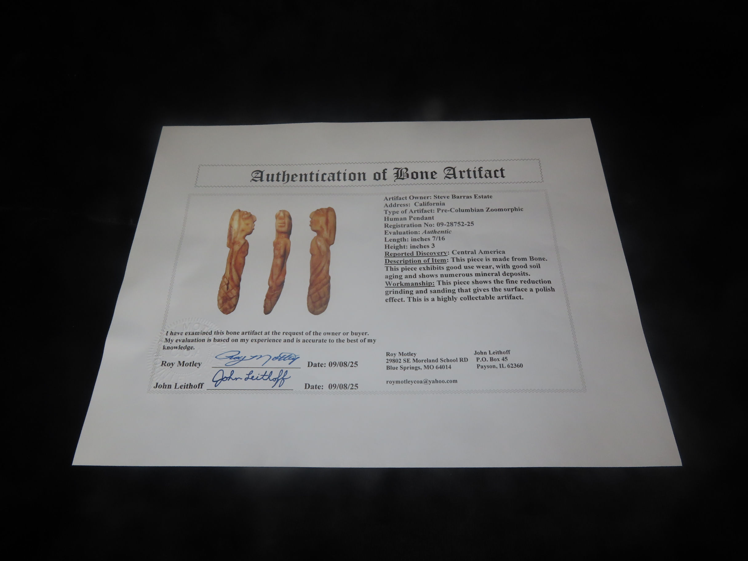 3" x 7/8" Pre-Columbian Bone Zoomorphic Human Effigy Pendant, Motley COA, found in Central America