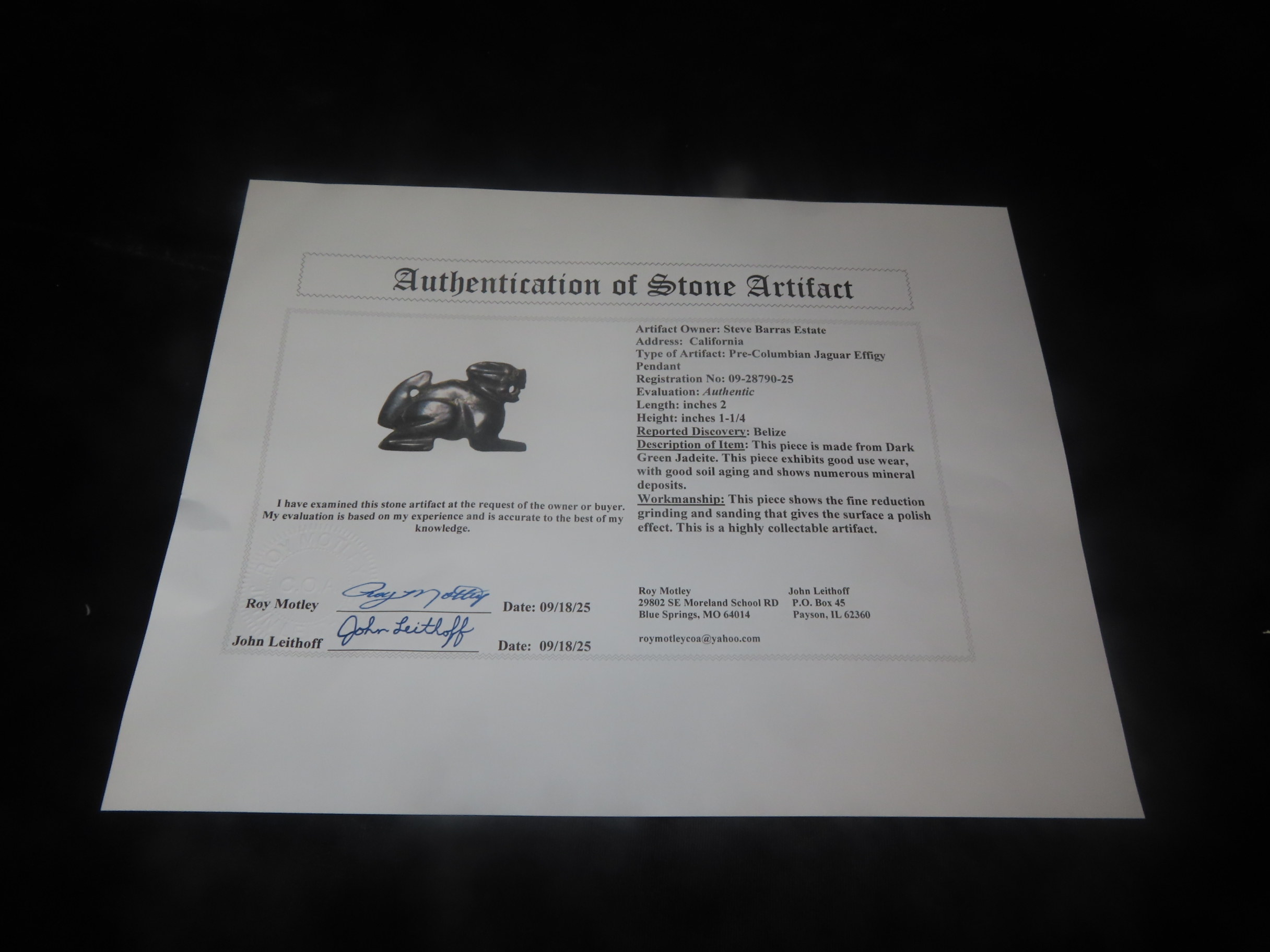 2″ x 1 1/4″ x 5/8″ Pre-Columbian Green Jadeite Jaguar Effigy Pendant, Motley COA, found in Belize, Ex Steve Barras Estate Collection