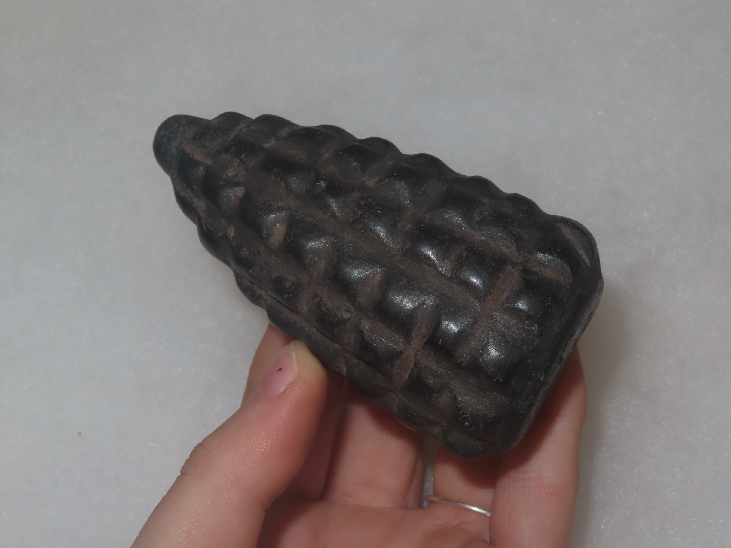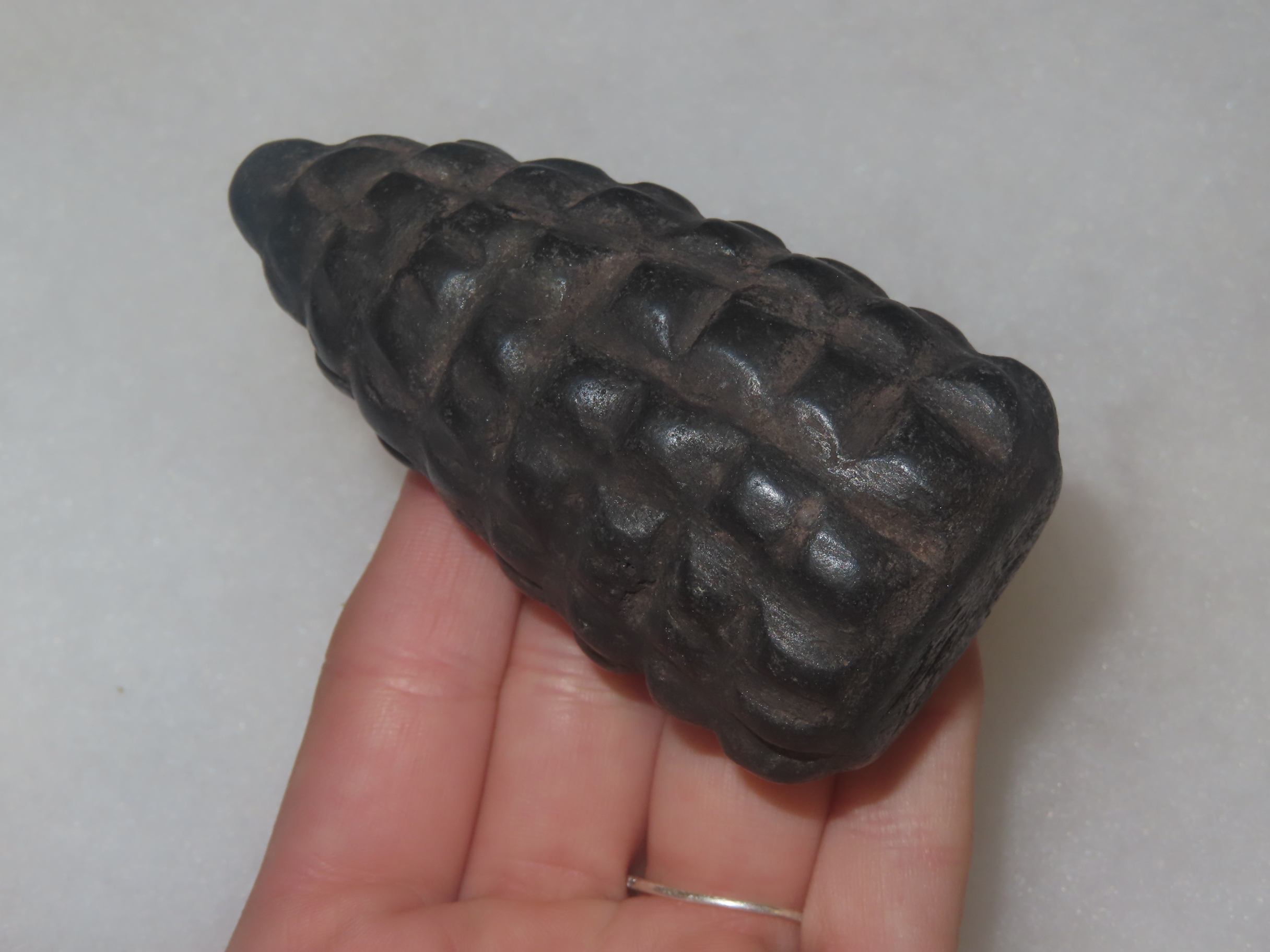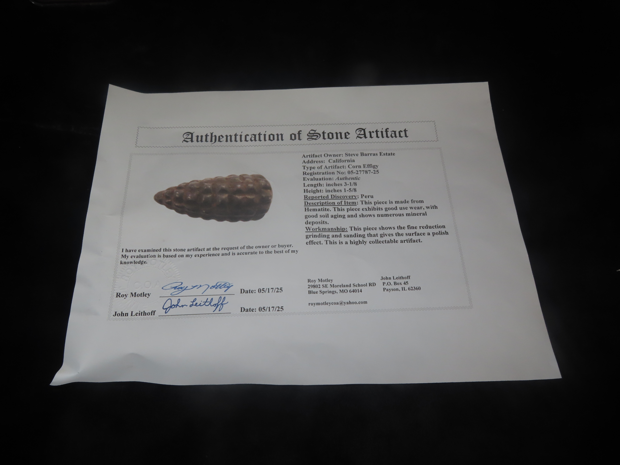 3 1/8" x 1 5/8" Hematite Corn Effigy Idol, Motley COA, found in Peru, Ex Steve Barras Estate Collection