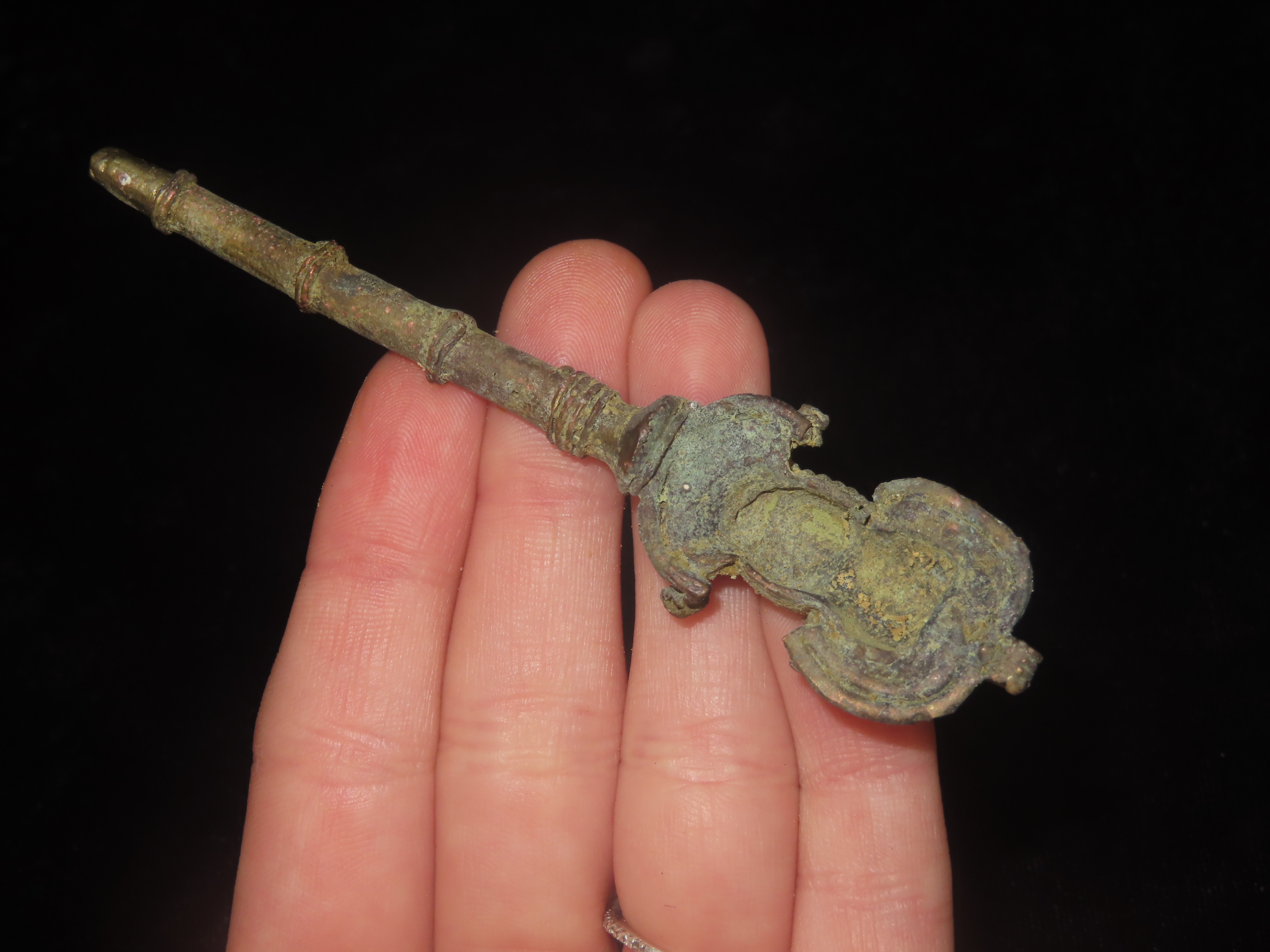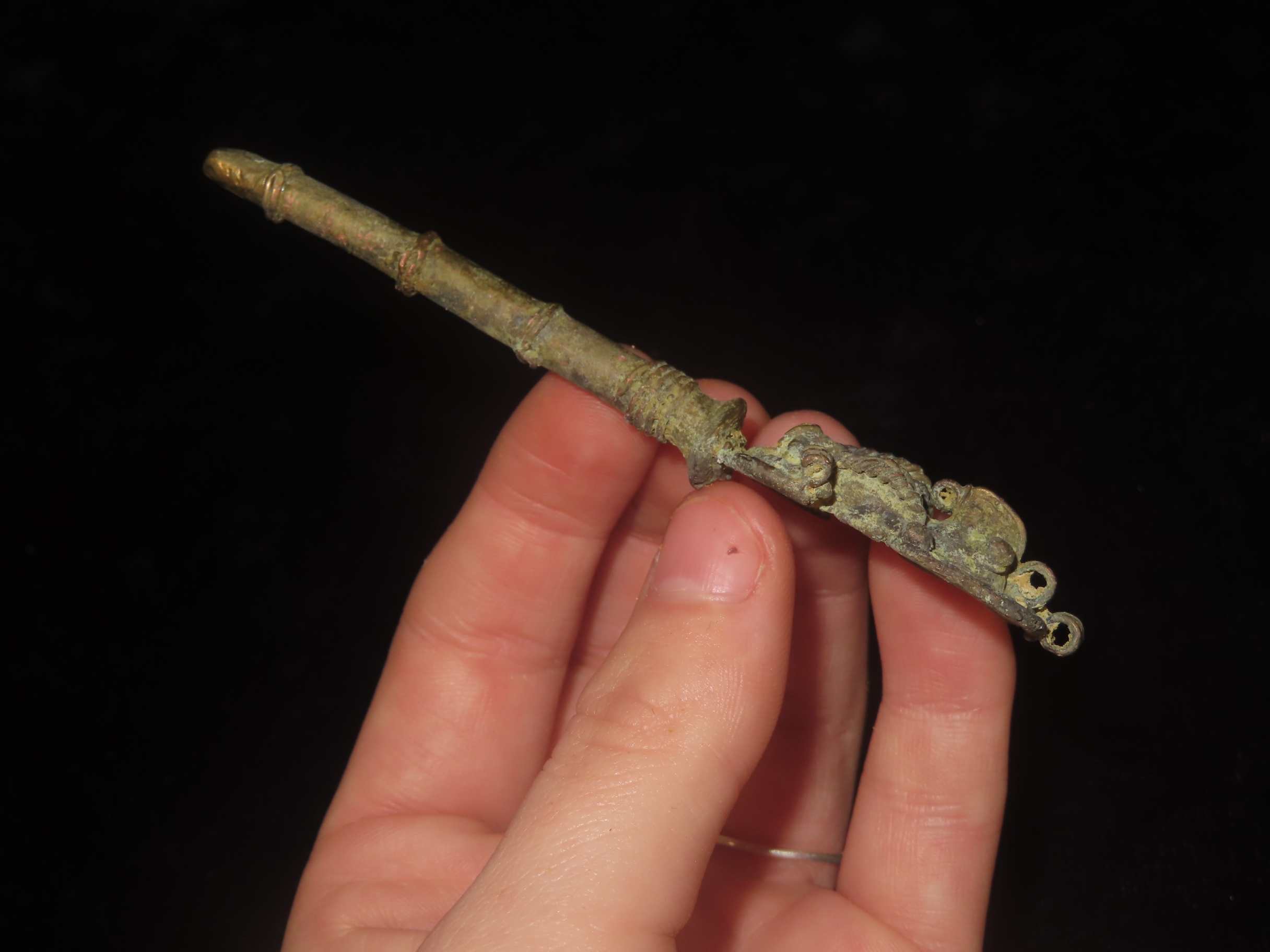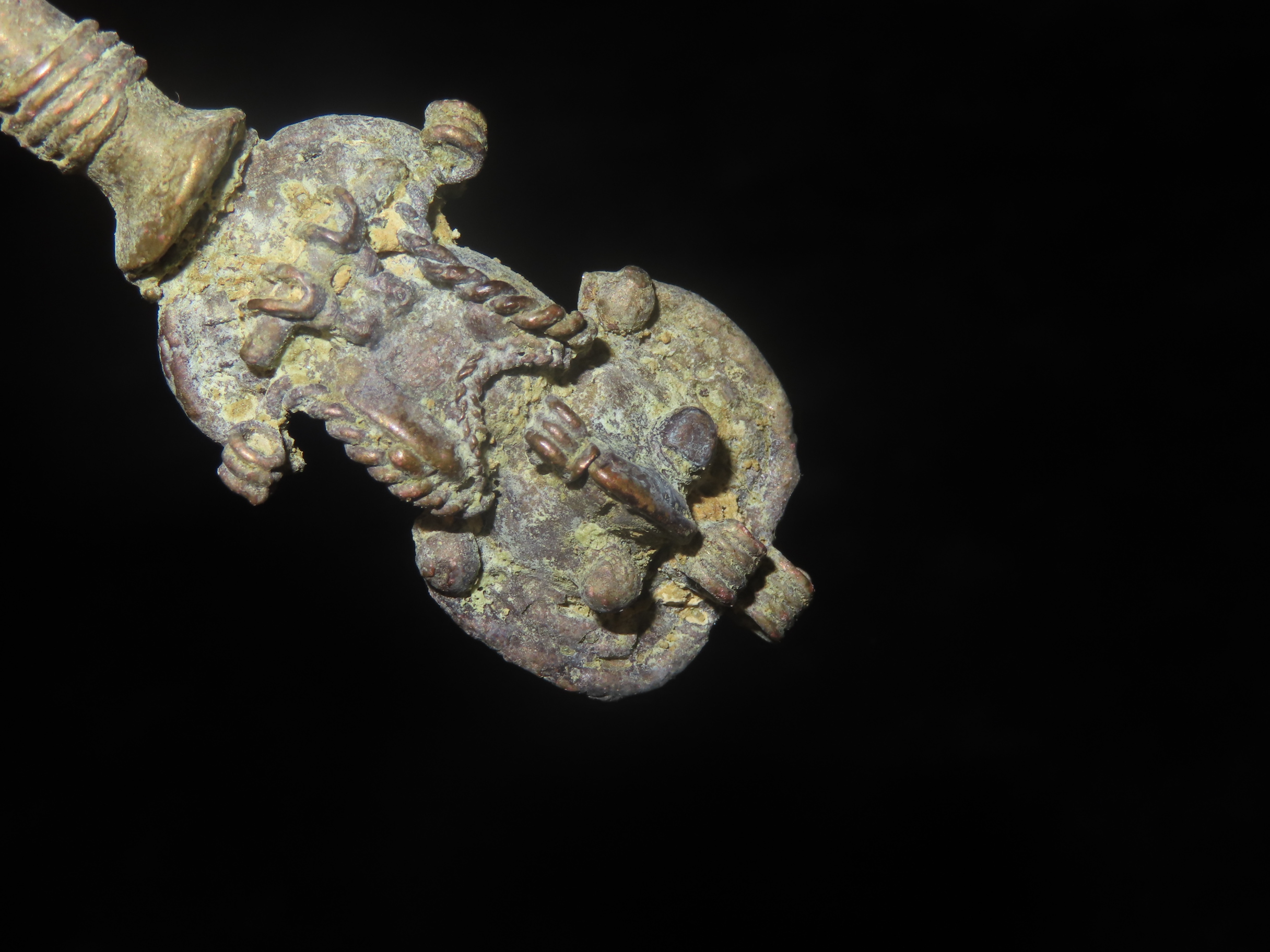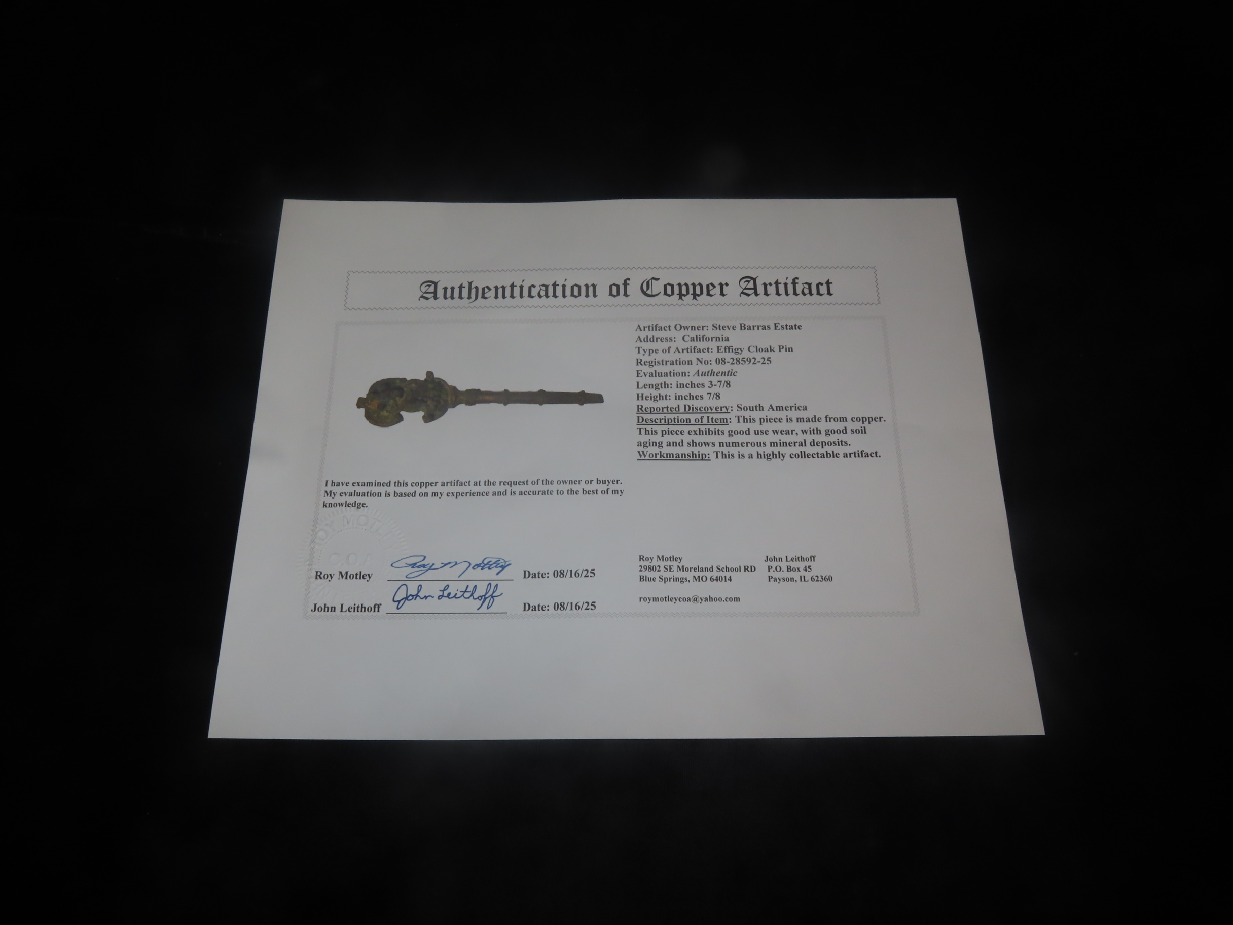 3 7/8″ X 7/8″ Copper Bird Effigy Cloak Pin, Motley COA, found in South America, Ex Steve Barras Estate Collection