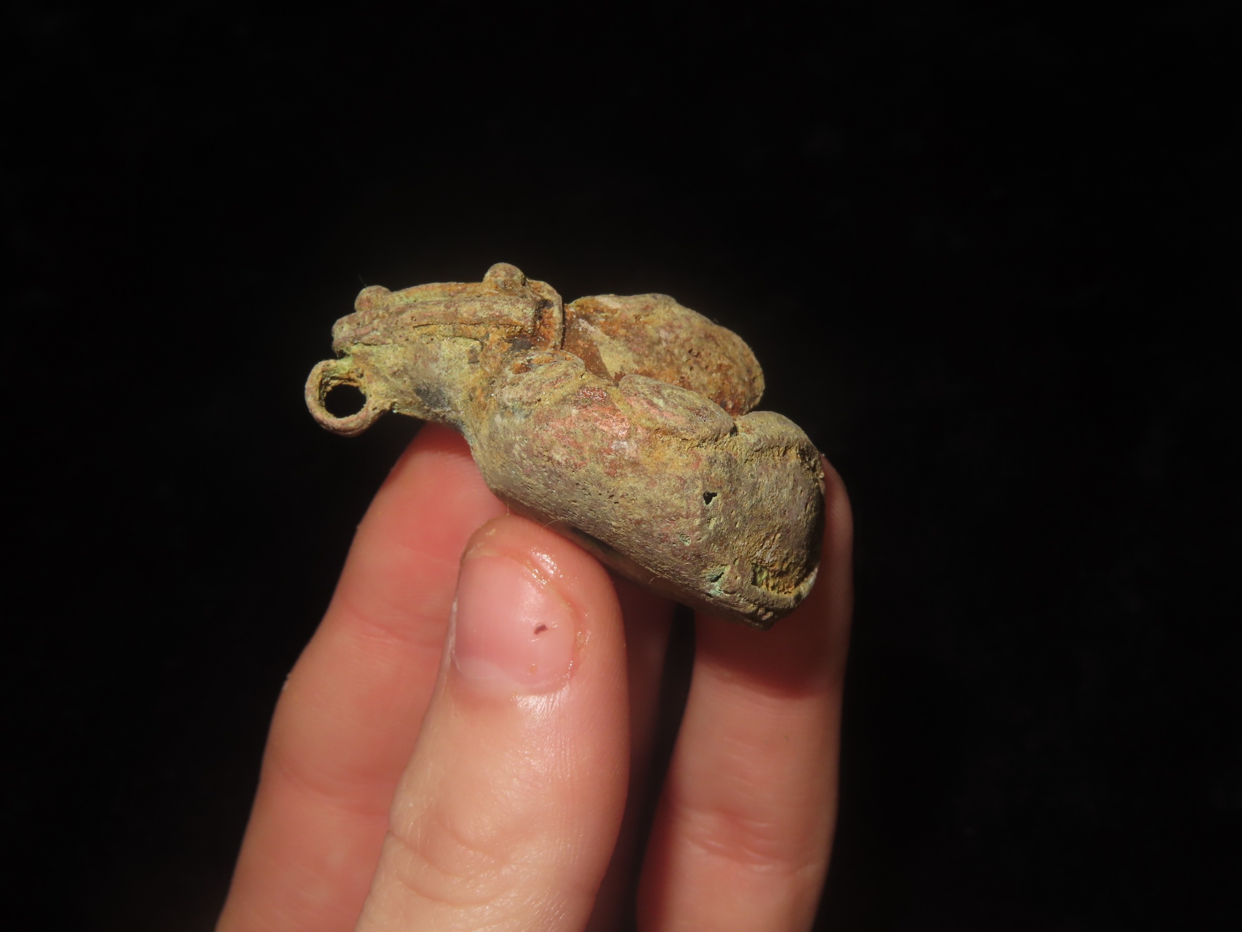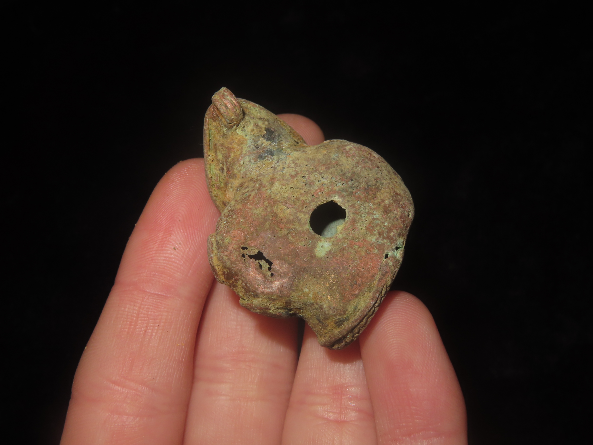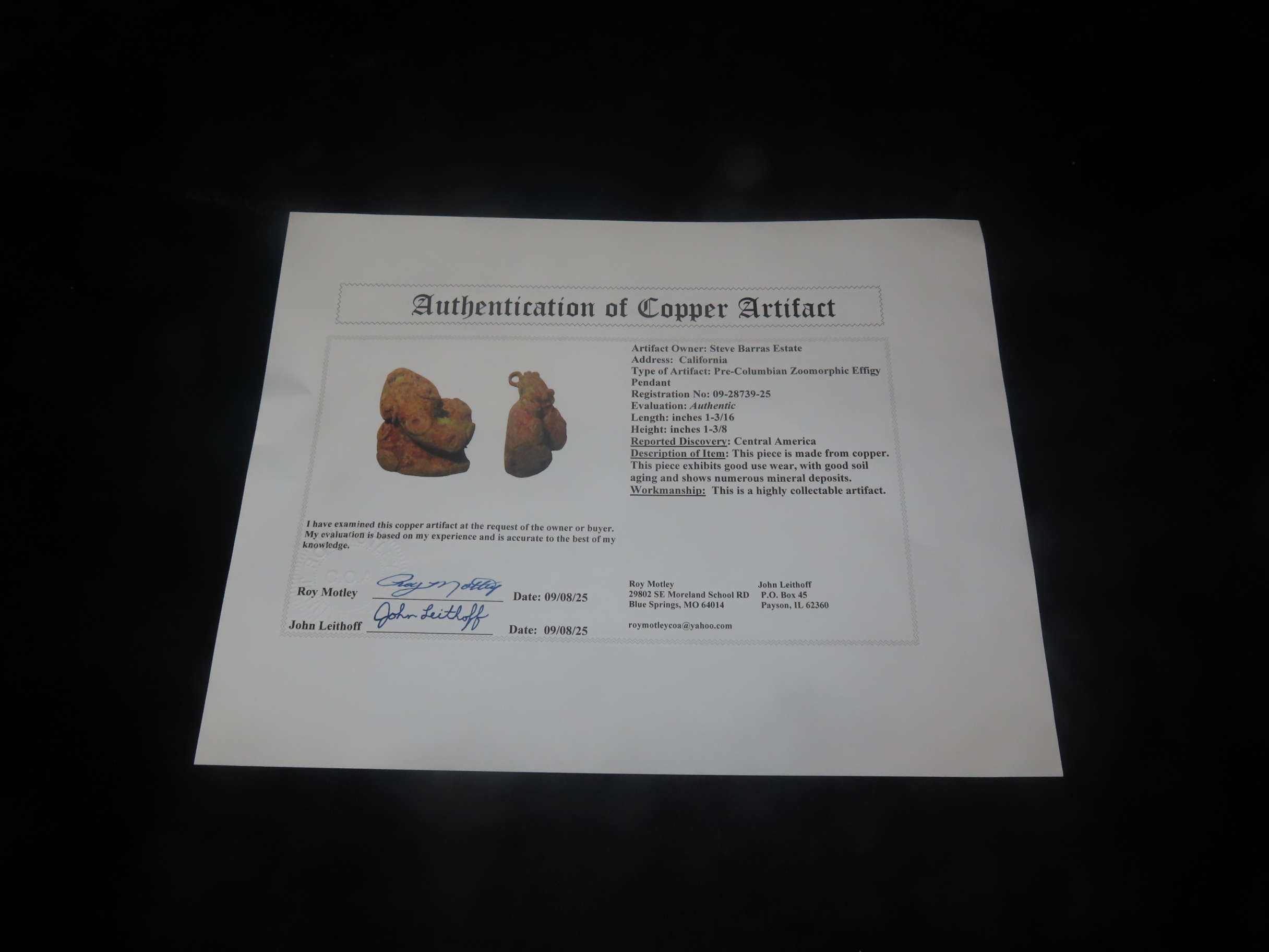 1 3/16″ x 1 3/8″ Pre-Columbian Zoomorphic Effigy Pendant, Motley COA, found in Central America, Ex Steve Barras Estate Collection