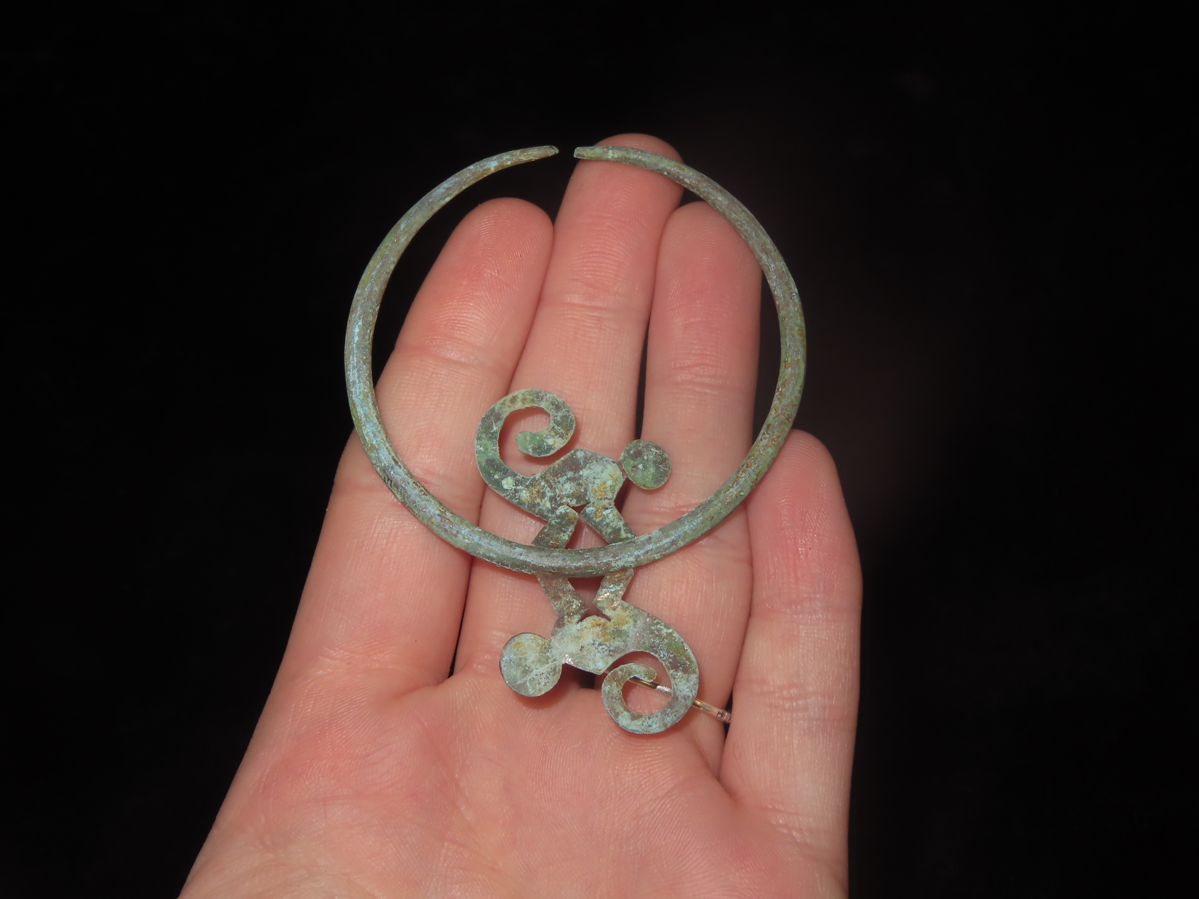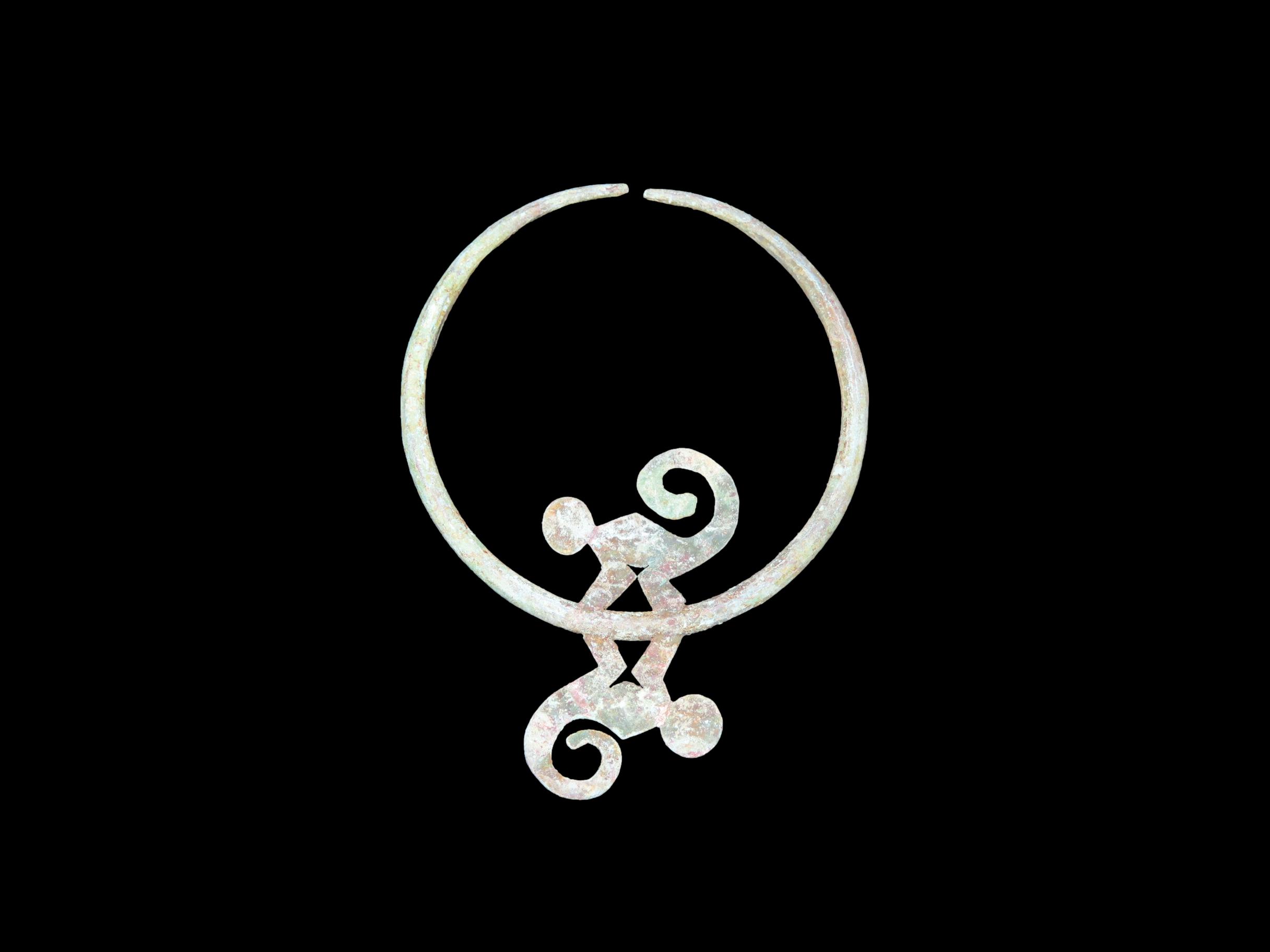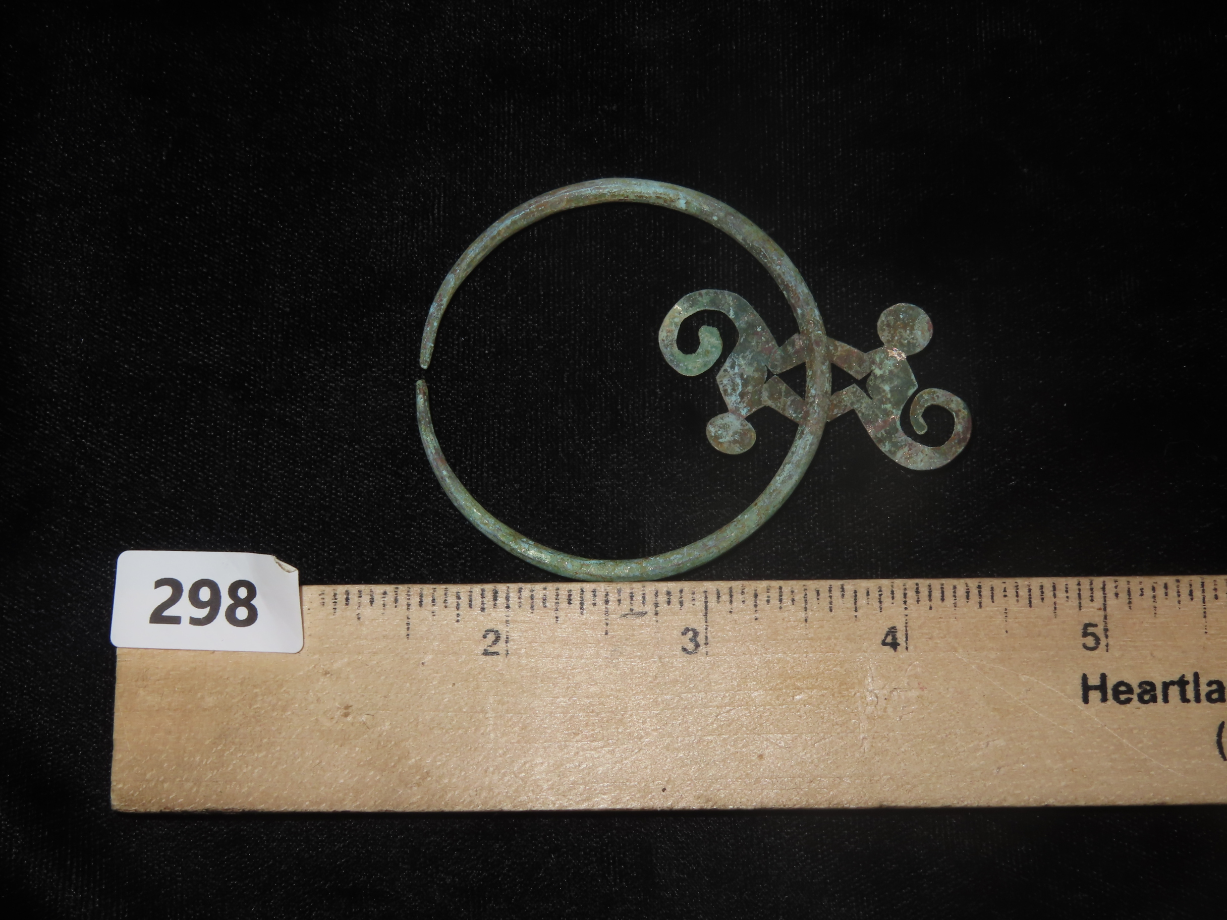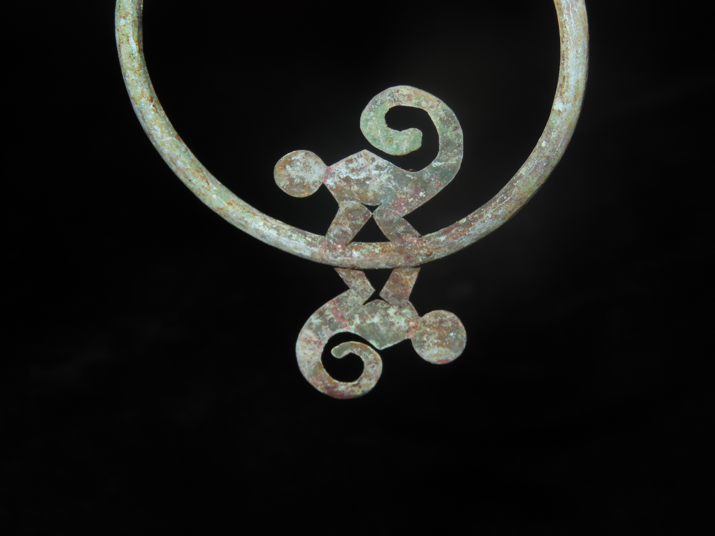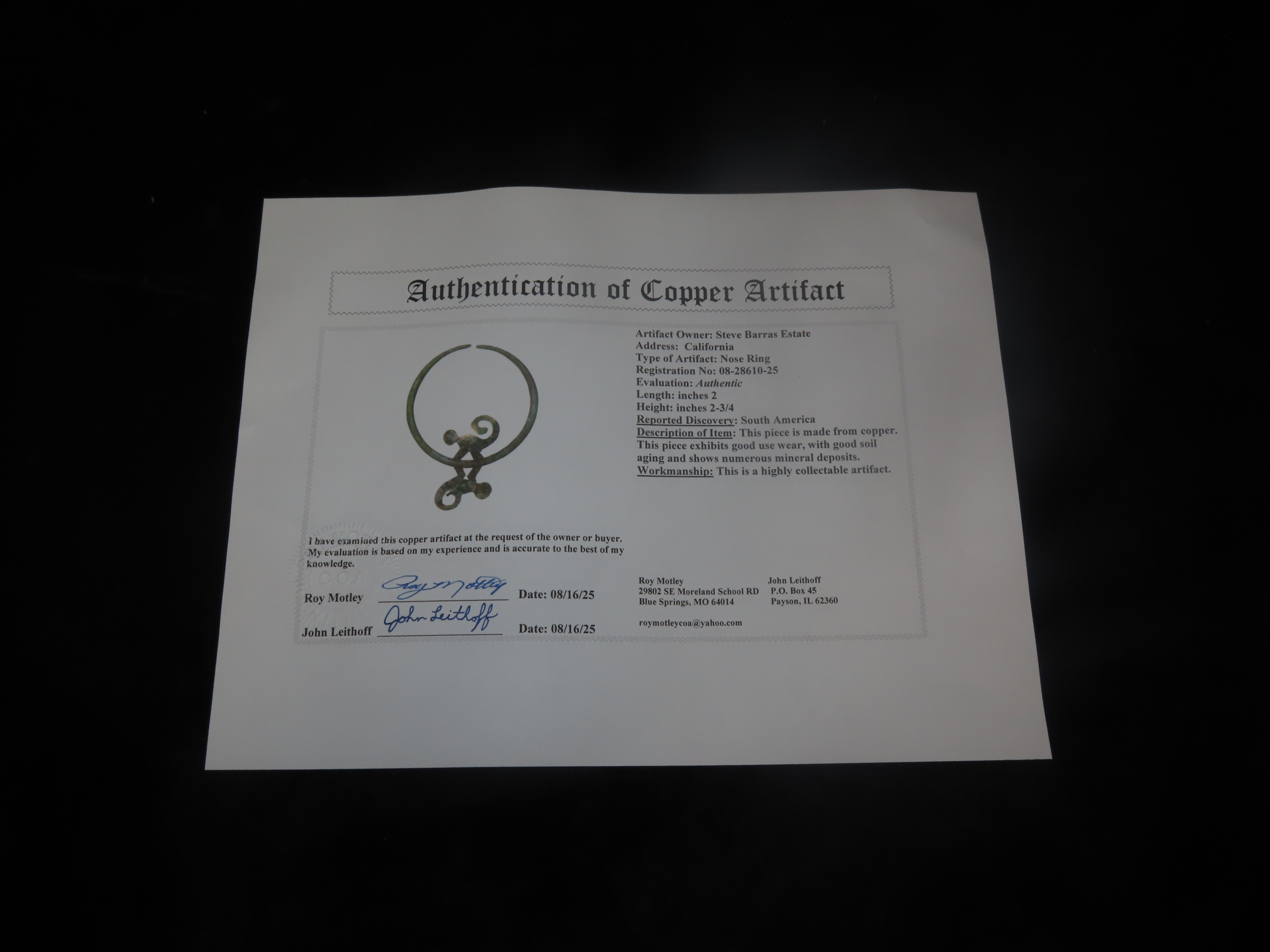 2″ x 2 3/4″ Copper Nose Ornament/Decoration feat. Monkeys, Motley COA, found in South America, Ex Steve Barras Estate Collection