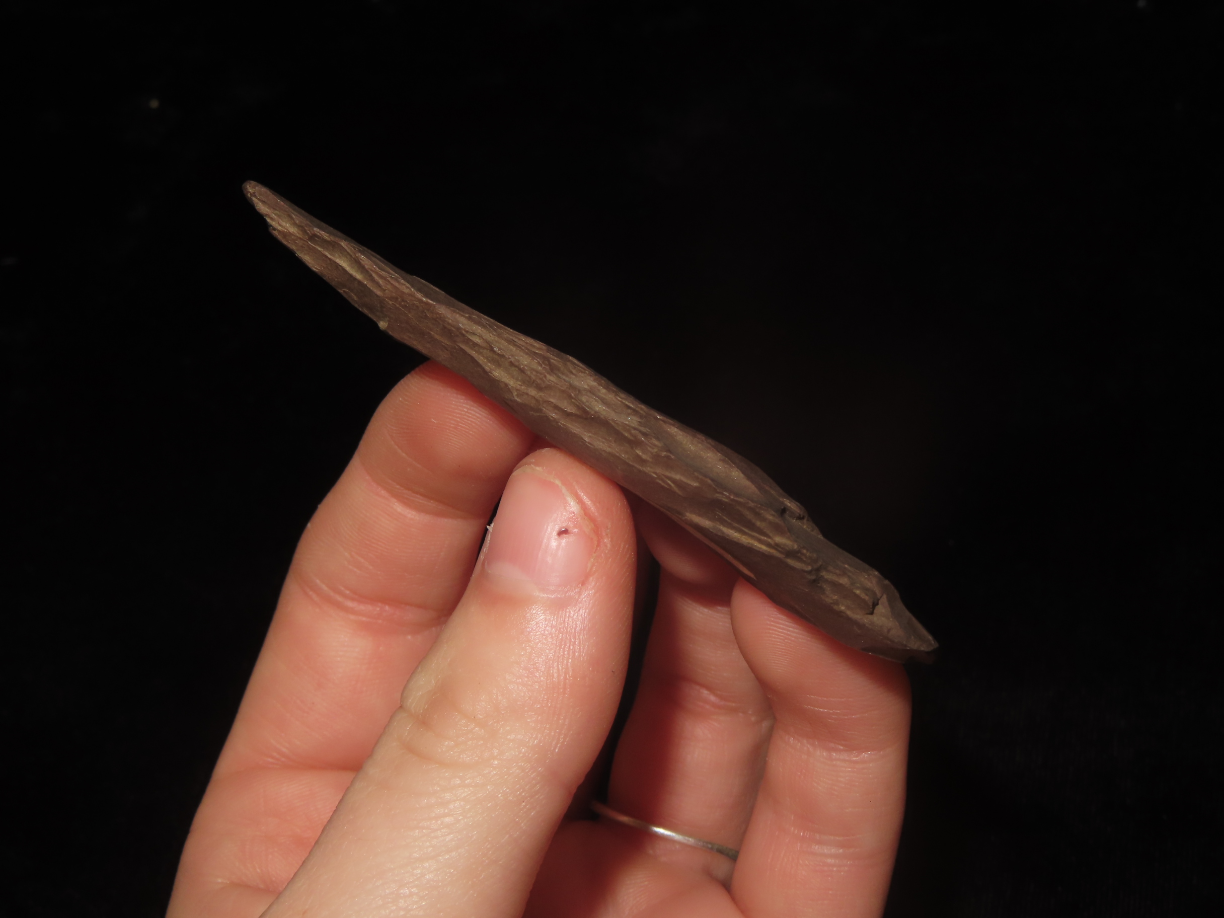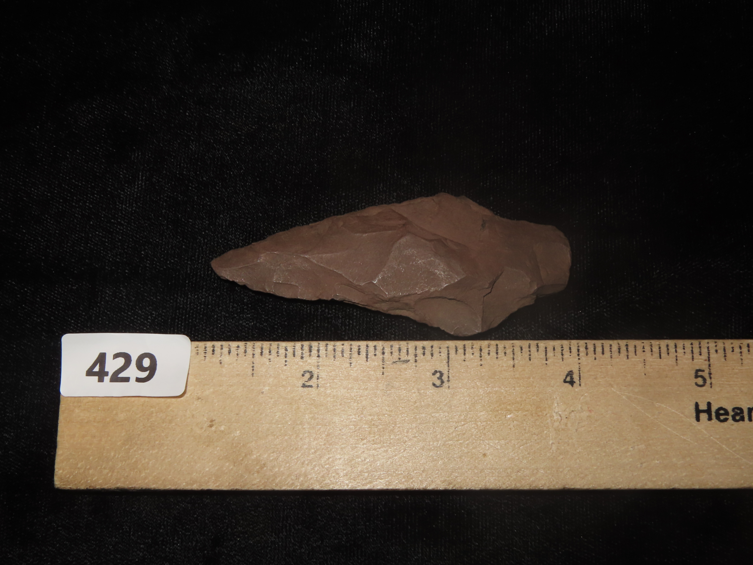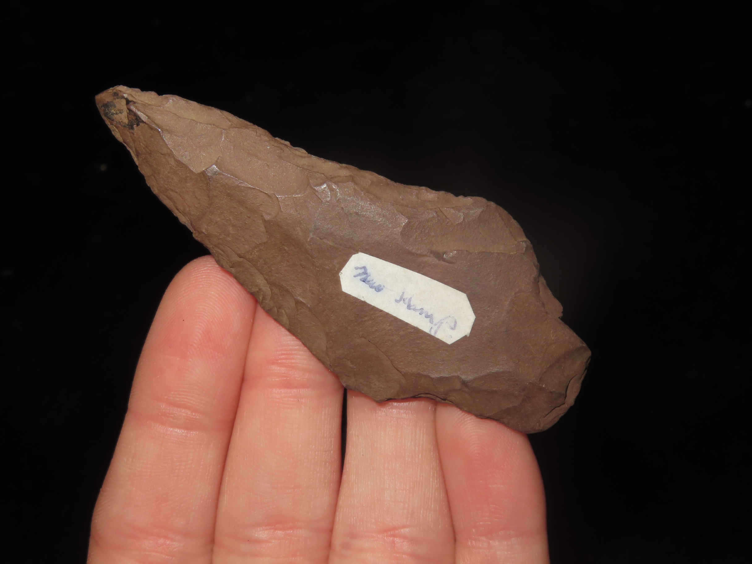 2 7/8" x 1 1/8" Morrow Mountain Pt, found at The Beaver Site on the Marvin Farm in Attleboro, Massachusetts. Ex Peter Engstrom, Ex Dr. Robbins Collections