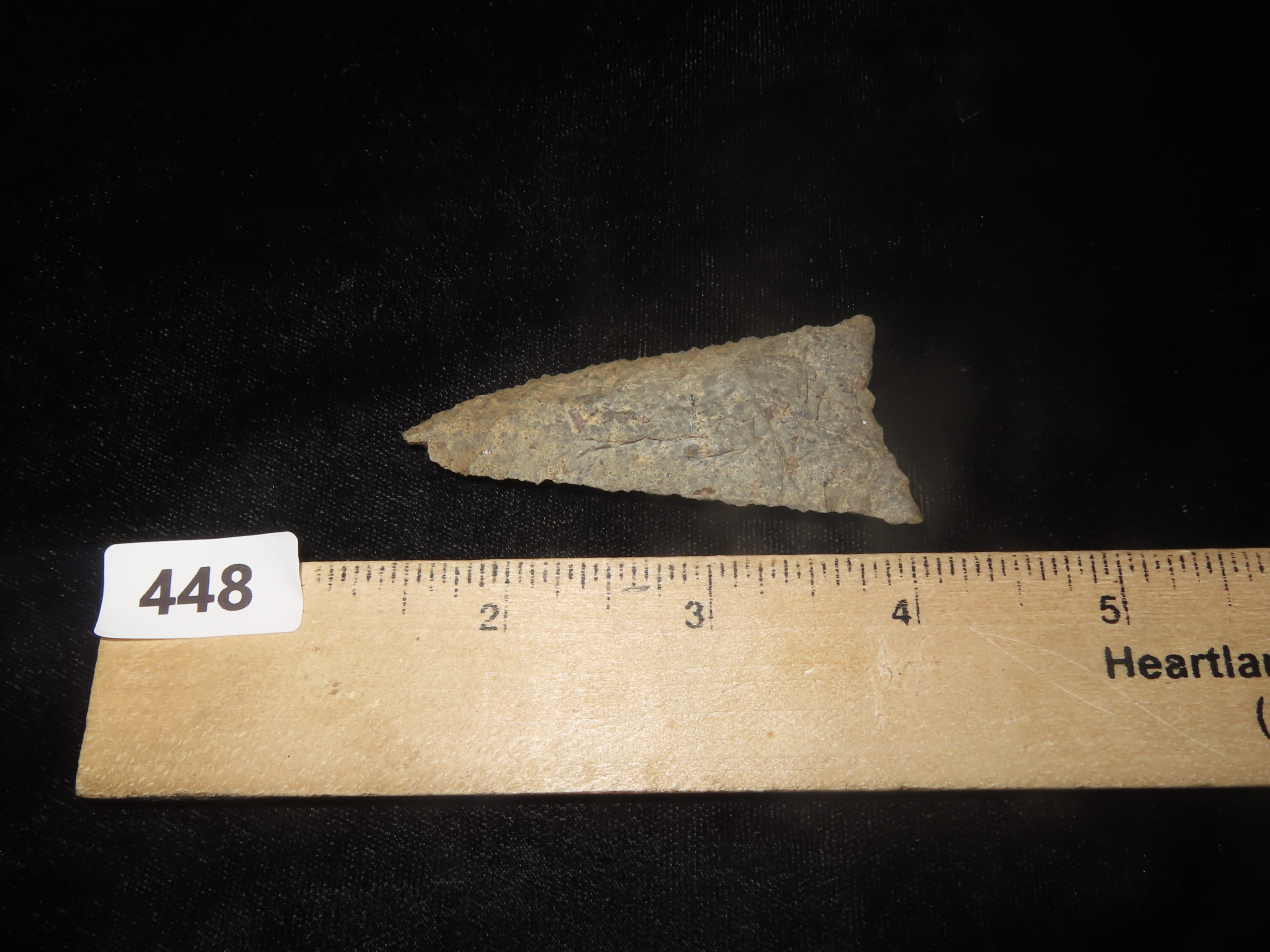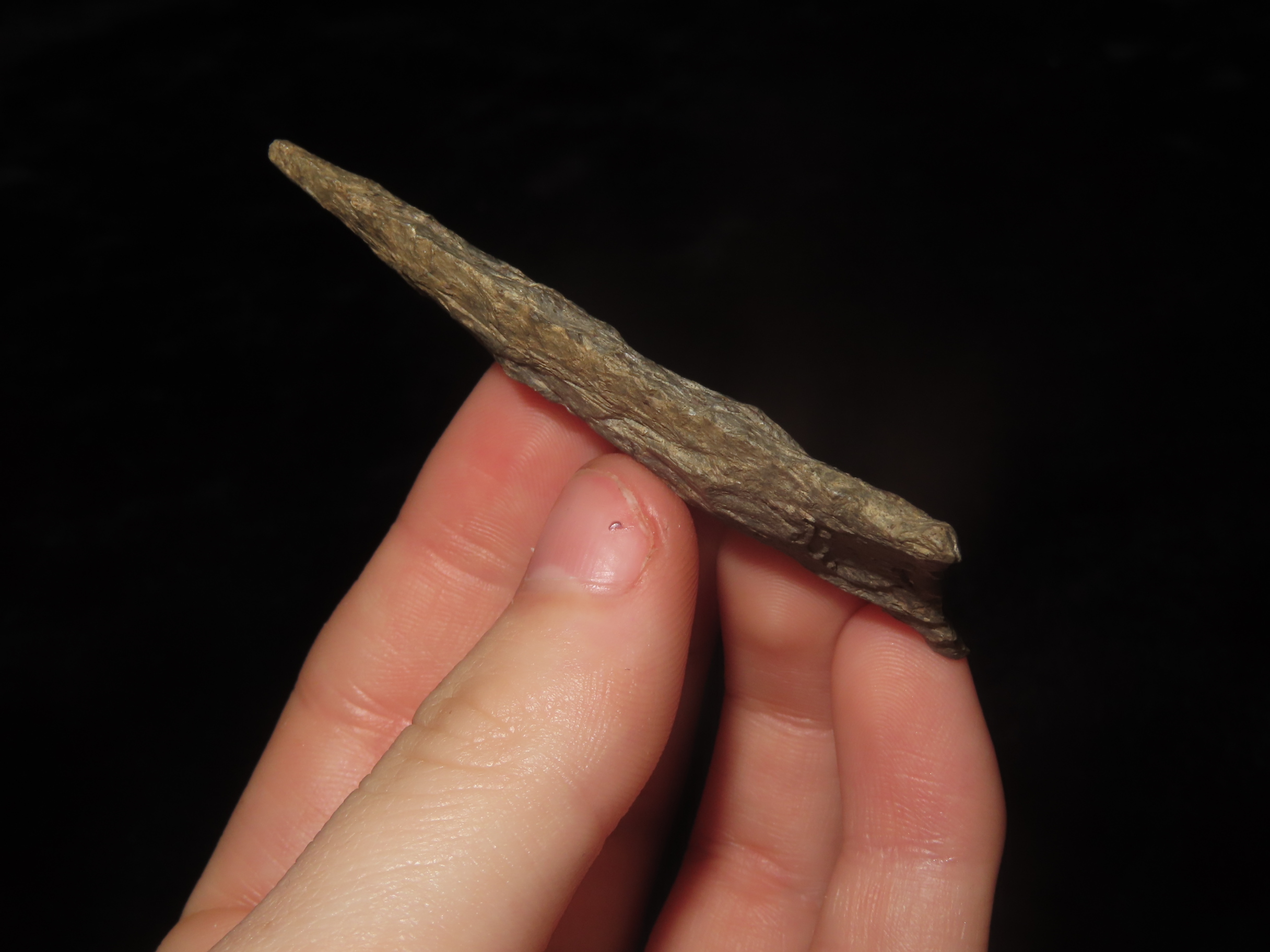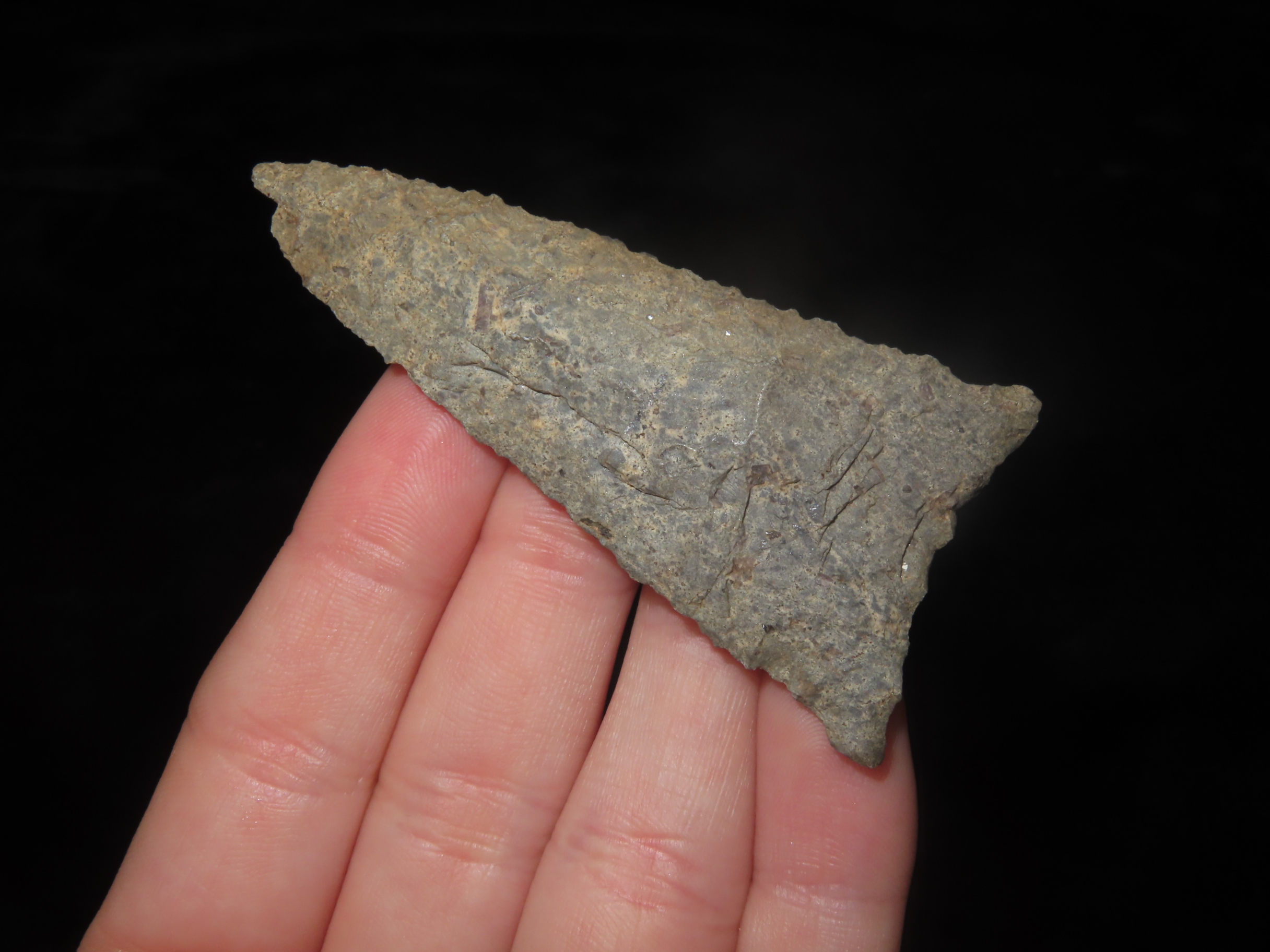 2 5/8″ X 1 1/4″ Grey Rhyolite Hardaway, Late Paleo 9500-8000 BP, found at The Beaver Site on the Marvin Farm in Attleboro, Massachusetts. Ex Peter Engstrom, Ex Dr. Robbins Collections