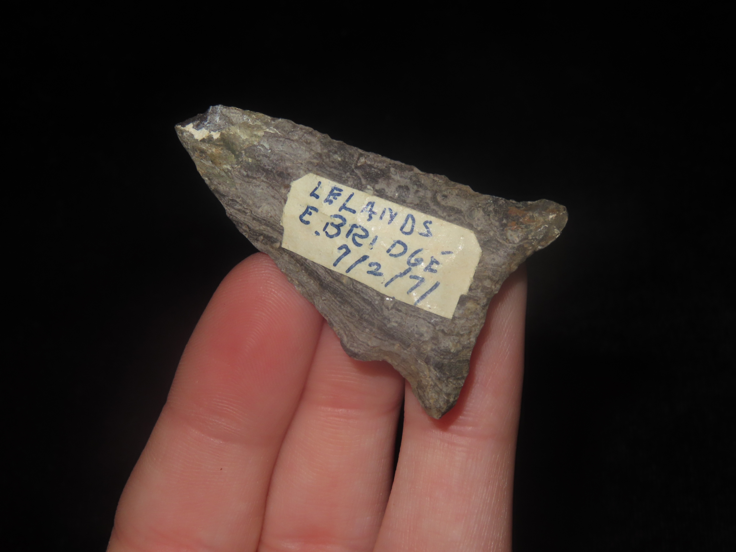 1 3/4" x 1 1/16" Striped Rhyolite Hardaway, Late Paleo 9500-8000 BP, found at The Beaver Site on the Marvin Farm in Attleboro, Massachusetts. Ex Peter Engstrom, Ex Dr. Robbins Collections