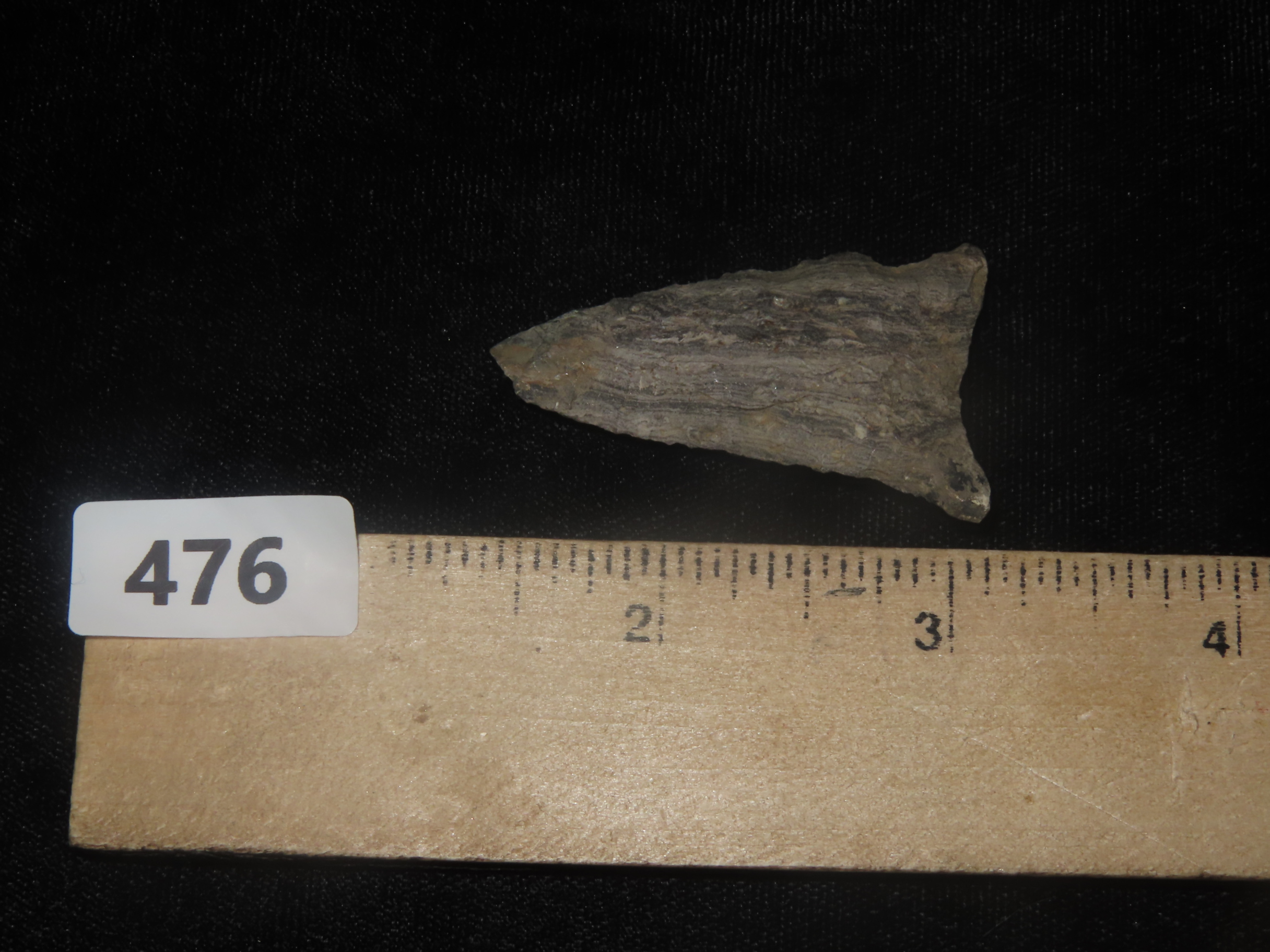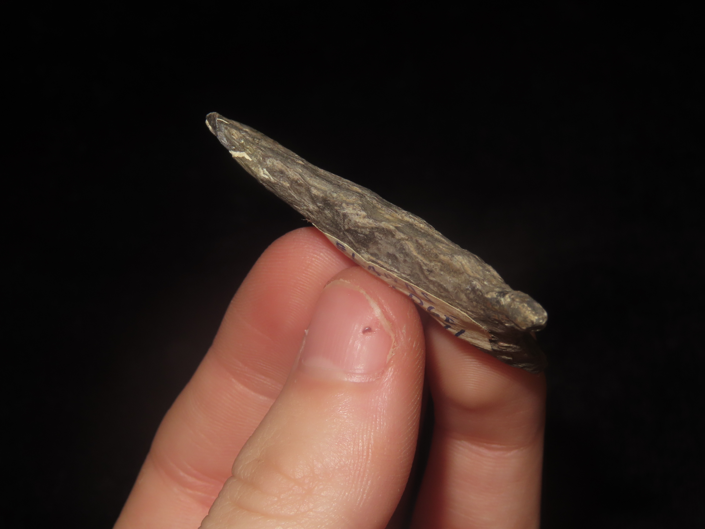 1 3/4″ x 1 1/16″ Striped Rhyolite Hardaway, Late Paleo 9500-8000 BP, found at The Beaver Site on the Marvin Farm in Attleboro, Massachusetts. Ex Peter Engstrom, Ex Dr. Robbins Collections