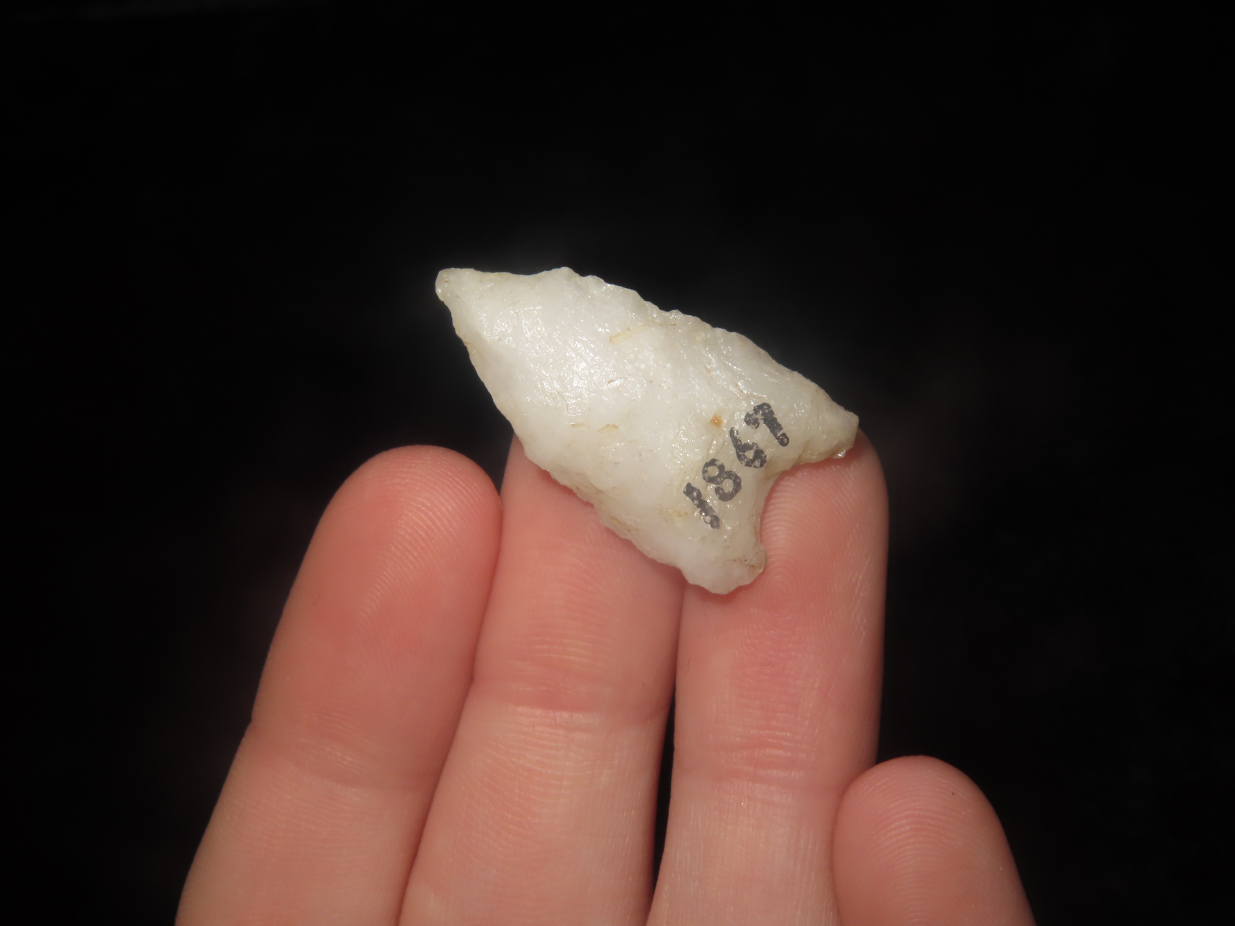 1 1/8″ x 9/16″ Late Paleo Crystal Quartz Alamance/Clovis 12,000-10,000 BP, found 1920-1930 at The Beaver Site on the Marvin Farm in Attleboro, Massachusetts. Ex Peter Engstrom, Ex Dr. Robbins Collections