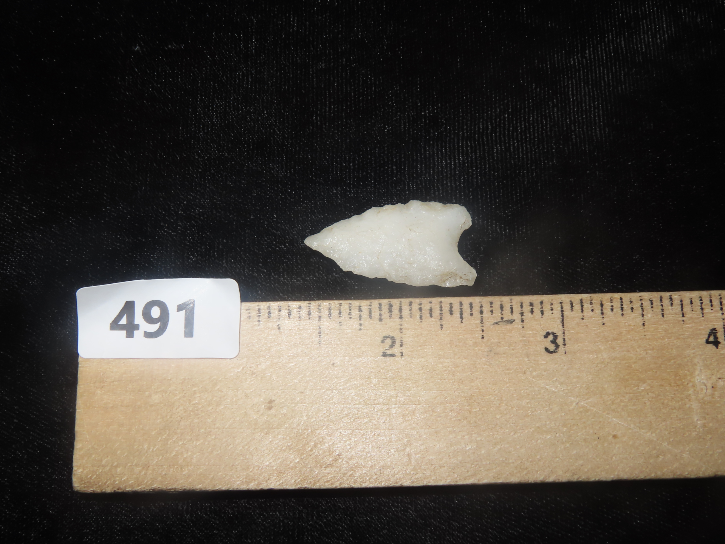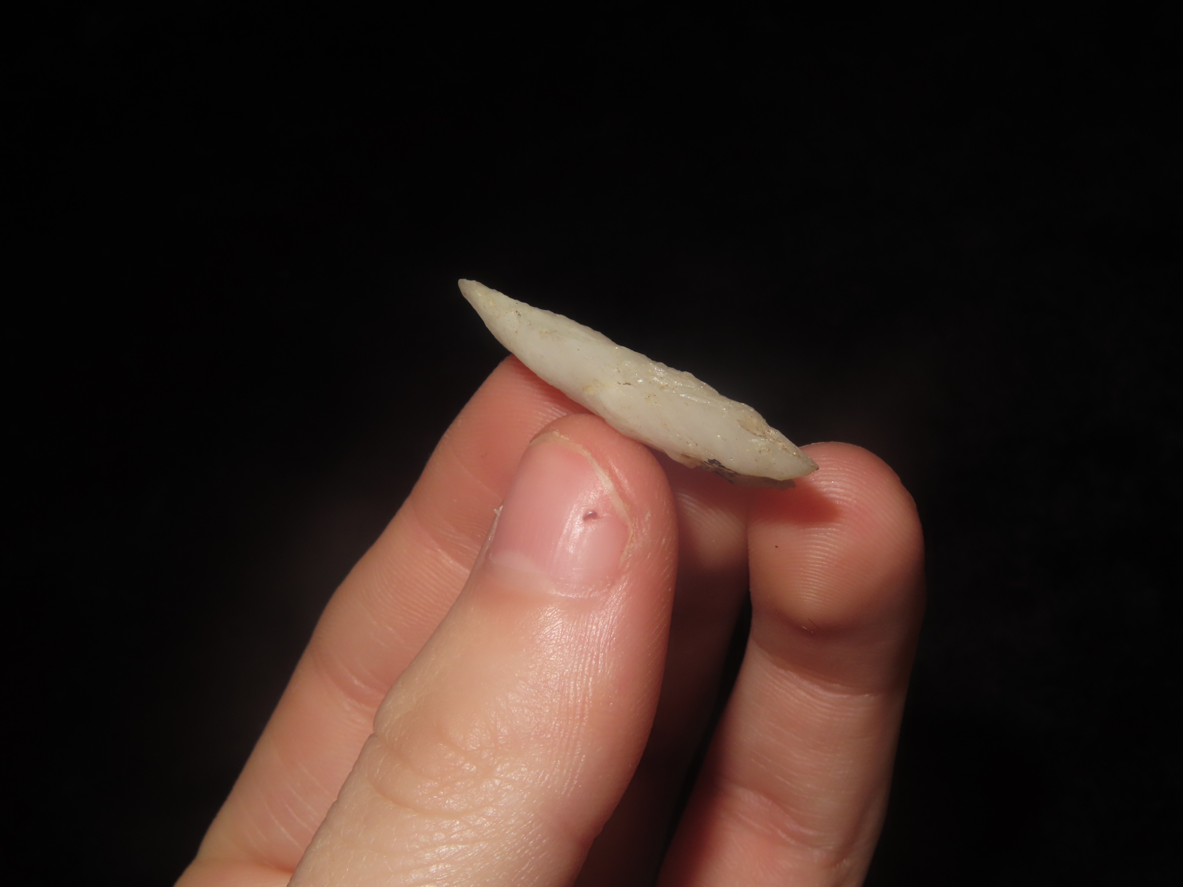 1 1/8" x 9/16" Late Paleo Crystal Quartz Alamance/Clovis 12,000-10,000 BP, found 1920-1930 at The Beaver Site on the Marvin Farm in Attleboro, Massachusetts. Ex Peter Engstrom, Ex Dr. Robbins Collections