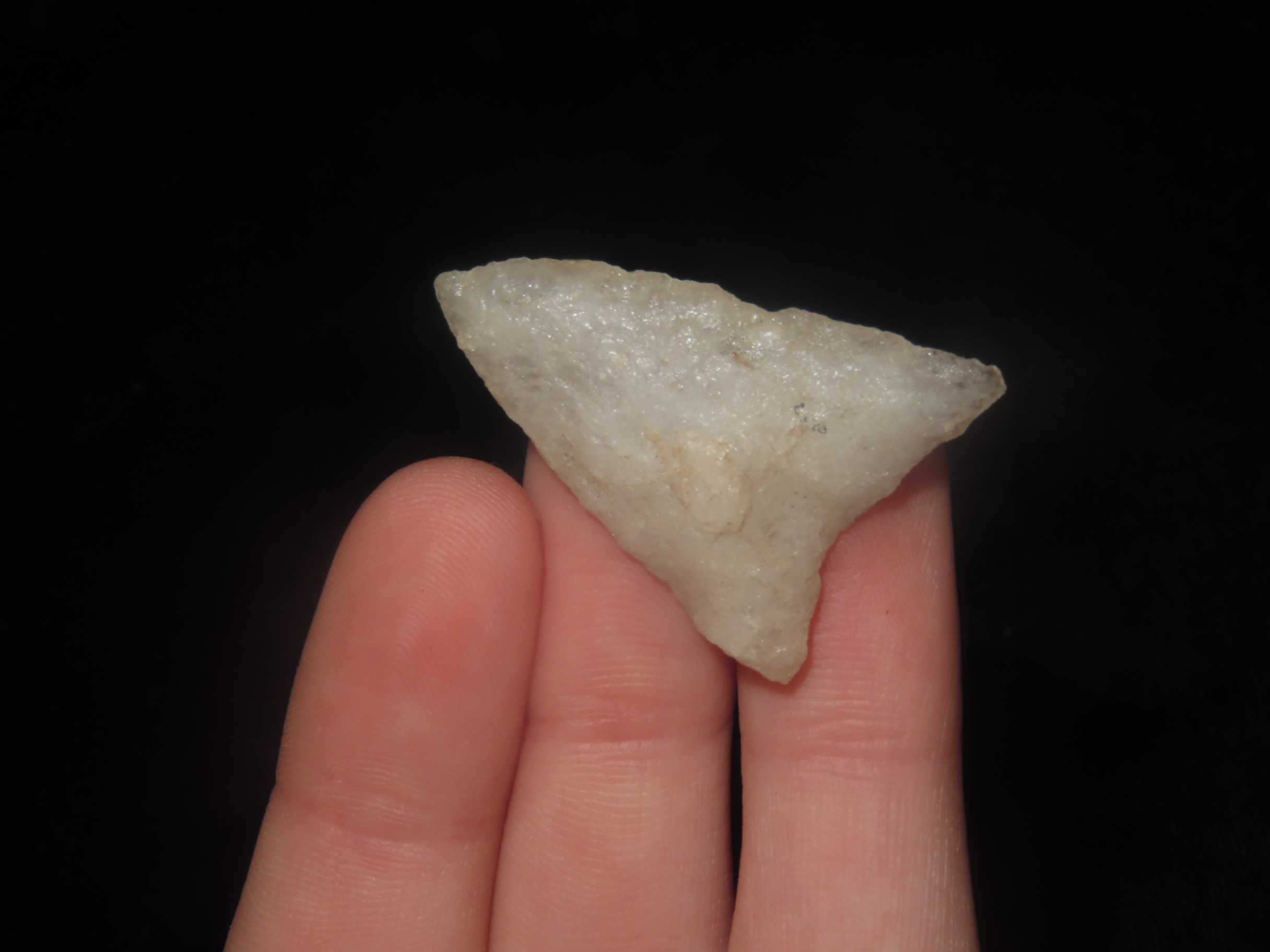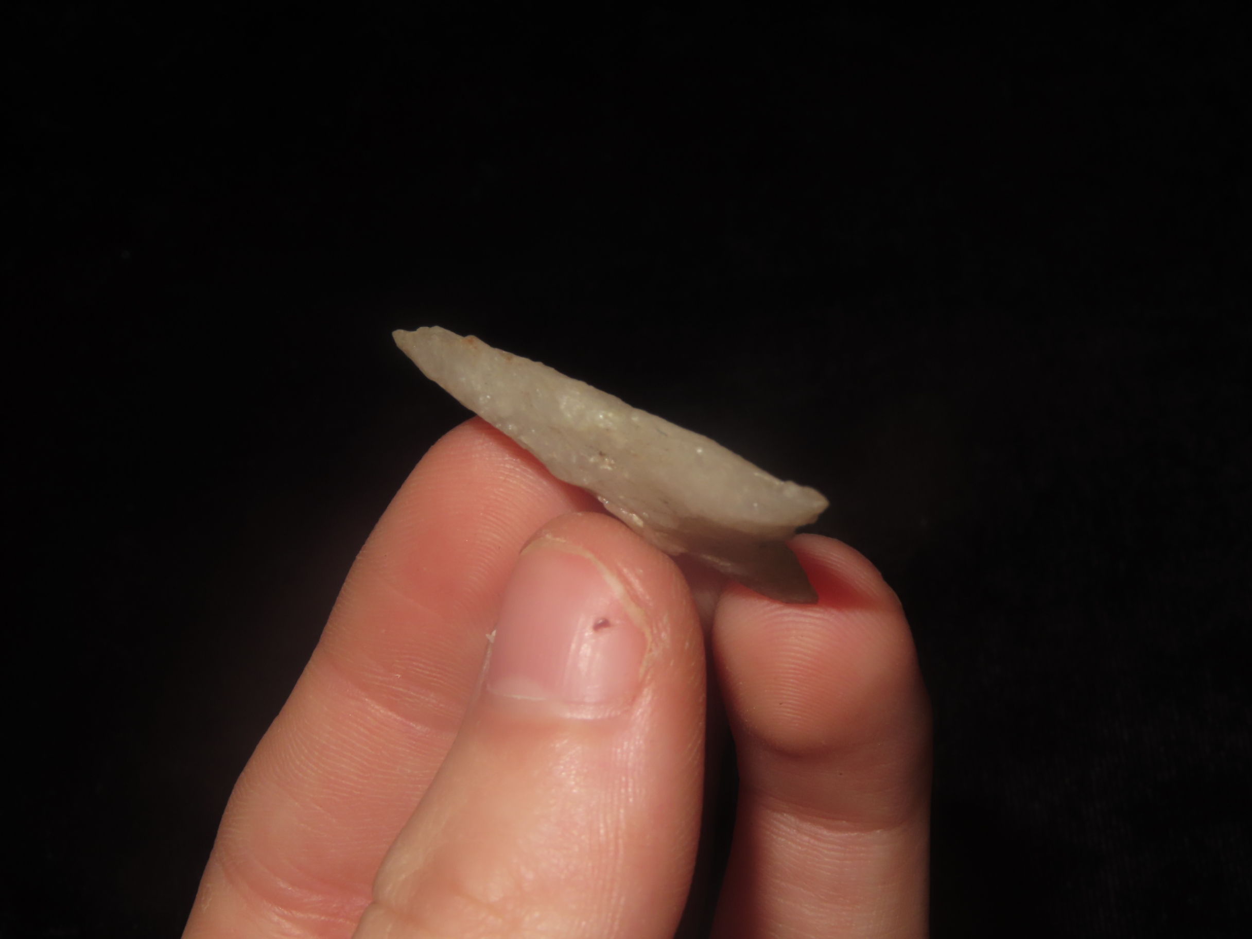 1 1/4″ x 5/8″ Late Paleo Crystal Quartz Alamance/Clovis, 12,000-10,000 BP, found at The Beaver Site on the Marvin Farm in Attleboro, Massachusetts. Ex Peter Engstrom, Ex Dr. Robbins Collections