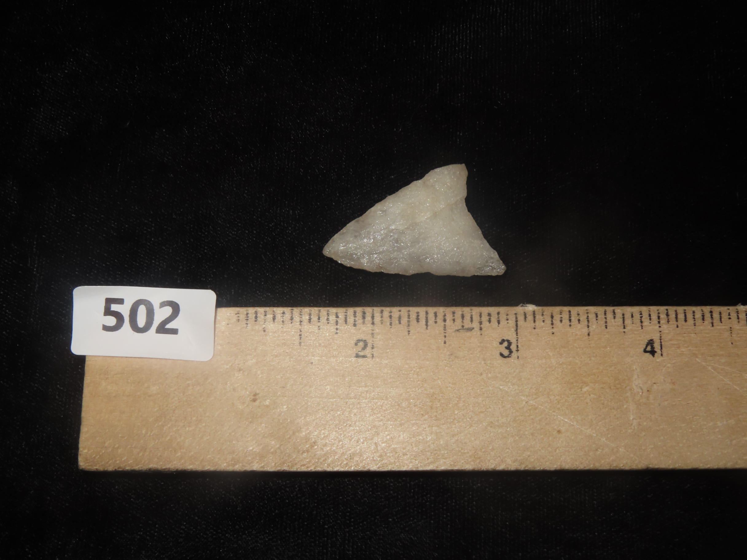 1 1/4" x 5/8" Late Paleo Crystal Quartz Alamance/Clovis, 12,000-10,000 BP, found at The Beaver Site on the Marvin Farm in Attleboro, Massachusetts. Ex Peter Engstrom, Ex Dr. Robbins Collections
