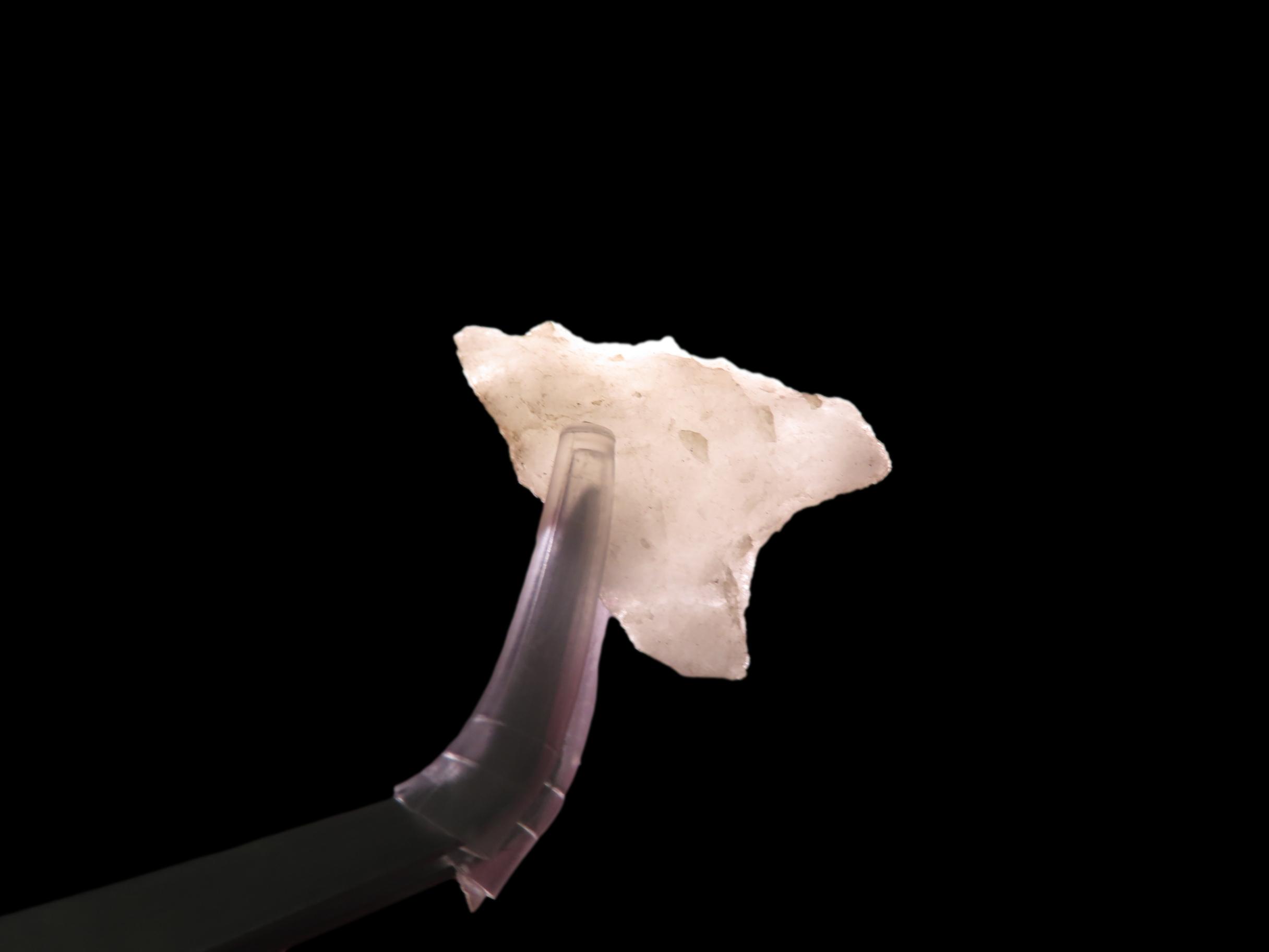 1 1/16″ x 3/4″ Late Paleo Crystal Quartz Alamance/Clovis, 12,000-10,000 BP, found at The Beaver Site on the Marvin Farm in Attleboro, Massachusetts. Ex Peter Engstrom, Ex Dr. Robbins Collections