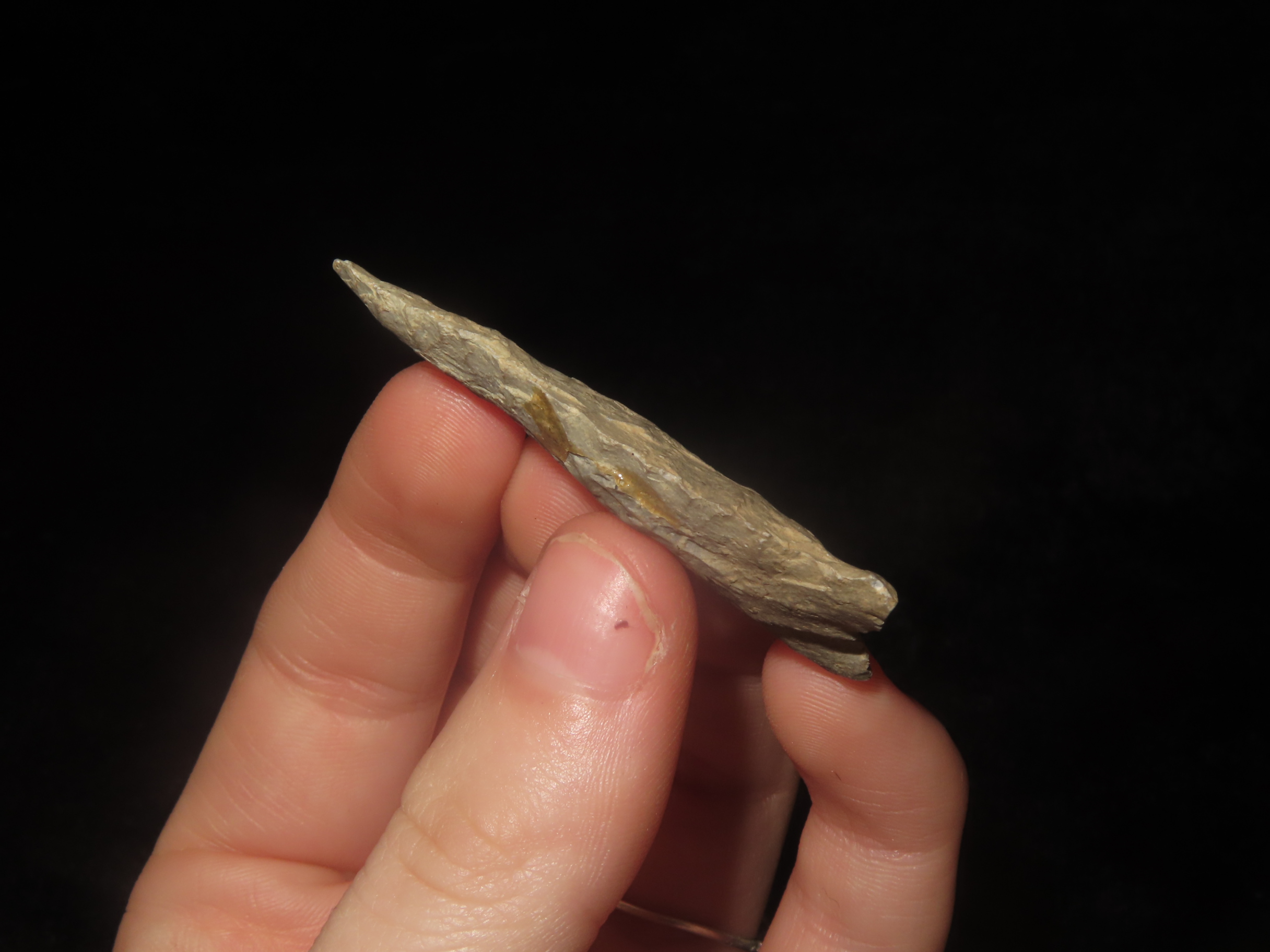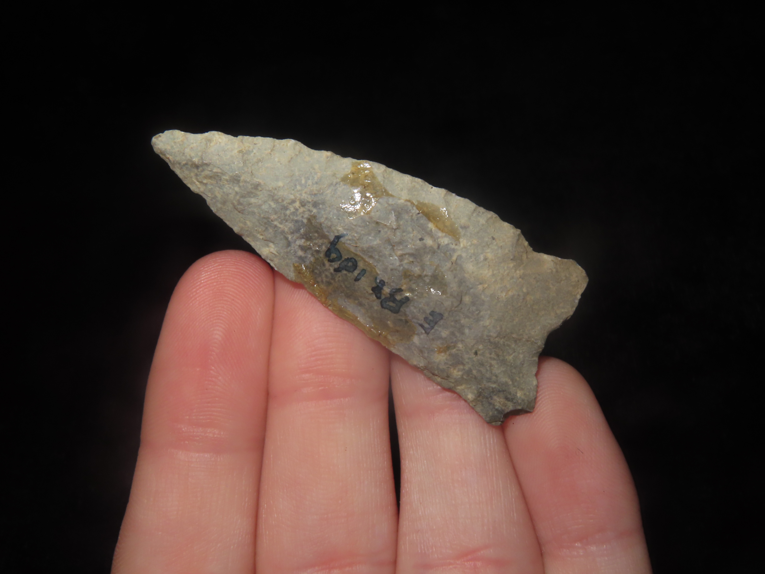 2″ x 3/4″ St. Albans Pt, Grey Rhyolite, found at The Beaver Site on the Marvin Farm in Attleboro, Massachusetts. Ex Peter Engstrom, Ex Dr. Robbins Collections
