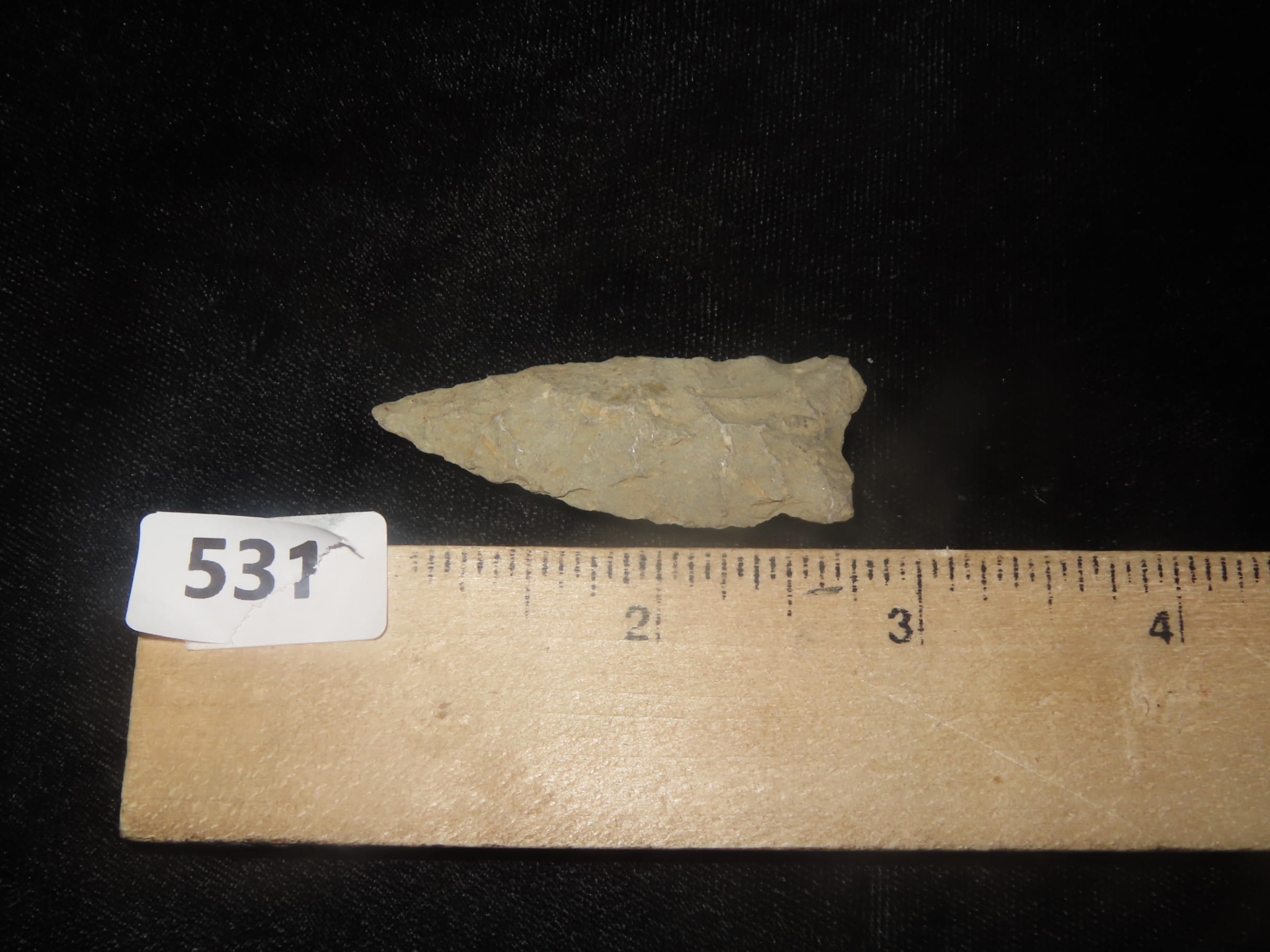 2" x 3/4" St. Albans Pt, Grey Rhyolite, found at The Beaver Site on the Marvin Farm in Attleboro, Massachusetts. Ex Peter Engstrom, Ex Dr. Robbins Collections