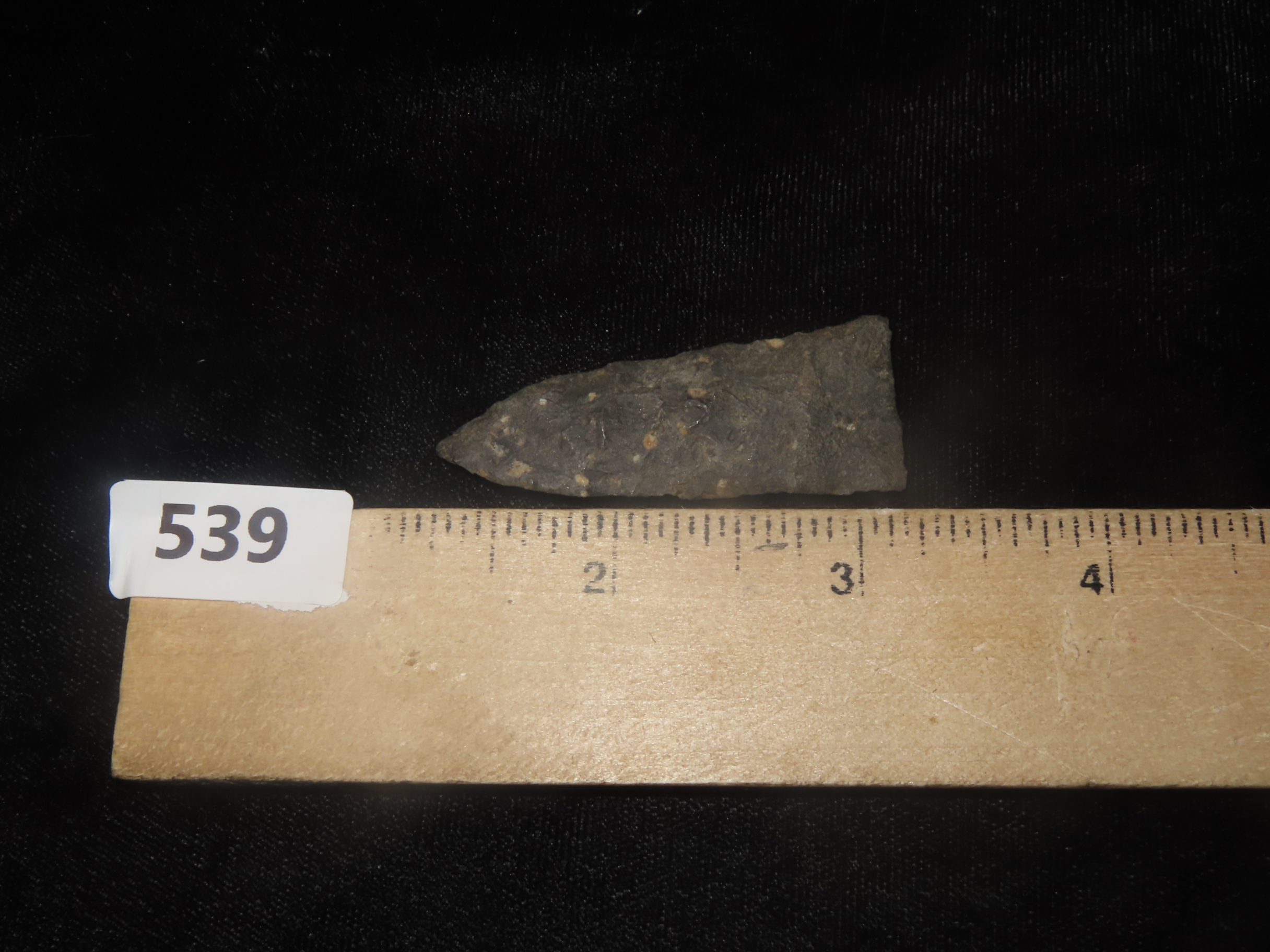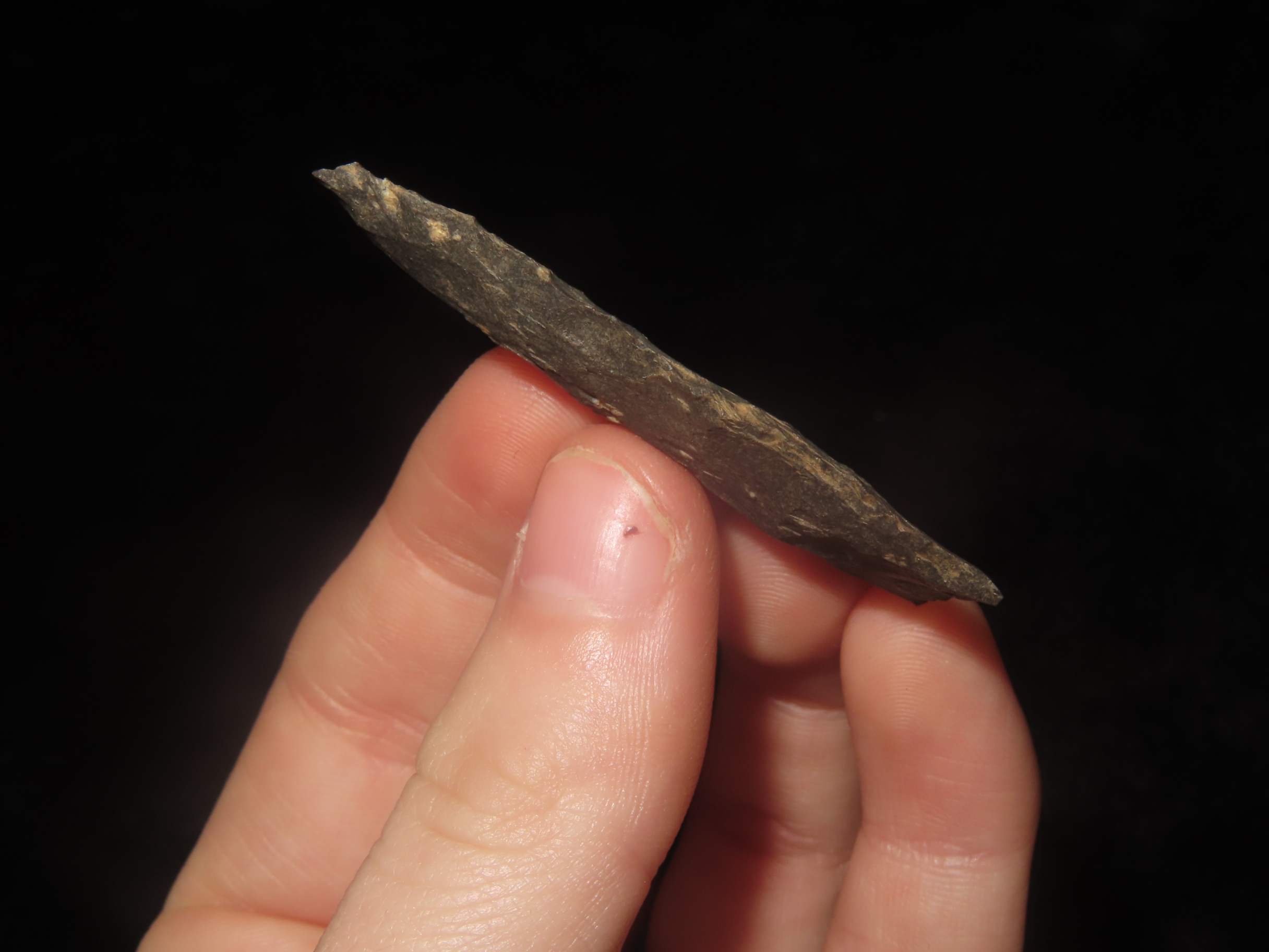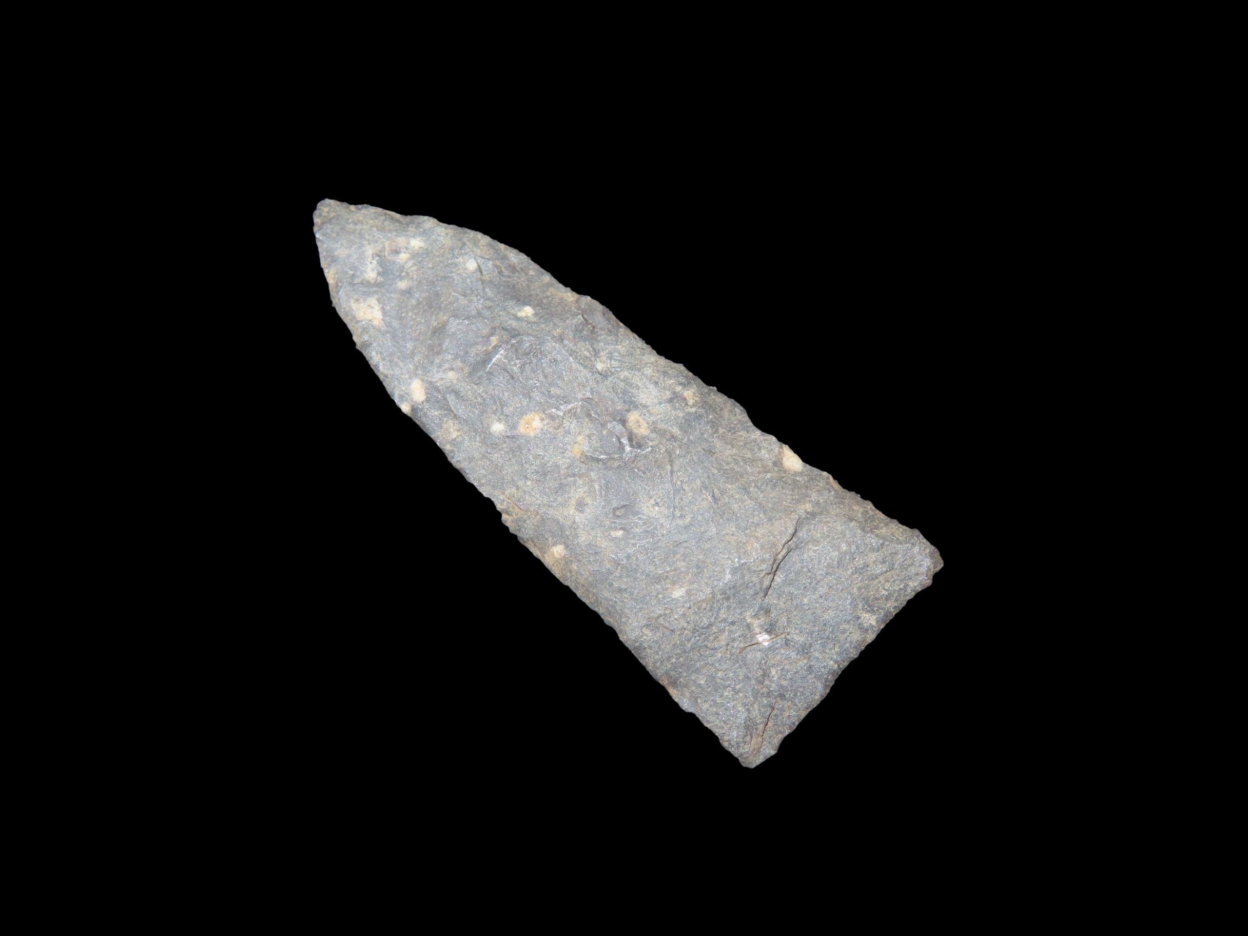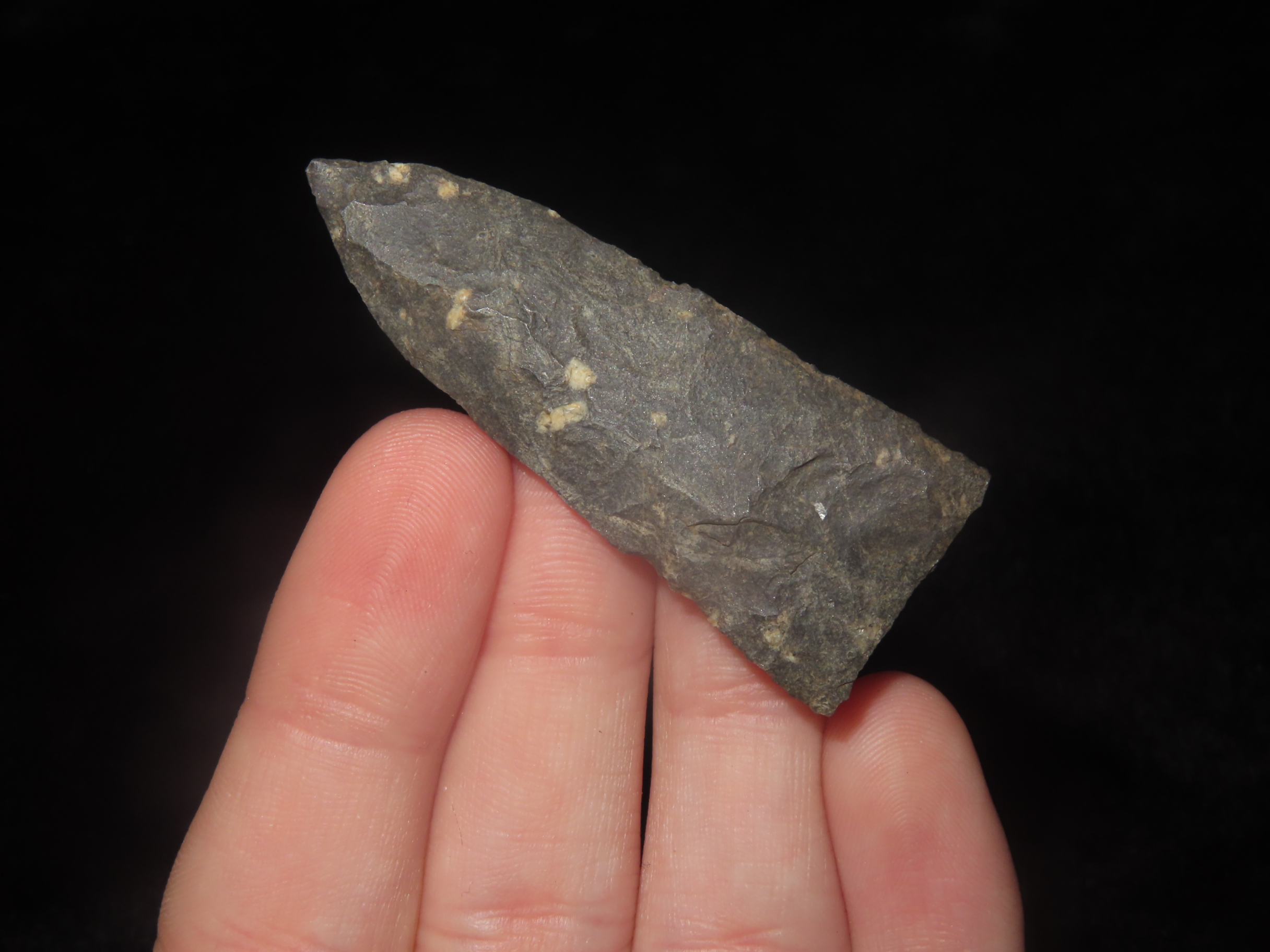 2" x 3/4" Clarksville, Dark Rhyolite, found at The Beaver Site on the Marvin Farm in Attleboro, Massachusetts. Ex Peter Engstrom, Ex Dr. Robbins Collections