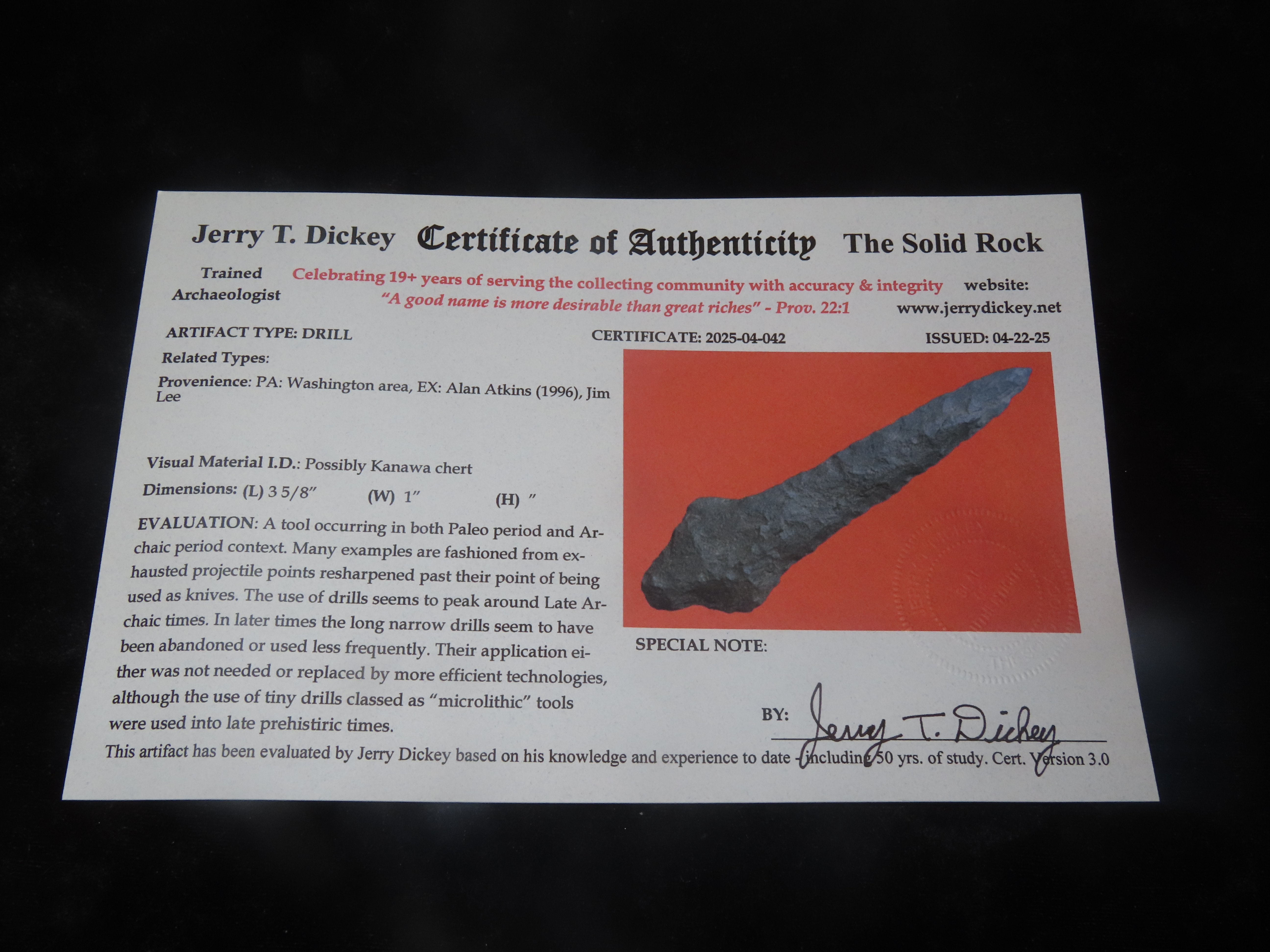 3 5/8″ x 1″ Drill, Dickey COA, found in Washington Co., Pennsylvania, Ex Alan Atkins, Ex Jim Lee Collections