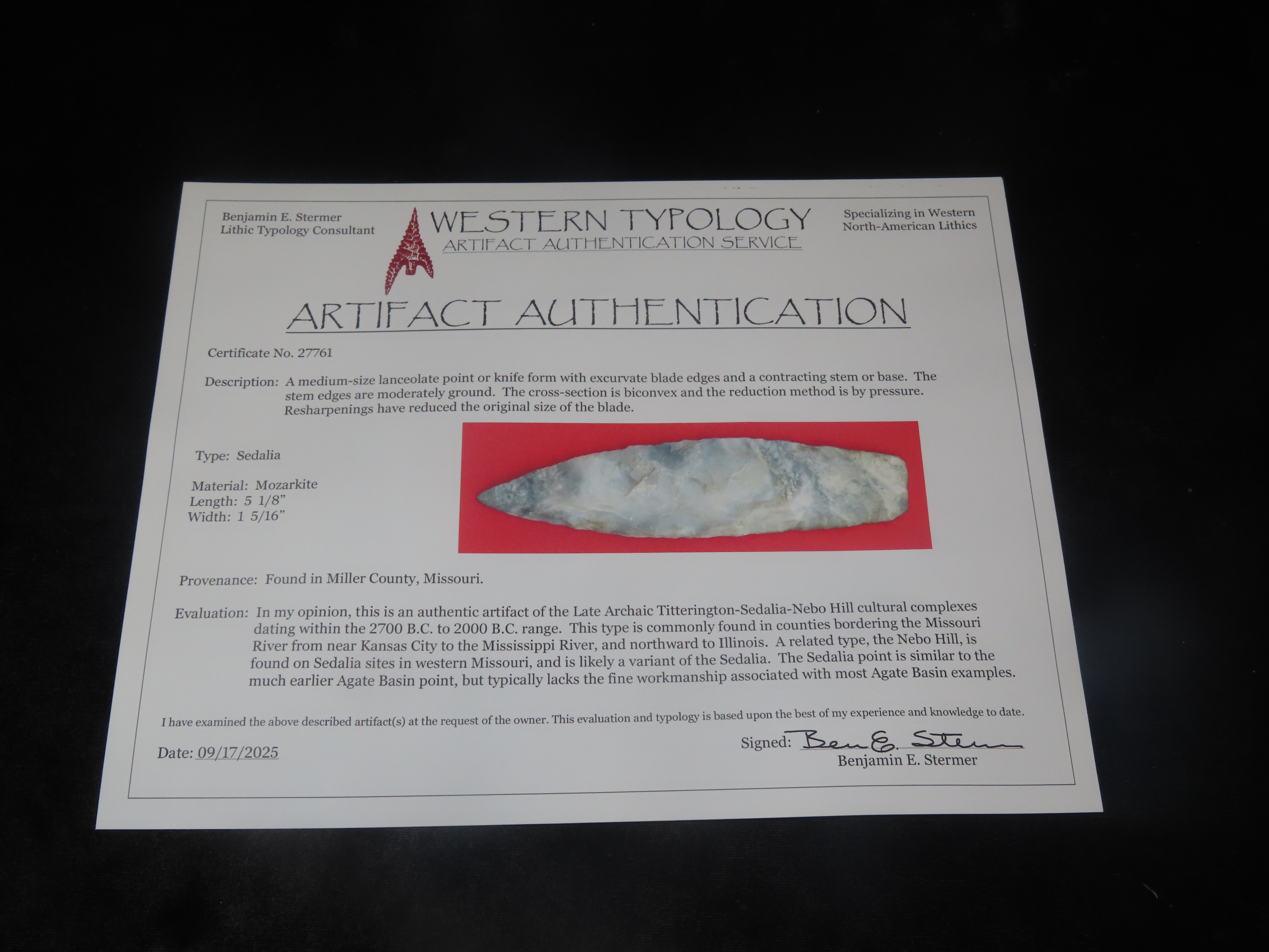 5 1/8″ x 1 5/16″ Mozarkite Sedalia, Stermer COA, found in Miller Co., Missouri