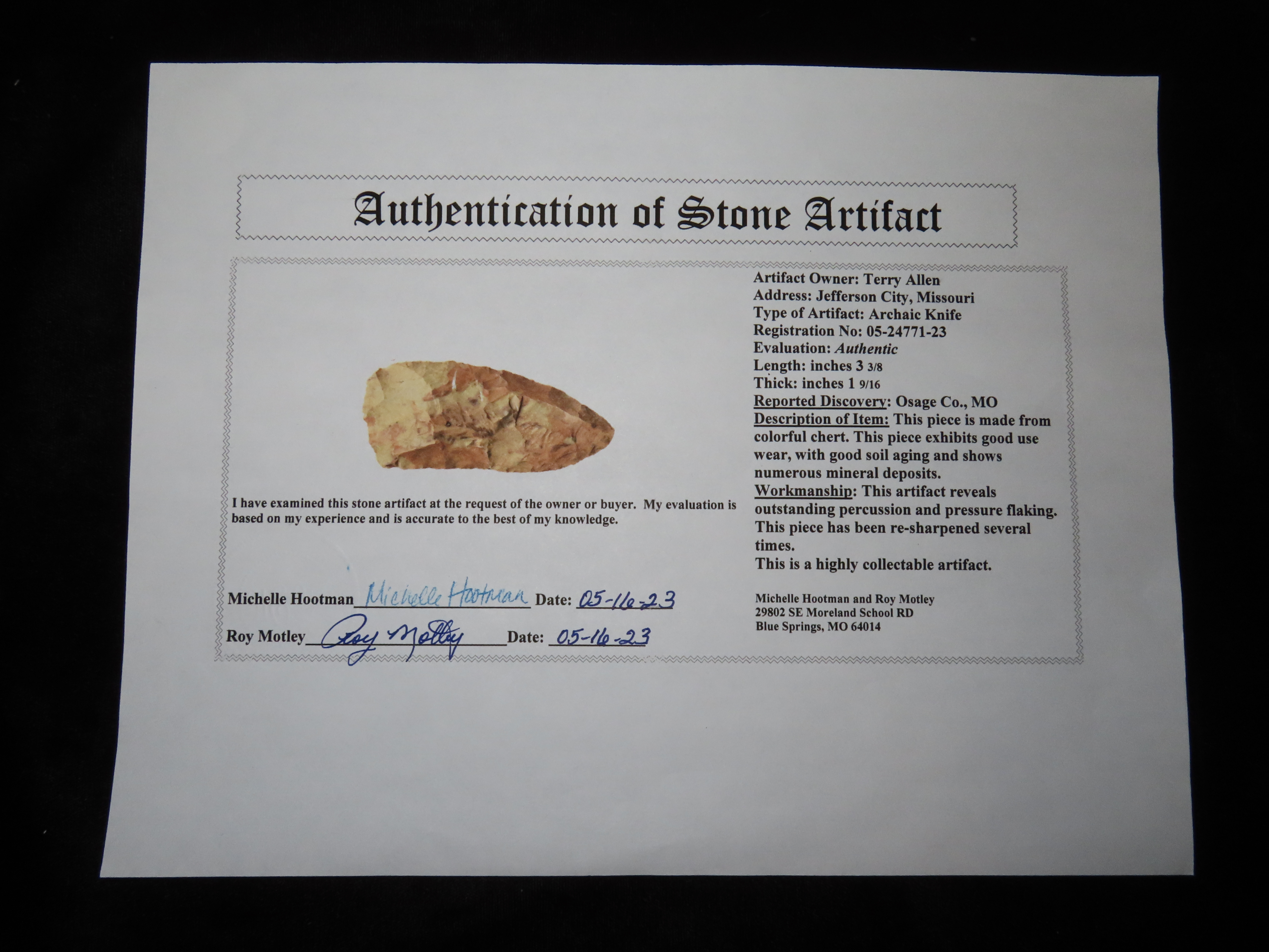 3 3/8″ x 1 9/16″ Archaic Knife, Motley COA, found in Osage Co., Missouri, Ex Terry Allen Collection