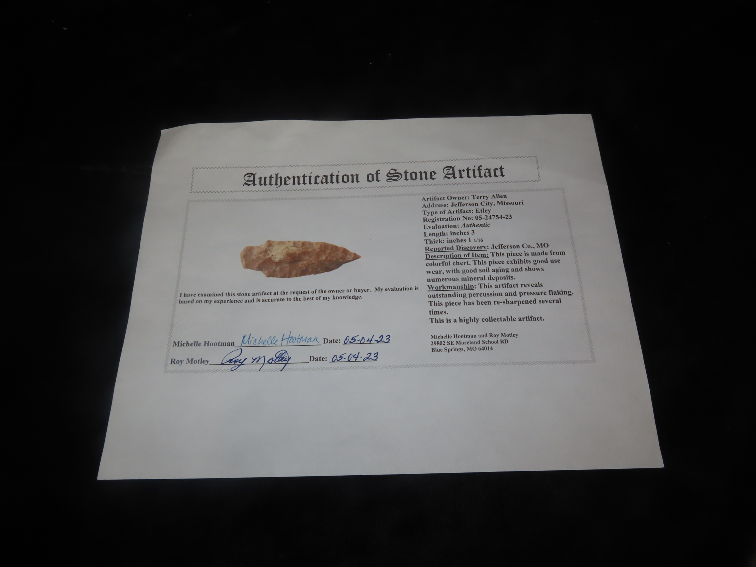 3″ x 1 1/16″ Etley, Motley COA, found in Jefferson Co., Missouri, Ex Terry Allen Collection