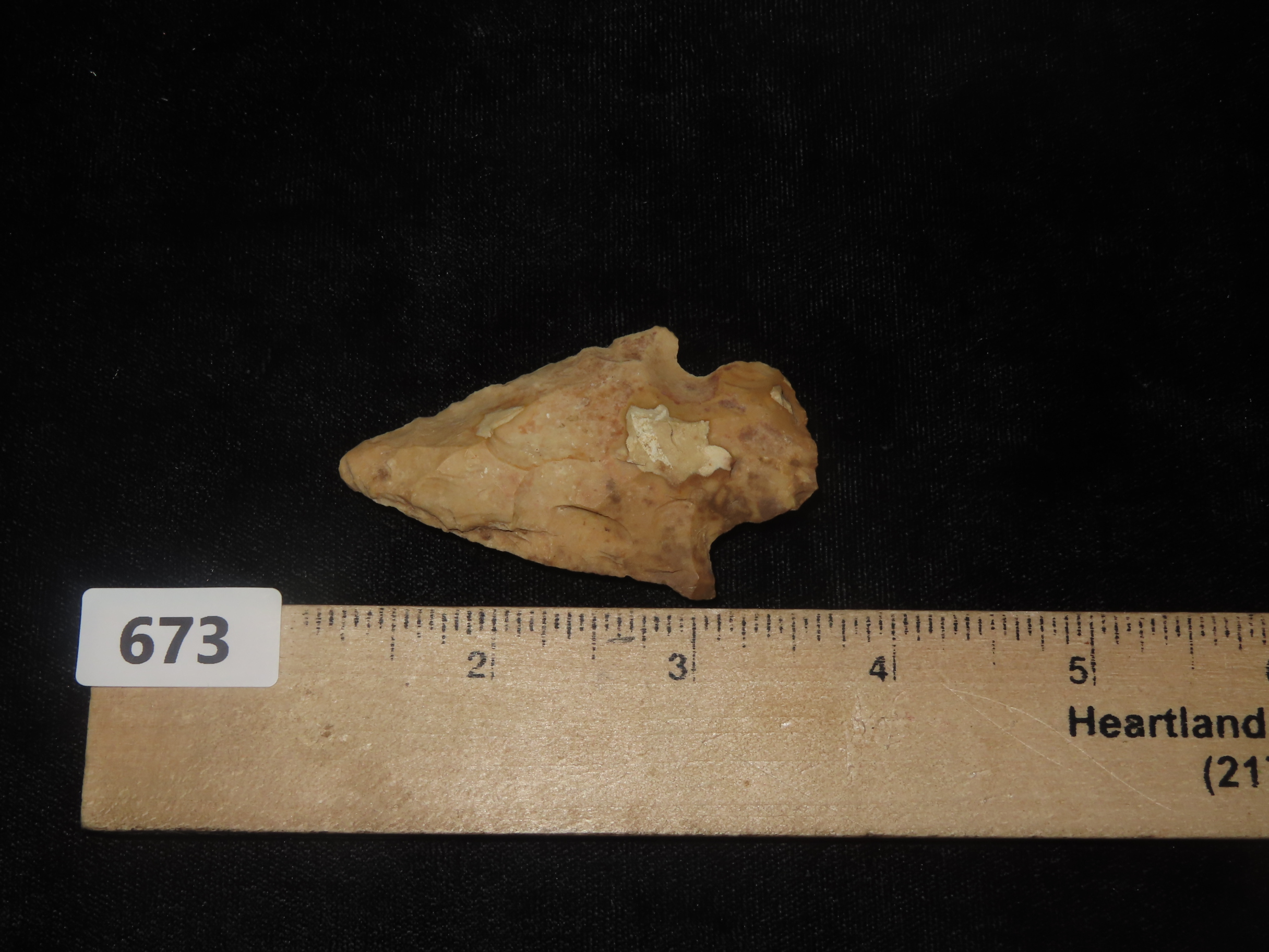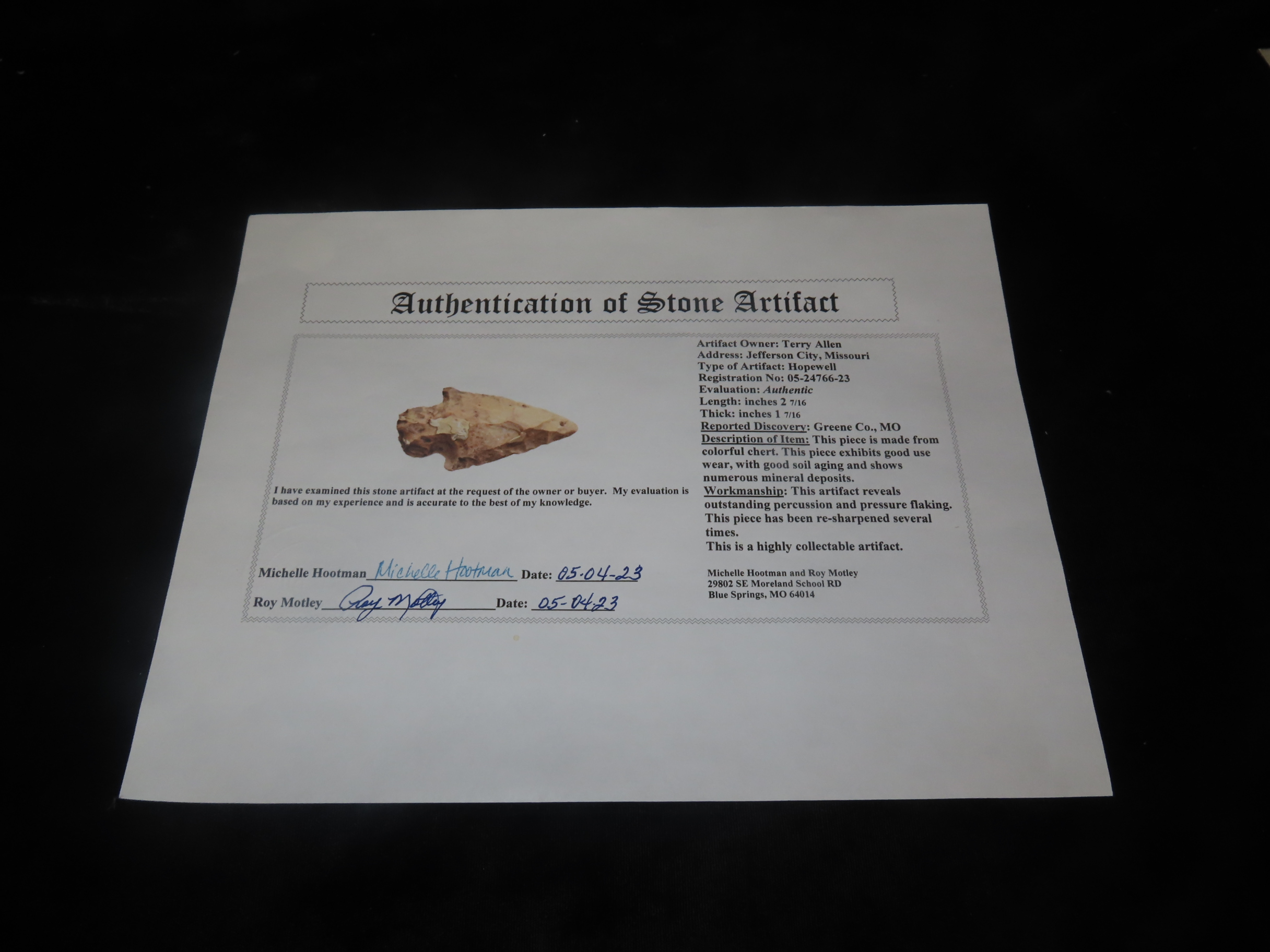 2 7/16″ x 1 7/16″ Hopewell, Motley COA, found in Greene Co., Missouri, Ex Terry Allen Collection