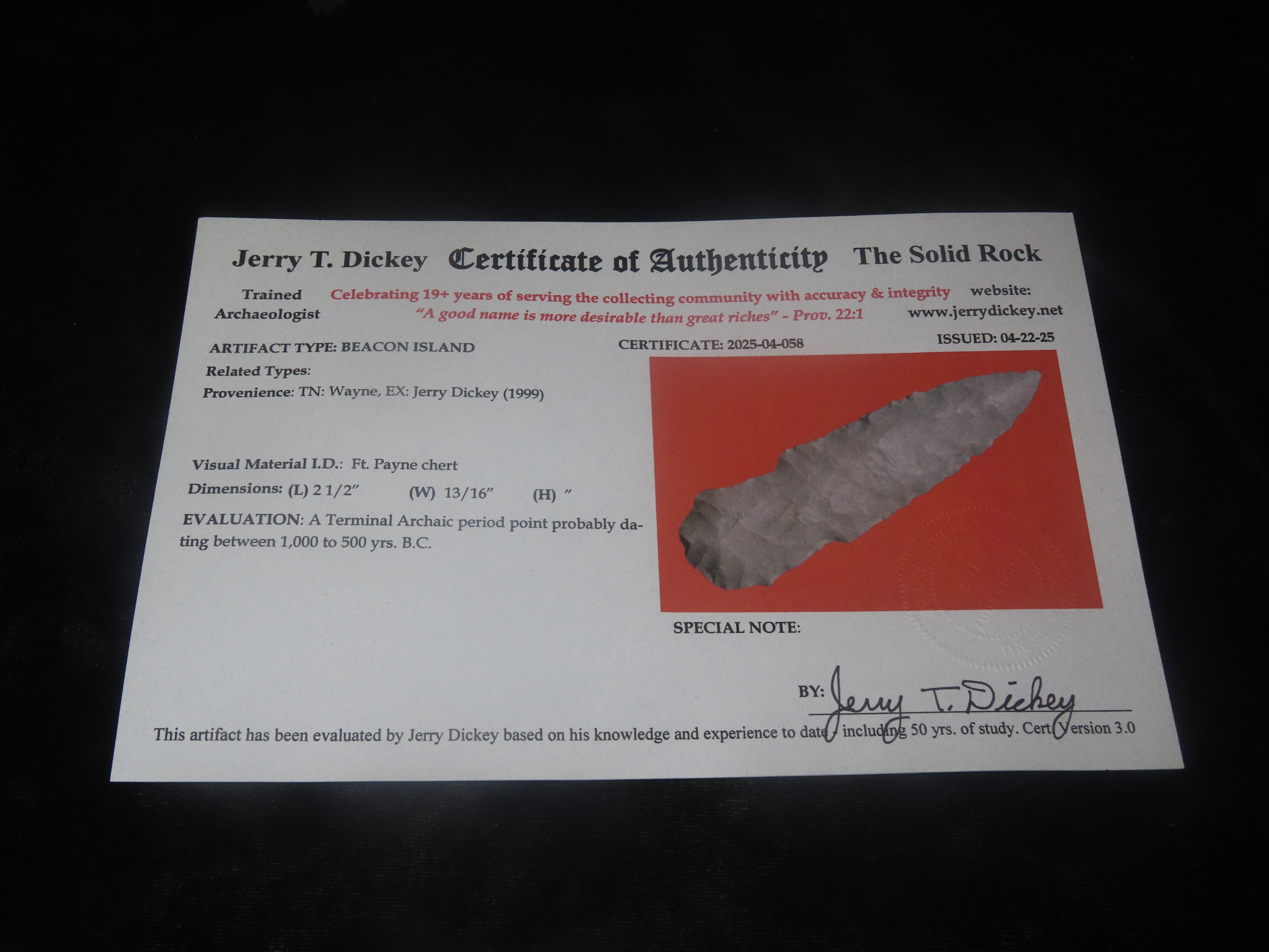 2 1/2″ X 13/16″ Beacon Island, Dickey COA, Found in Wayne Co. TN, Ex Jerry Dickey (1999), Ex Jim Lee