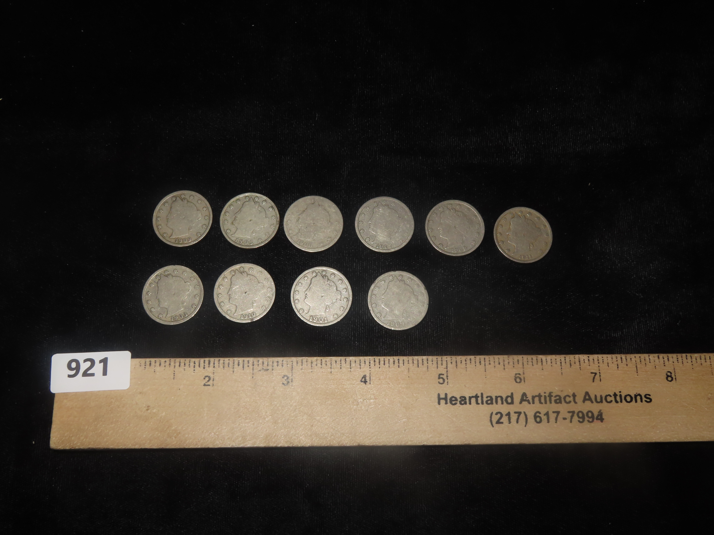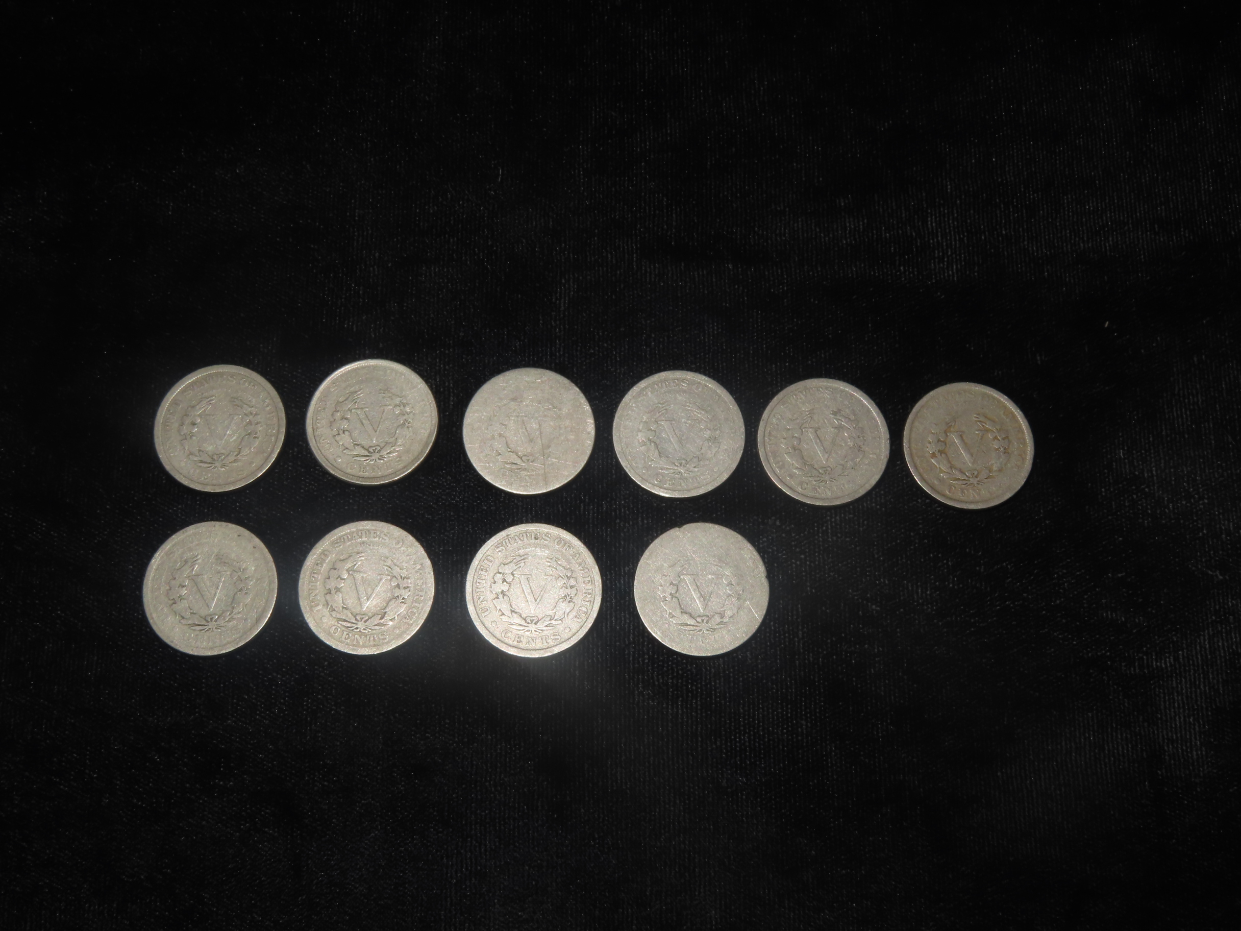 Lot of 10 Late 1800’s to Early 1900’s Silver “V” Nickels, US Currency