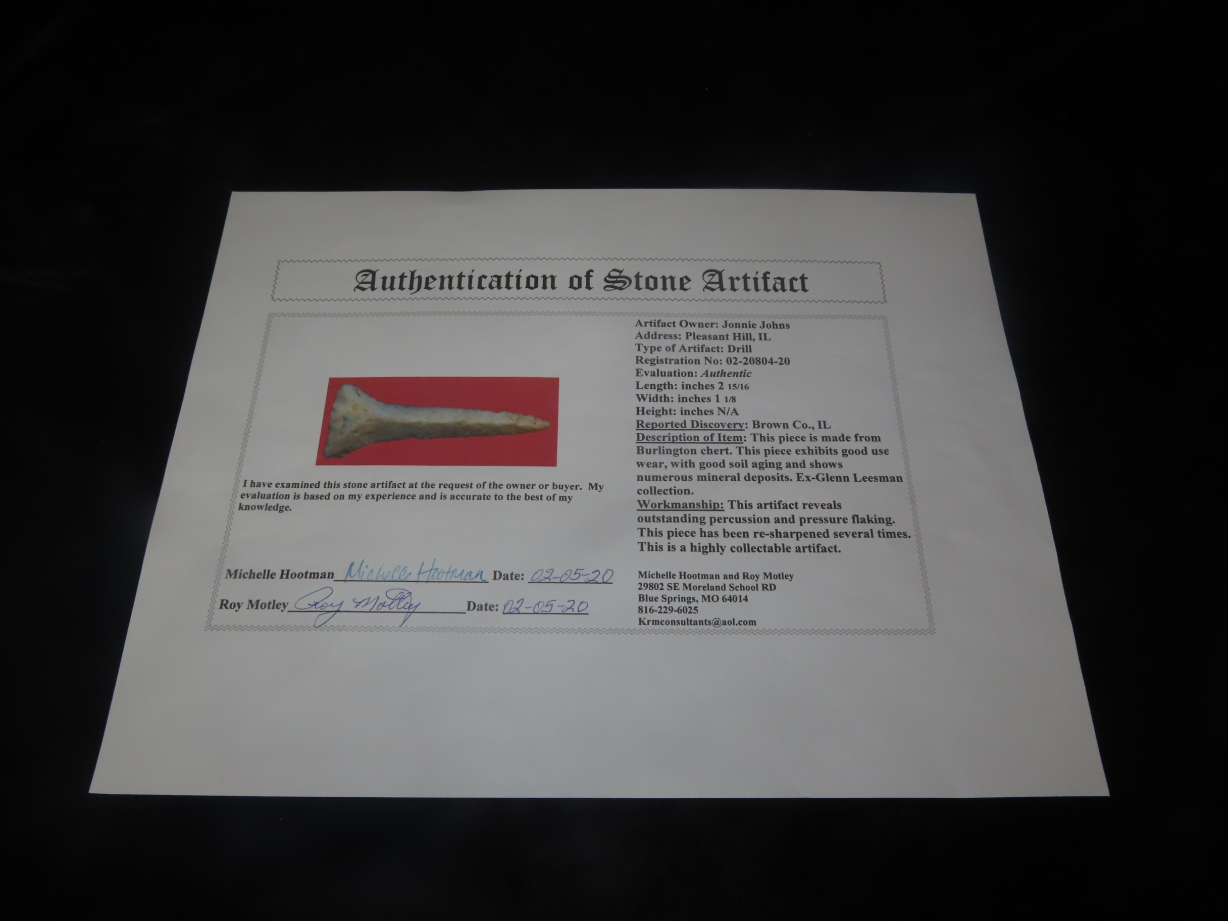 2 15/16″ X 1 1/8″ Drill, Motley COA, Found in Brown County IL., Ex Herb Mangold Collection