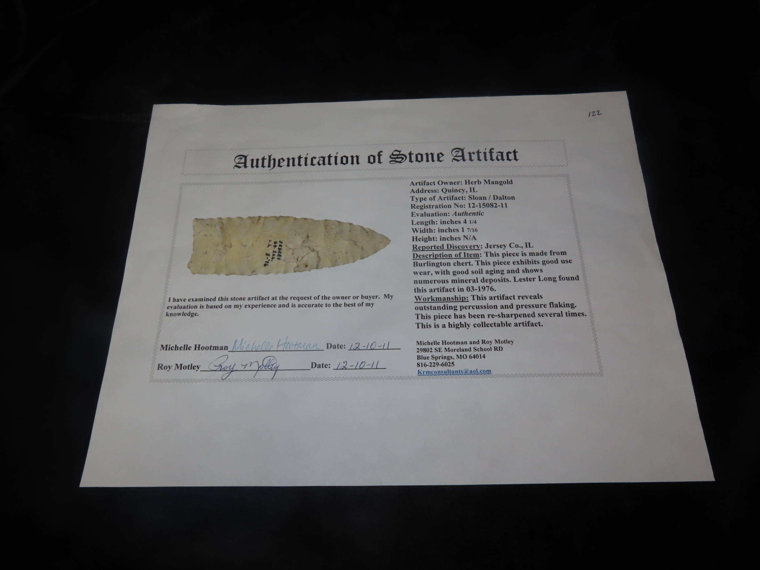 4 1/4″ X 1 7/16″ Sloan/ Dalton, Motley COA, Found in Jersey County IL., Ex Herb Mangold Collection