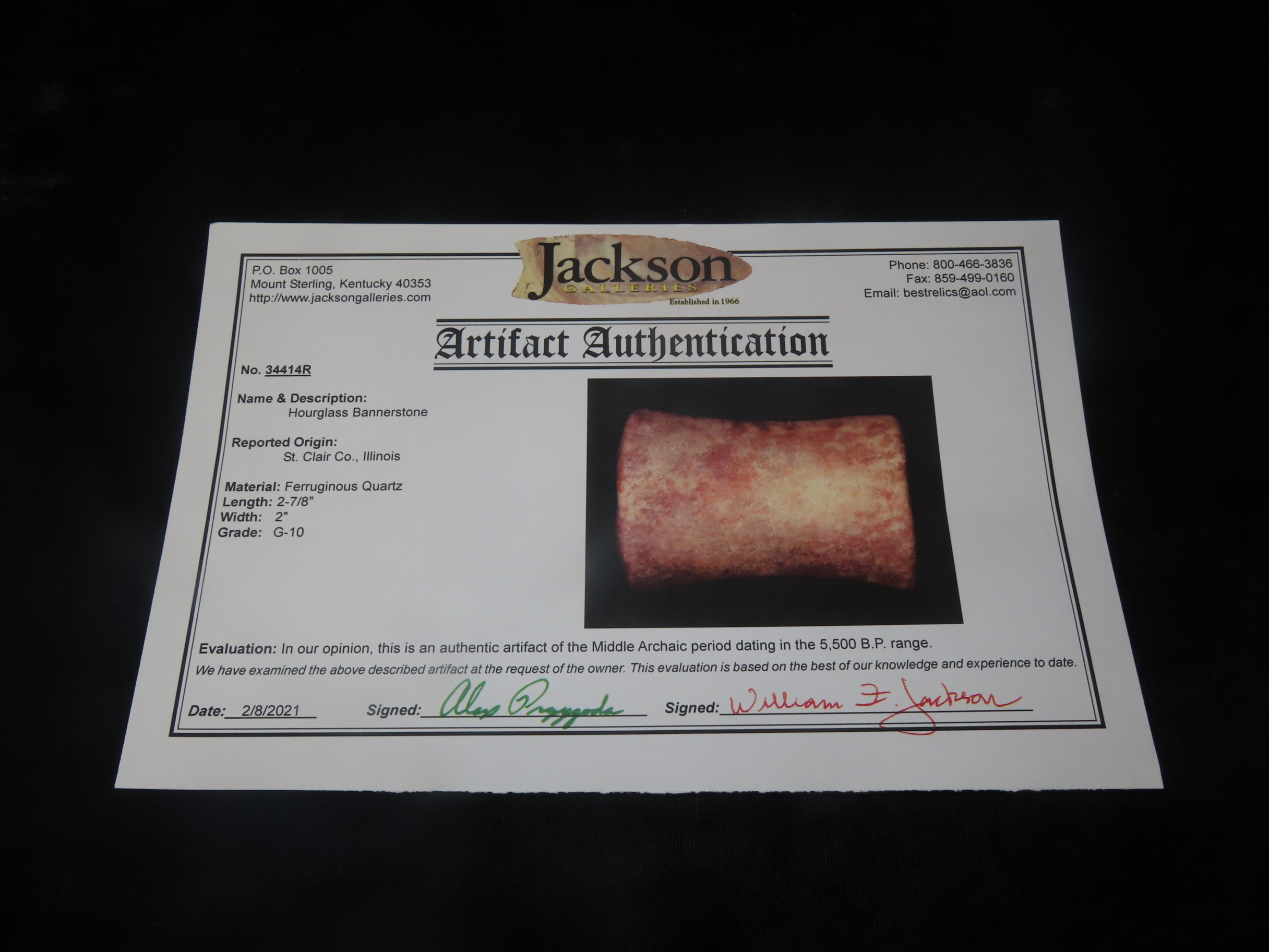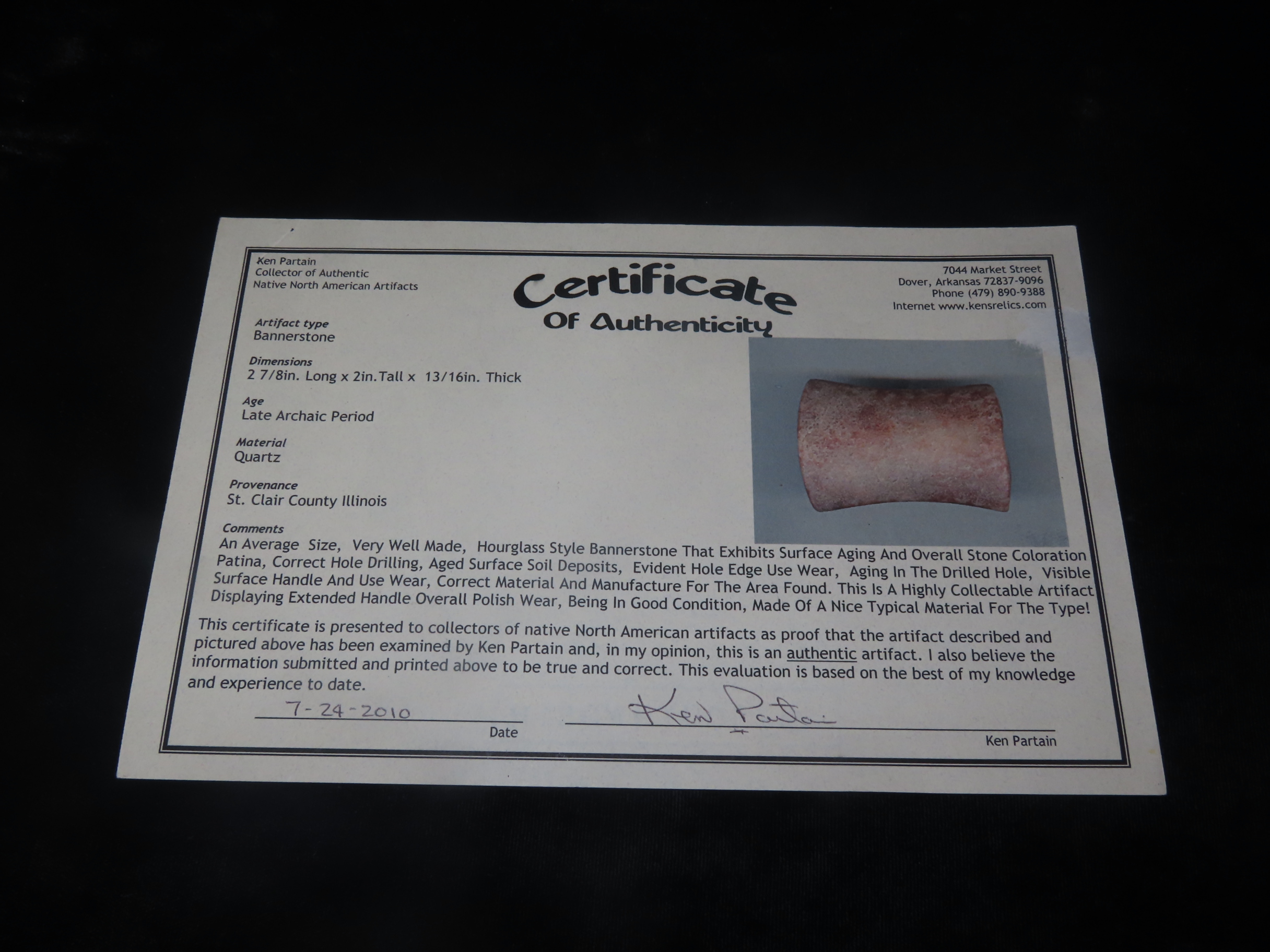 2 7/8" X 2" X 13/16" Hourglass Bannerstone, Partain COA, Jackson COA, Found in St. Clair County IL.